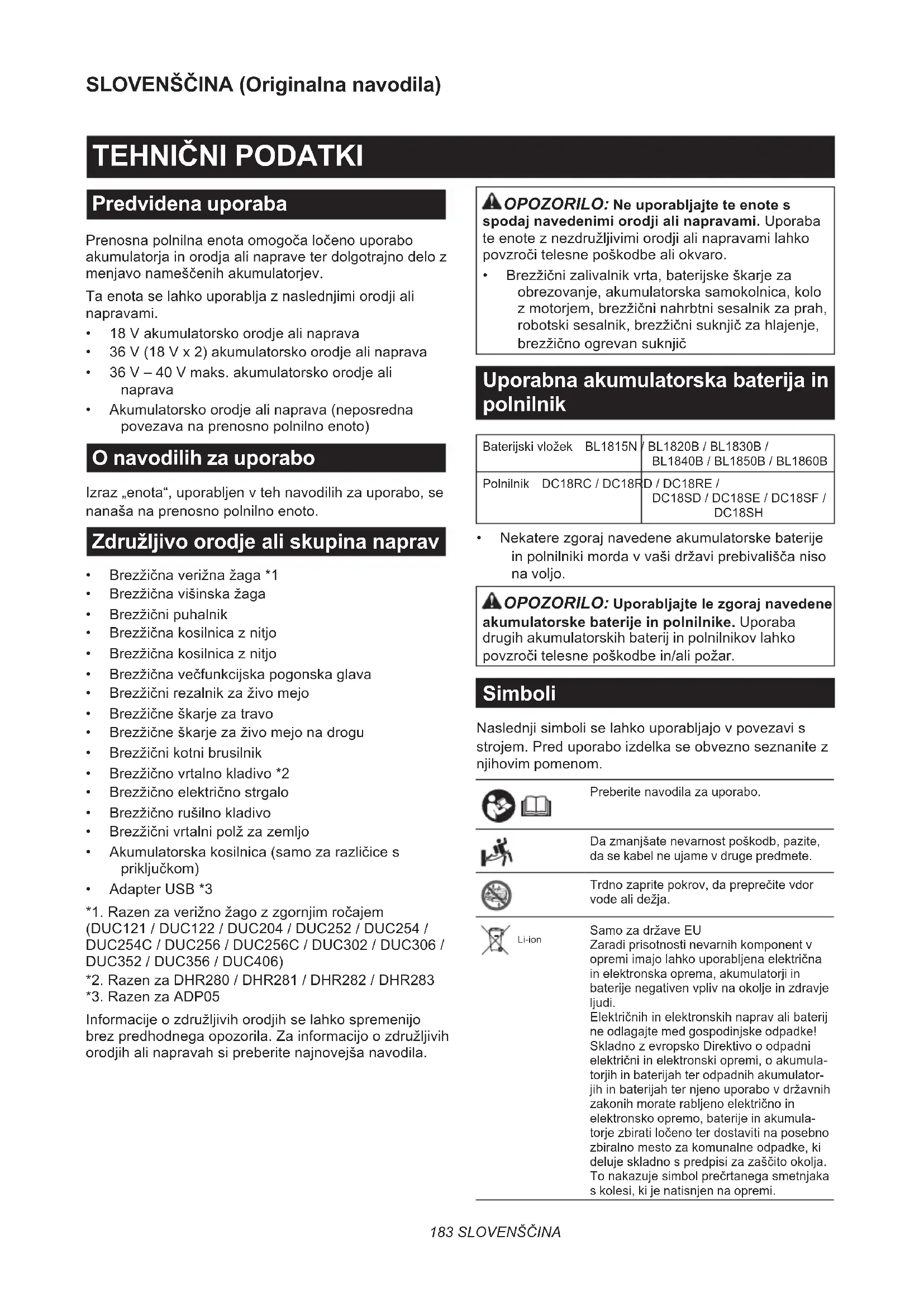 - Nekaterezgorajnavedeneakumulatorskebaterije inpolnilnikimordavvašidržaviprebivališčaniso na voljo. OPOZORILO: Uporabljajte le zgoraj navedene akumulatorske baterije in polnilnike.Uporaba drugih akumulatorskih baterij in polnilnikov lahko povzročitelesnepoškodbein/alipožar. Simboli Naslednjisimboliselahkouporabljajovpovezavis strojem.Preduporaboizdelkaseobveznoseznanitez njihovim pomenom. Preberitenavodilazauporabo. Dazmanjšatenevarnostpoškodb,pazite, da se kabel ne ujame v druge predmete. Trdnozapritepokrov,dapreprečitevdor vodealidežja. Li-ion SamozadržaveEU Zaradi prisotnosti nevarnih komponent v opremiimajolahkouporabljenaelektrična in elektronska oprema, akumulatorji in baterijenegativenvplivnaokoljeinzdravje ljudi. Električnihinelektronskihnapravalibaterij ne odlagajte med gospodinjske odpadke! SkladnozevropskoDirektivooodpadni električniinelektronskiopremi,oakumula- torjih in baterijah ter odpadnih akumulator- jihinbaterijahternjenouporabovdržavnih zakonihmoraterabljenoelektričnoin elektronsko opremo, baterije in akumula- torjezbiratiločenoterdostavitinaposebno zbiralnomestozakomunalneodpadke,ki delujeskladnospredpisizazaščitookolja. Tonakazujesimbolprečrtanegasmetnjaka s kolesi, ki je natisnjen na opremi.184 SLOVENŠČINA VARNOSTNA OPOZORILA Varnostna opozorila za prenosno polnilno enoto