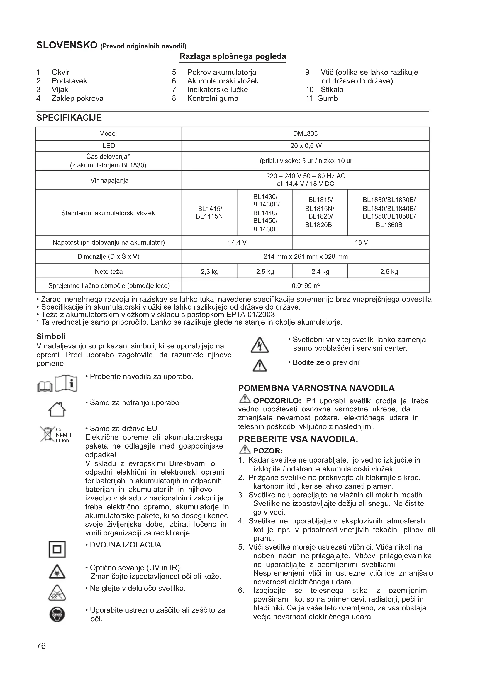 površinami, kot so na primer cevi, radiatorji, peči in hladilniki. Če je vaše telo ozemljeno, za vas obstaja večja nevarnost električnega udara. Model DML805 LED 20 x 0,6 W Čas delovanja* (z akumulatorjem BL1830) (pribl.) visoko: 5 ur / nizko: 10 ur Vir napajanja 220 – 240 V 50 – 60 Hz AC ali 14,4 V / 18 V DC Standardni akumulatorski vložek BL1415/ BL1415N BL1430/ BL1430B/ BL1440/ BL1450/ BL1460B BL1815/ BL1815N/ BL1820/ BL1820B BL1830/BL1830B/ BL1840/BL1840B/ BL1850/BL1850B/ BL1860B Napetost (pri delovanju na akumulator) 14,4 V 18 V Dimenzije (D x Š x V) 214 mm x 261 mm x 328 mm Neto teža 2,3 kg 2,5 kg 2,4 kg 2,6 kg Sprejemno tlačno območje (območje leče) 0,0195 m