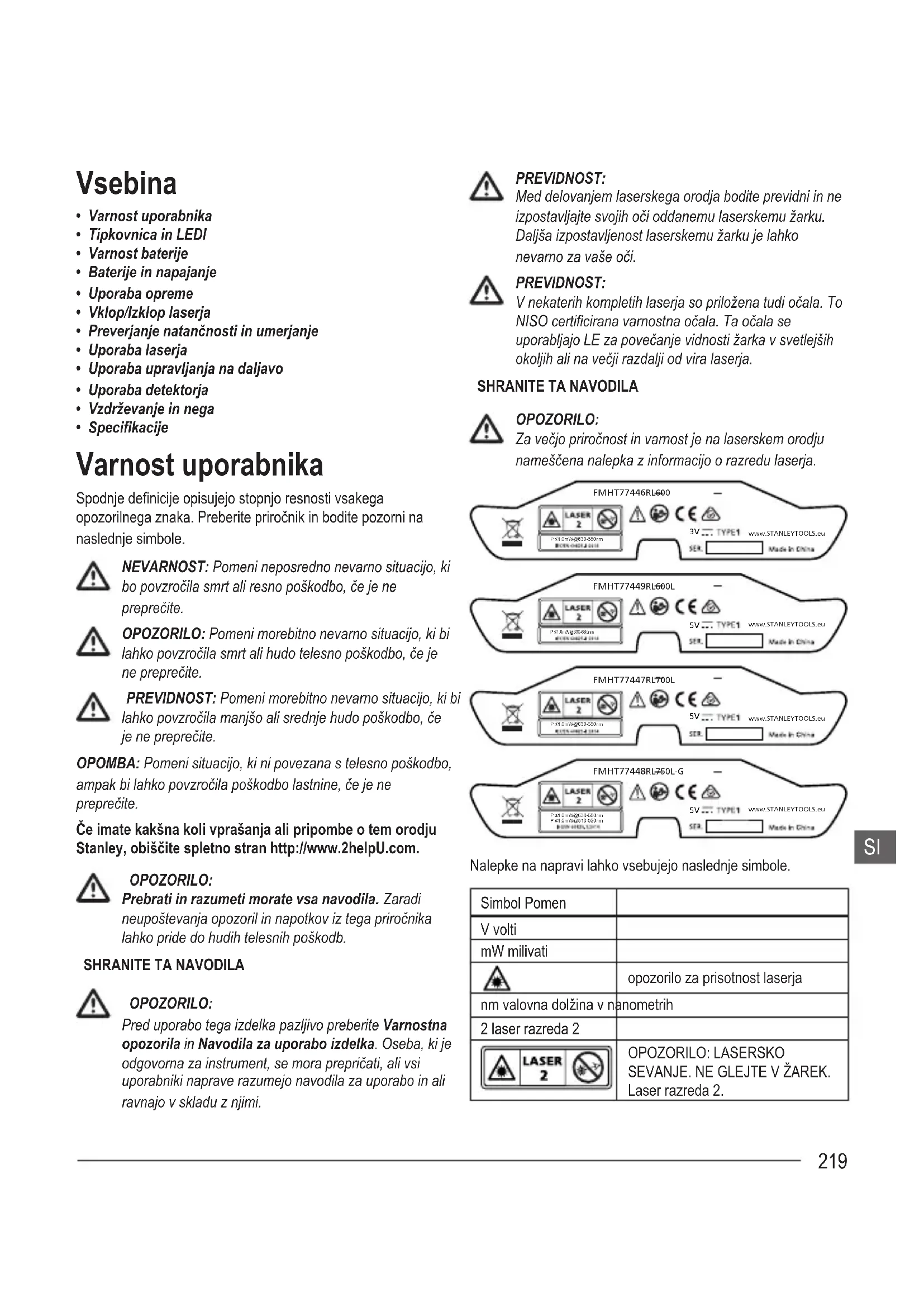 - Preverjanje umerjenosti in ostala vzdrževalna popravila lahko opravijo servisni centri STANLEY.229