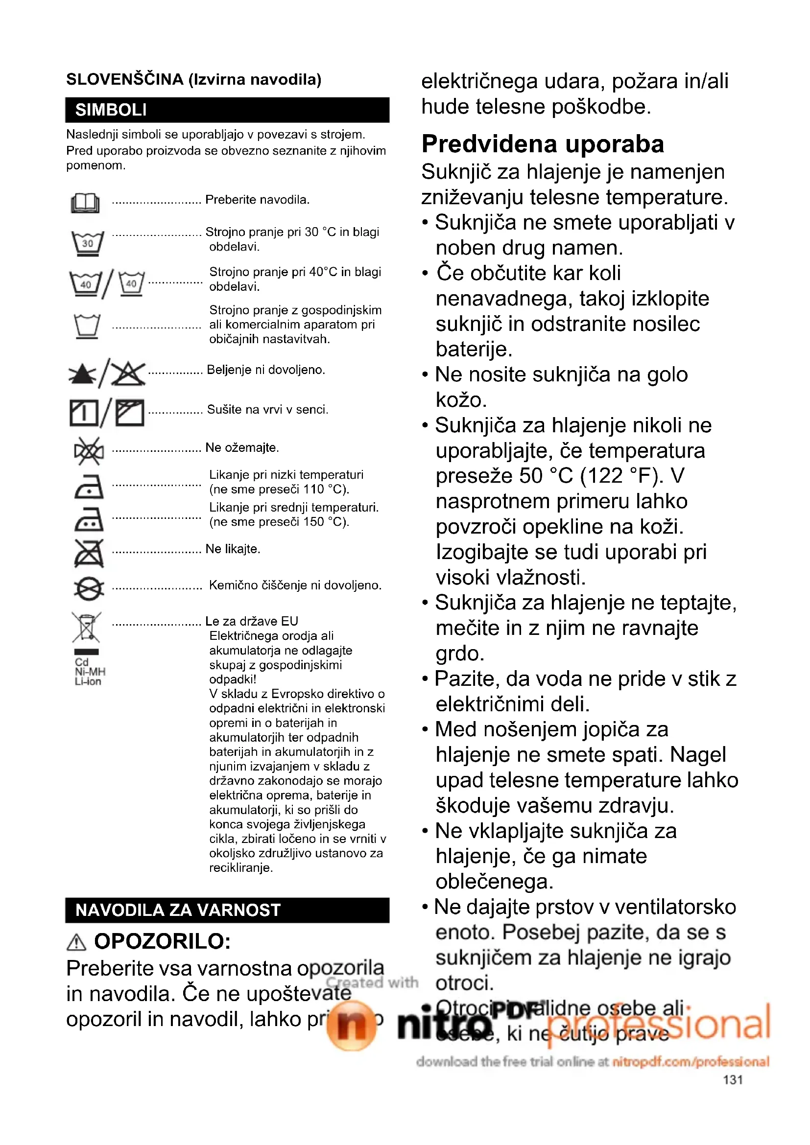 SLOVENŠČINA (Izvirna navodila) Naslednji simboli se uporabljajo v povezavi s strojem. Pred uporabo proizvoda se obvezno seznanite z njihovim pomenom. OPOZORILO: Preberite vsa varnostna opozorila in navodila. Če ne upoštevate opozoril in navodil, lahko pride do električnega udara, požara in/ali hude telesne poškodbe. Predvidena uporaba Suknjič za hlajenje je namenjen zniževanju telesne temperature.