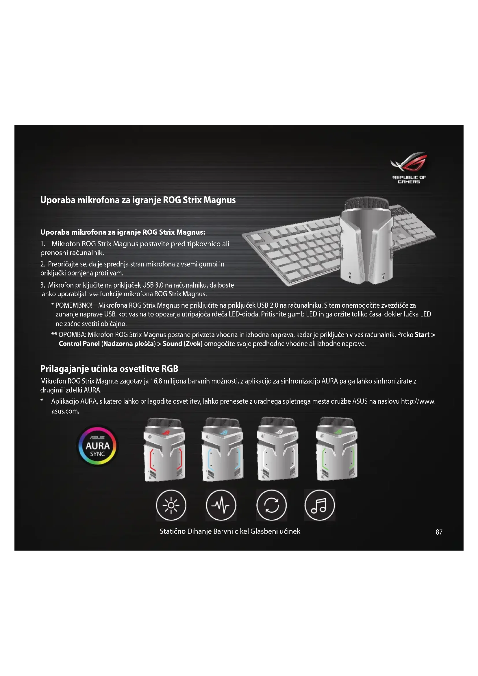 - Aplikacijo AURA, s katero lahko prilagodite osvetlitev, lahko prenesete z uradnega spletnega mesta družbe ASUS na naslovu http://www. asus.com. Statično Dihanje Barvni cikel Glasbeni učinek8888 Spoznavanje mikrofona za igranje ROG Strix Magnus Omogoča priključitev na prenosne naprave, glasbeni inštrument ali predvajalnik s 3,5-milimetrskim zvočnim kablom.