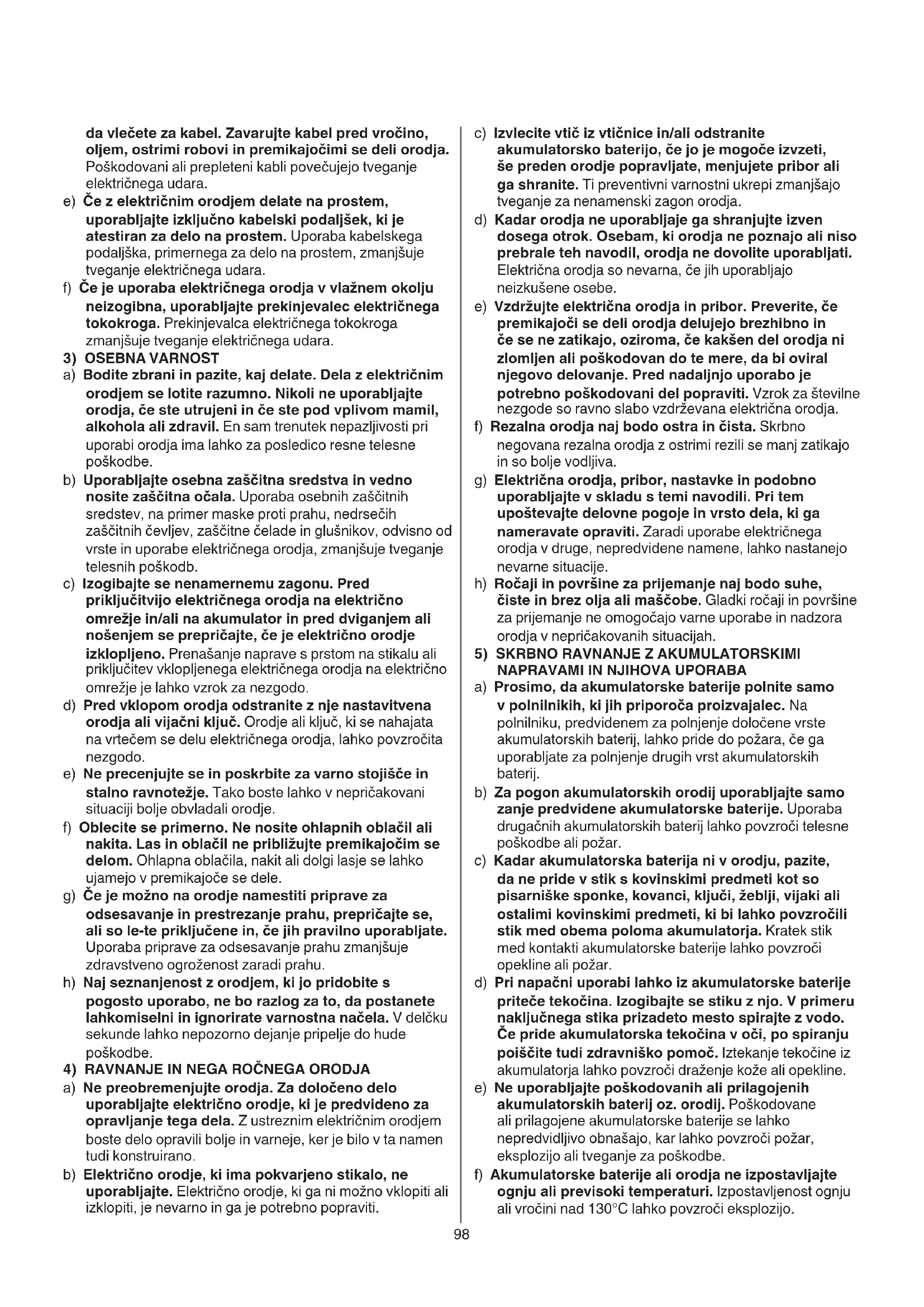 a) Ne preobremenjujte orodja. Za določeno delo uporabljajte električno orodje, ki je predvideno za opravljanje tega dela. Z ustreznim električnim orodjem boste delo opravili bolje in varneje, ker je bilo v ta namen tudi konstruirano. b) Električno orodje, ki ima pokvarjeno stikalo, ne uporabljajte. Električno orodje, ki ga ni možno vklopiti ali izklopiti, je nevarno in ga je potrebno popraviti.99 PRIBOR