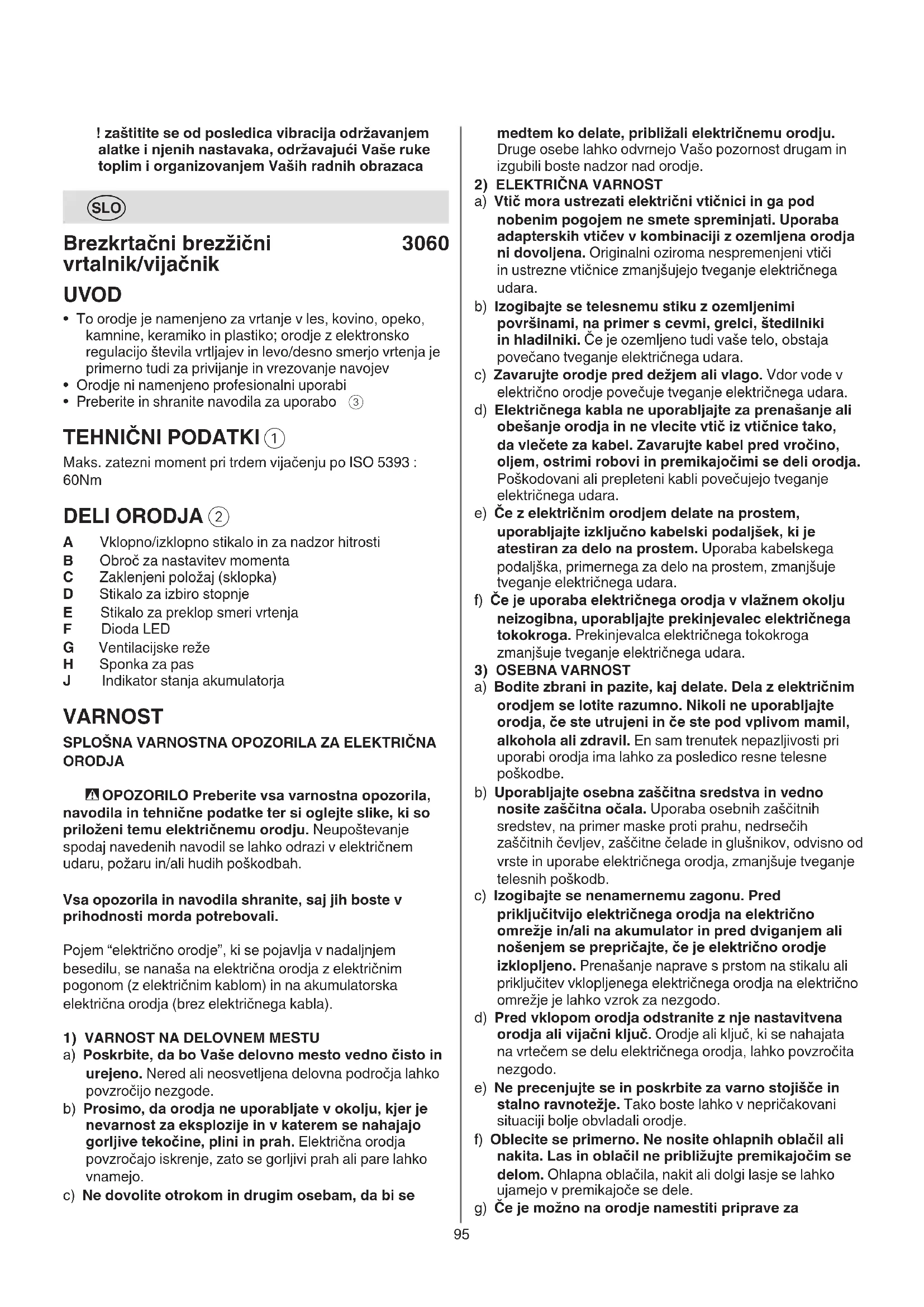 A Vklopno/izklopno stikalo in za nadzor hitrosti B Obroč za nastavitev momenta C Zaklenjeni položaj (sklopka) D Stikalo za izbiro stopnje E Stikalo za preklop smeri vrtenja F Dioda LED G Ventilacijske reže H Sponka za pas J Indikator stanja akumulatorja VARNOST SPLOŠNA VARNOSTNA OPOZORILA ZA ELEKTRIČNA ORODJA - OPOZORILO Preberite vsa varnostna opozorila, navodila in tehnične podatke ter si oglejte slike, ki so priloženi temu električnemu orodju. Neupoštevanje spodaj navedenih navodil se lahko odrazi v električnem udaru, požaru in/ali hudih poškodbah. Vsa opozorila in navodila shranite, saj jih boste v prihodnosti morda potrebovali. Pojem “električno orodje”, ki se pojavlja v nadaljnjem besedilu, se nanaša na električna orodja z električnim pogonom (z električnim kablom) in na akumulatorska električna orodja (brez električnega kabla).