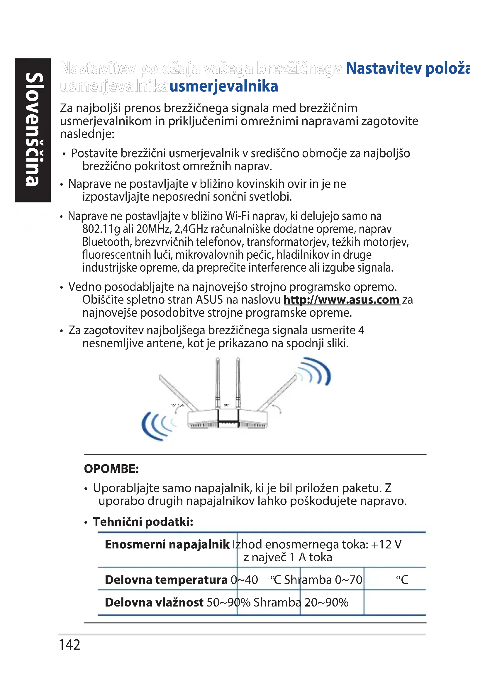 - Používateľskú príručku môžete získať on-line na https://www.asus.com/support141 Slovenščina Hiter pogled na vaš RT-AX55Hiter pogled na vaš RT-AX55 Vsebina paketaVsebina paketa RT-AX55 Adapter za izmenični tok Omrežni kabel (RJ-45) Vodnik za hitri zagon Lučka 5GHz Gumb za WPS Lučka 2,4GHz Stikalo za vklop/izklop LAN 1~4 lučke LED Vhod za napajanje (DCIN) WAN (internet) lučka LED Vhod WAN (Internet) Lučka za vklop Vhodi LAN 1~4 Gumb za ponastavitev Slovenščina142 Slovenščina 90° 45° 45° Nastavitev položaja vašega brezžičnega Nastavitev položaja vašega brezžičnega usmerjevalnikausmerjevalnika Za najboljši prenos brezžičnega signala med brezžičnim usmerjevalnikom in priključenimi omrežnimi napravami zagotovite naslednje: