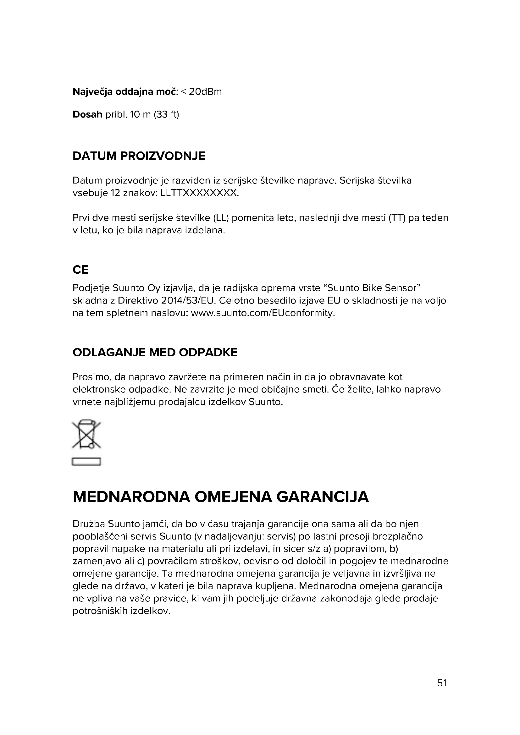 Prosimo, da napravo zavržete na primeren način in da jo obravnavate kot elektronske odpadke. Ne zavrzite je med običajne smeti. Če želite, lahko napravo vrnete najbližjemu prodajalcu izdelkov Suunto.