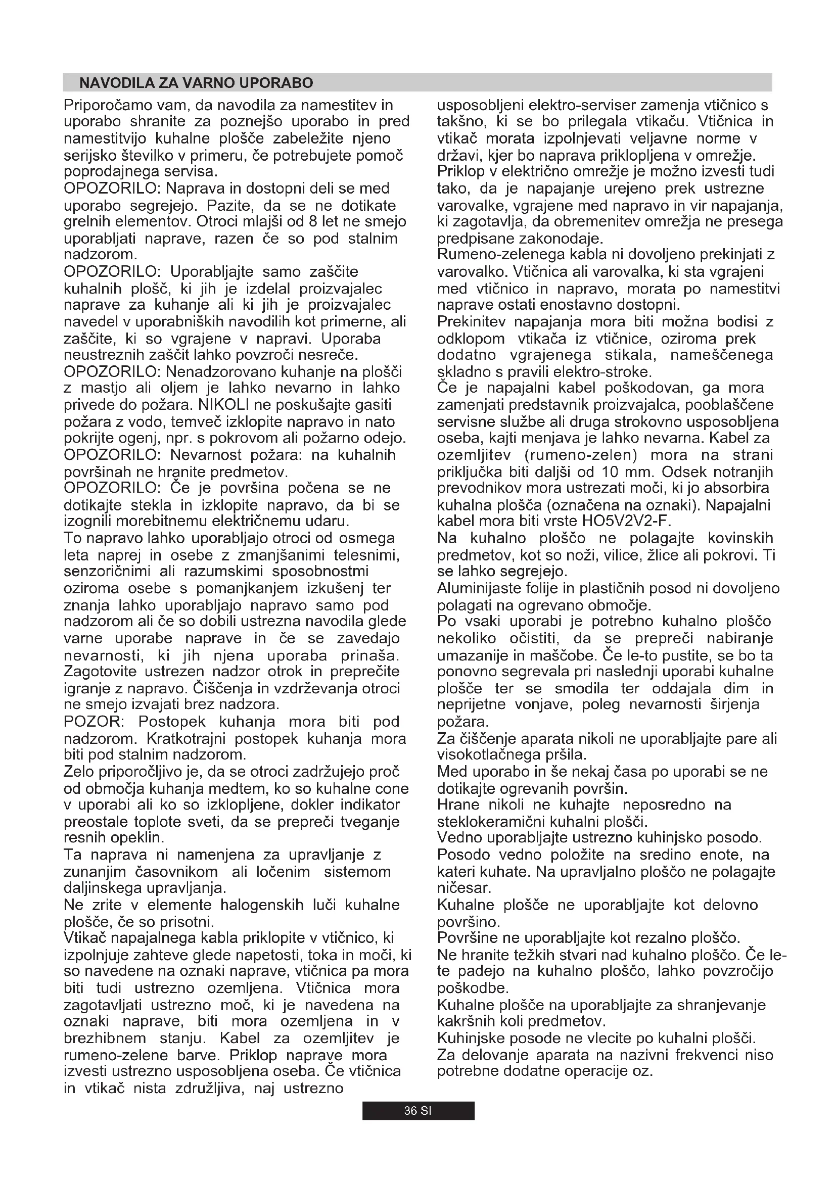 ZA UPORABNIKA Dovoljena je samo namenska uporaba kuhalne plošče, tj. za kuhanje v gospodinjstvih. Drugačna uporaba ni dovoljena in predstavlja tveganje za uporabnika. Proizvajalec ne prevzema odgovornosti za poškodbe ali škodo zaradi nenamenske uporabe.