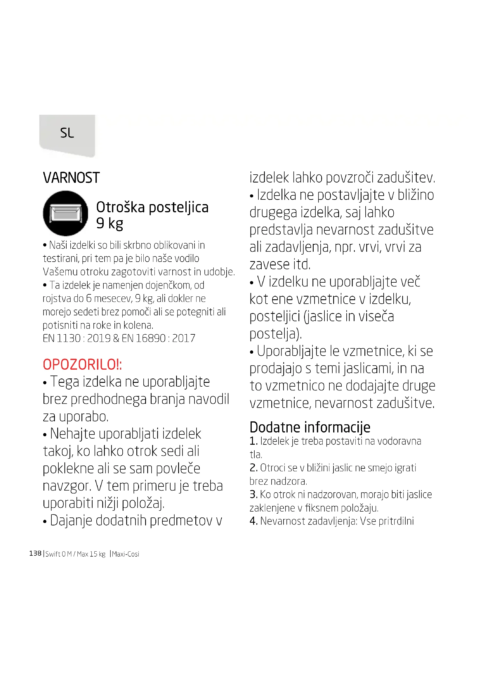 - Za pranje tkanine glejte navodila na etiketi. Okolje Plastično prevleko hranite zunaj dosega otrok, da preprečite nevarnost zadušitve. Kadar prenehate uporabljati izdelek, ga iz okoljevarstvenih razlogov odstranite v primernih zbirnih centrih za odpadke skladno z lokalno zakonodajo. Vprašanja Obrnite se na vašega lokalnega prodajalca ali pa obiščite našo spletno stran www.maxi-cosi.com pod »Naše storitve«. Pri tem imejte pri roki naslednje podatke: – serijsko številko; – starost, višino in težo otroka. Garancija Naša 24-mesečna garancija odraža naše zaupanje v visoko kakovost oblikovanja, inženiringa, proizvodnje in učinkovitost naših izdelkov. Zagotavljamo vam, da je izdelek v skladu s trenutno veljavnimi evropskimi varnostnimi zahtevami in standardi kakovosti, ki se uporabljajo za ta izdelek in da je izdelek v času nakupa brez napak na materialih ali pri izdelavi. Pod omenjenimi pogoji se lahko potrošniki sklicujejo na to garancijo v državah, kjer je bil izdelek prodan pri hčerinski družbi skupine Dorel ali pri pooblaščenem distributerju ali prodajalcu. Naša 24-mesečna garancija pokriva vse proizvodne napake na materialih in pri izdelavi, če izdelek uporabljate v normalnih pogojih in v skladu z našimi navodili za uporabo in sicer za obdobje 24 mesecev od datuma nakupa s strani prvega končnega uporabnika. V primeru zahtevka za popravila ali nadomestne dele za napake na materialih ali pri izdelavi v času garancijskega roka, morate predložiti dokazilo o nakupu, ki je bil opravljen 24 mesecev pred uveljavljanjem garancije. Naša 24-mesečna garancija ne pokriva škode, ki nastane zaradi običajne obrabe, škode, ki nastane zaradi nesreč, nepravilne uporabe, malomarnosti, požara, stika s SL142