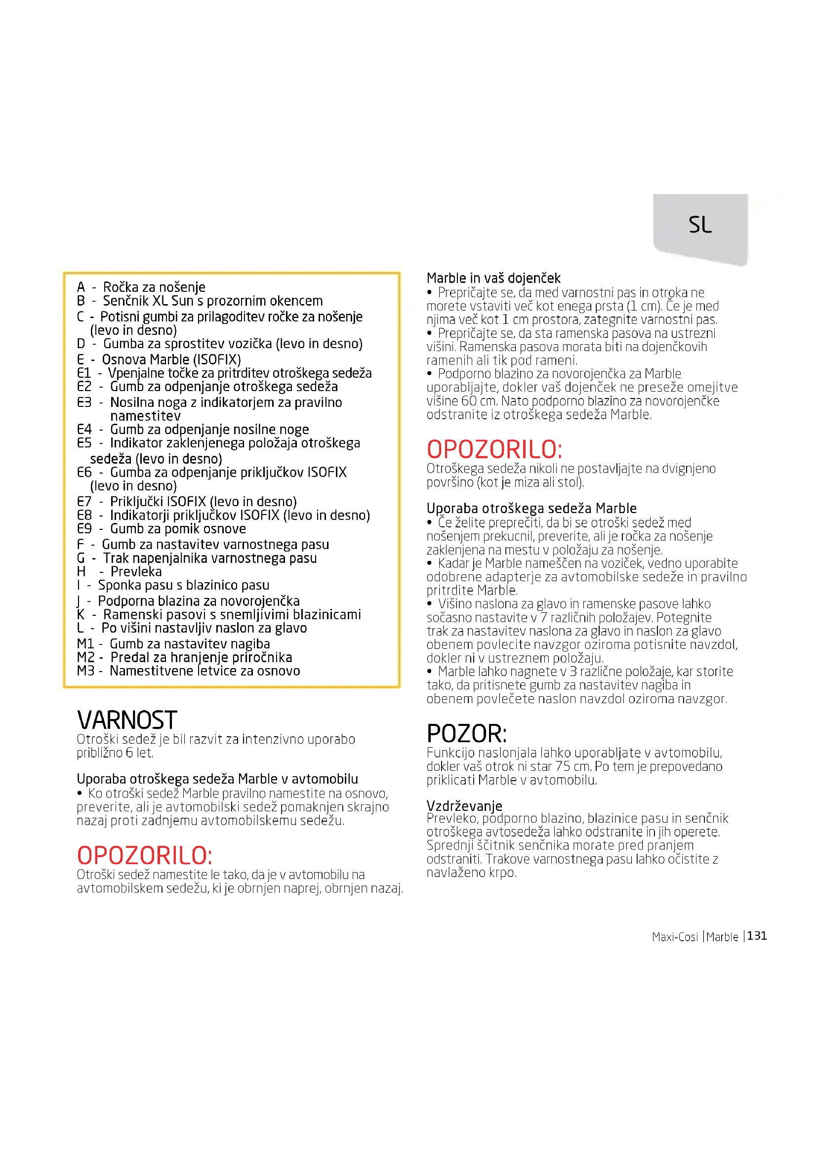 - Marble lahko nagnete v 3 različne položaje, kar storite tako, da pritisnete gumb za nastavitev nagiba in obenem povlečete naslon navzdol oziroma navzgor. POZOR: Funkcijo naslonjala lahko uporabljate v avtomobilu, dokler vaš otrok ni star 75 cm. Po tem je prepovedano priklicati Marble v avtomobilu. Vzdrževanje Prevleko, podporno blazino, blazinice pasu in senčnik otroškega avtosedeža lahko odstranite in jih operete. Sprednji ščitnik senčnika morate pred pranjem odstraniti. Trakove varnostnega pasu lahko očistite z navlaženo krpo. A - Ročka za nošenje B - Senčnik XL Sun s prozornim okencem C - Potisni gumbi za prilagoditev ročke za nošenje (levo in desno) D - Gumba za sprostitev vozička (levo in desno) E - Osnova Marble (ISOFIX) E1 - Vpenjalne točke za pritrditev otroškega sedeža E2 - Gumb za odpenjanje otroškega sedeža E3 - Nosilna noga z indikatorjem za pravilno namestitev E4 - Gumb za odpenjanje nosilne noge E5 - Indikator zaklenjenega položaja otroškega sedeža (levo in desno) E6 - Gumba za odpenjanje priključkov ISOFIX (levo in desno) E7 - Priključki ISOFIX (levo in desno) E8 - Indikatorji priključkov ISOFIX (levo in desno) E9 - Gumb za pomik osnove F - Gumb za nastavitev varnostnega pasu G - Trak napenjalnika varnostnega pasu H - Prevleka I - Sponka pasu s blazinico pasu J - Podporna blazina za novorojenčka K - Ramenski pasovi s snemljivimi blazinicami L - Po višini nastavljiv naslon za glavo M1 - Gumb za nastavitev nagiba M2 - Predal za hranjenje priročnika M3 - Namestitvene letvice za osnovo132
