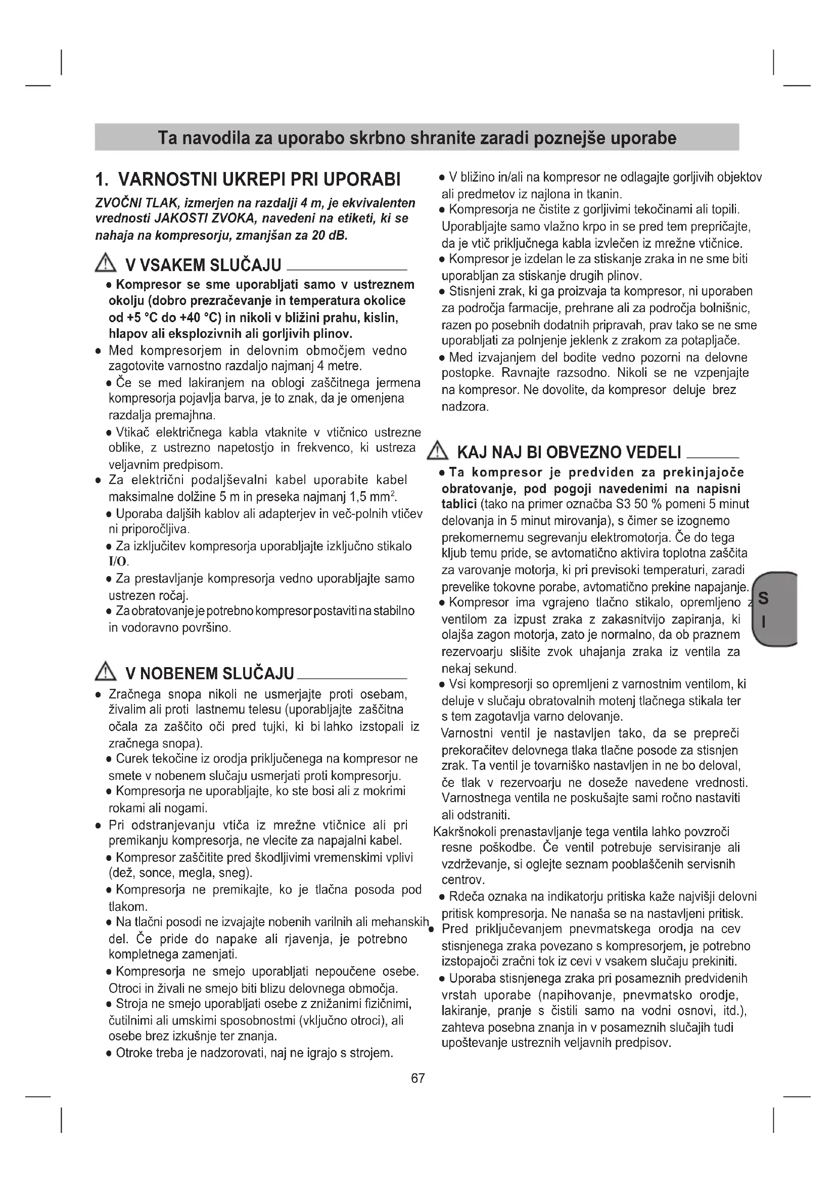 ● Ta kompresor je predviden za prekinjajoče obratovanje, pod pogoji navedenimi na napisni tablici (tako na primer označba S3 50 % pomeni 5 minut delovanja in 5 minut mirovanja), s čimer se izognemo prekomernemu segrevanju elektromotorja. Če do tega kljub temu pride, se avtomatično aktivira toplotna zaščita za varovanje motorja, ki pri previsoki temperaturi, zaradi prevelike tokovne porabe, avtomatično prekine napajanje. ● Kompresor ima vgrajeno tlačno stikalo, opremljeno z ventilom za izpust zraka z zakasnitvijo zapiranja, ki olajša zagon motorja, zato je normalno, da ob praznem rezervoarju slišite zvok uhajanja zraka iz ventila za nekaj sekund. ● Vsi kompresorji so opremljeni z varnostnim ventilom, ki deluje v slučaju obratovalnih motenj tlačnega stikala ter s tem zagotavlja varno delovanje. Varnostni ventil je nastavljen tako, da se prepreči prekoračitev delovnega tlaka tlačne posode za stisnjen zrak. Ta ventil je tovarniško nastavljen in ne bo deloval, če tlak v rezervoarju ne doseže navedene vrednosti. Varnostnega ventila ne poskušajte sami ročno nastaviti ali odstraniti. Kakršnokoli prenastavljanje tega ventila lahko povzroči resne poškodbe. Če ventil potrebuje servisiranje ali vzdrževanje, si oglejte seznam pooblaščenih servisnih centrov. ● Rdeča oznaka na indikatorju pritiska kaže najvišji delovni pritisk kompresorja. Ne nanaša se na nastavljeni pritisk. ● Pred priključevanjem pnevmatskega orodja na cev stisnjenega zraka povezano s kompresorjem, je potrebno izstopajoči zračni tok iz cevi v vsakem slučaju prekiniti. ● Uporaba stisnjenega zraka pri posameznih predvidenih vrstah uporabe (napihovanje, pnevmatsko orodje, lakiranje, pranje s čistili samo na vodni osnovi, itd.), zahteva posebna znanja in v posameznih slučajih tudi upoštevanje ustreznih veljavnih predpisov.68