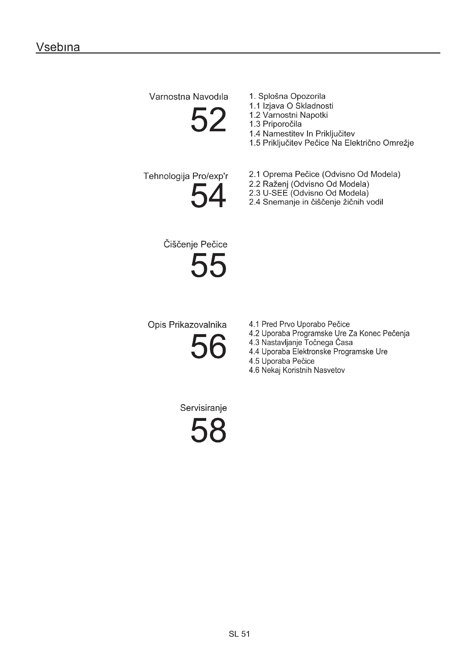 SL 51 Servisiranje 58• Med kuhanjem lahko vlaga kondenzira znotraj odprtine pečice ali na steklu vrat. To je normalno stanje. Za zmanjšanje tega učinka počakajte 10-15 minut po vklopu napajanja, preden hrano vstavite v pečico. V vsakem primeru kondenzacija izgine, ko pečica doseže temperaturo za kuhanje.