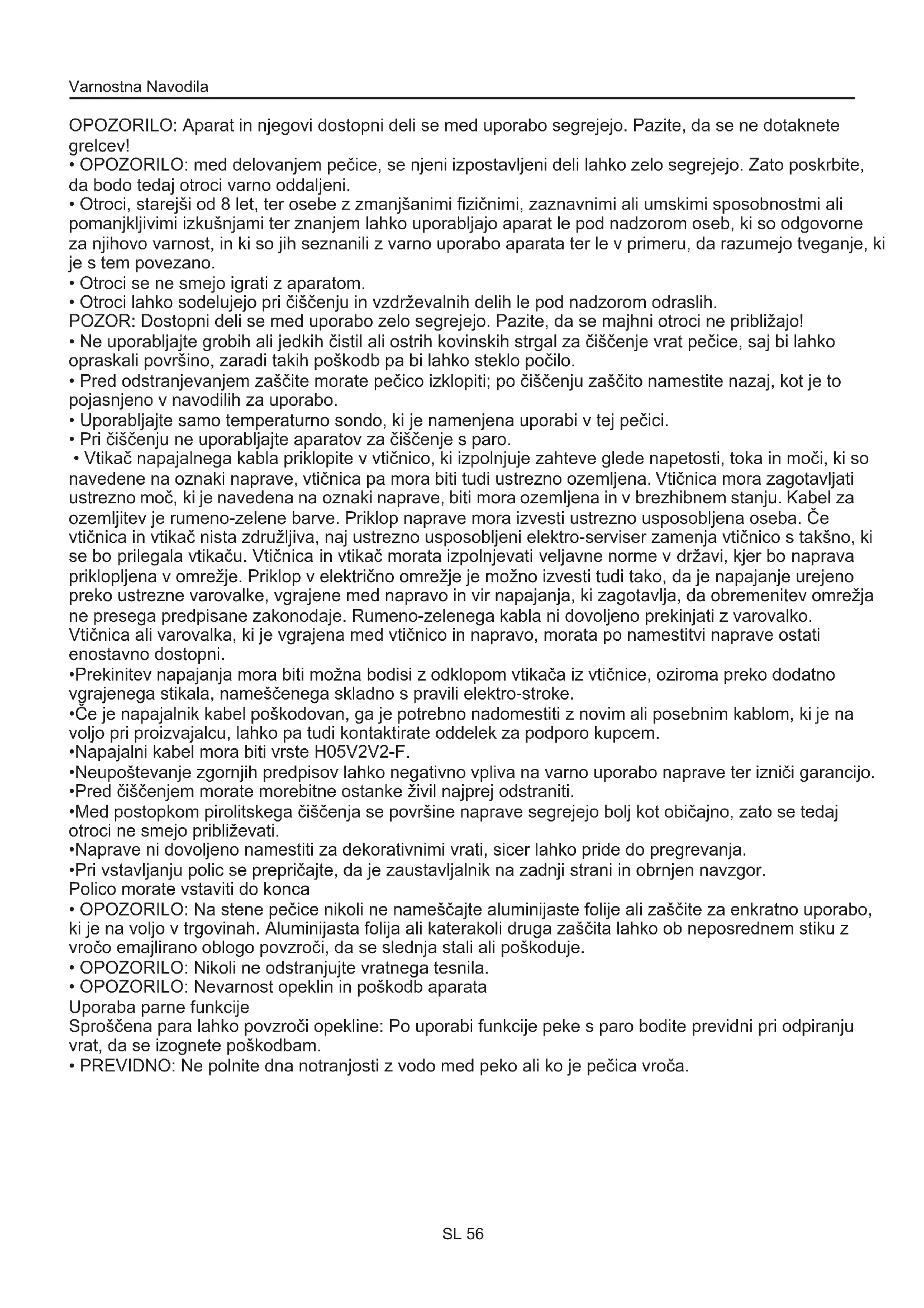 - PREVIDNO: Ne polnite dna notranjosti z vodo med peko ali ko je pečica vroča. Varnostna Navodila SL 56Povzetek SL 57 Čiščenje in vzdrževanje pečice Splošna navodila