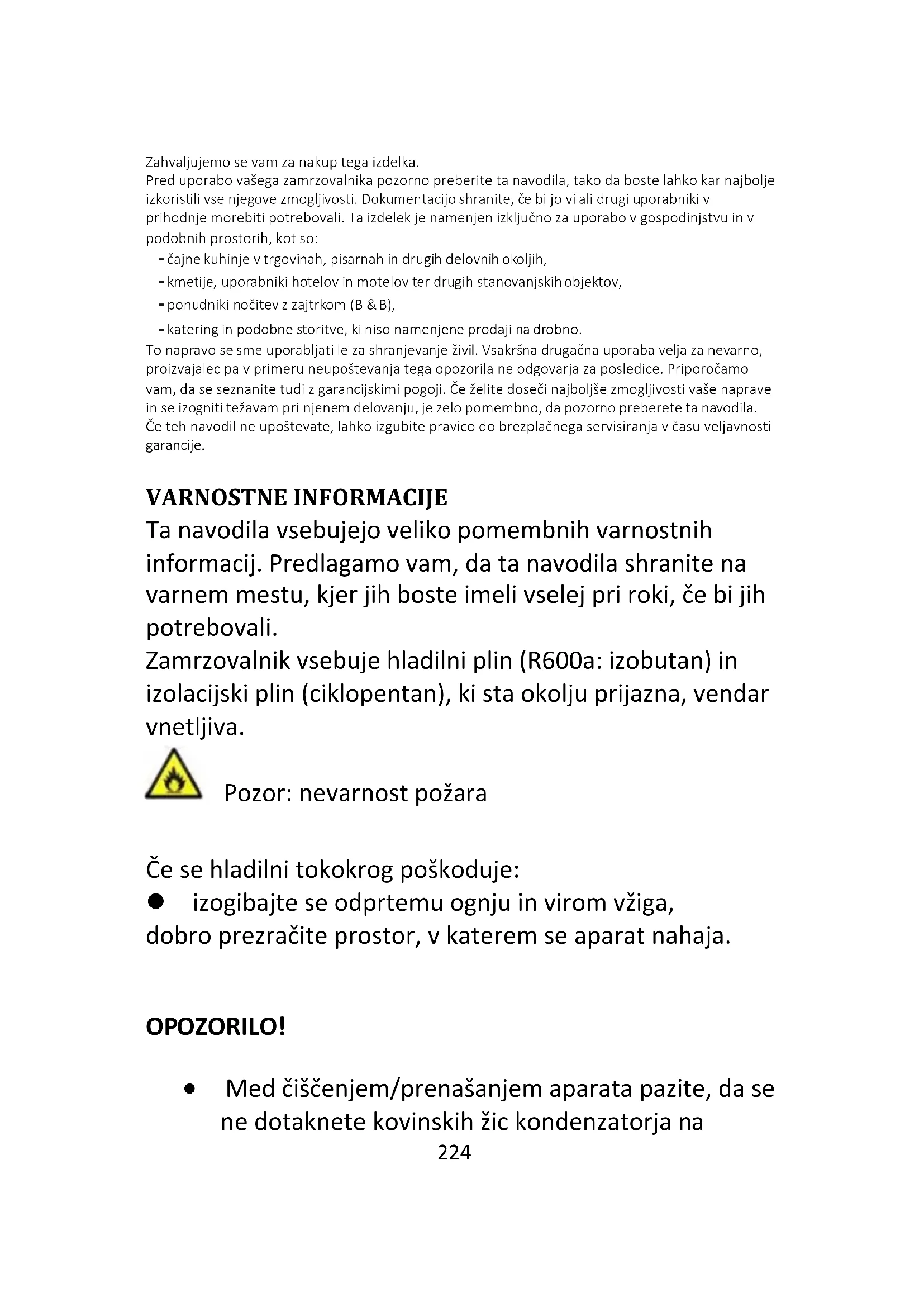- ODPRAVLJANJE NAPAK 24 Zahvaljujemo se vam za nakup tega izdelka. Pred uporabo vašega zamrzovalnika pozorno preberite ta navodila, tako da boste lahko kar najbolje izkoristili vse njegove zmogljivosti. Dokumentacijo shranite, če bi jo vi ali drugi uporabniki v prihodnje morebiti potrebovali. Ta izdelek je namenjen izključno za uporabo v gospodinjstvu in v podobnih prostorih, kot so: - čajne kuhinje v trgovinah, pisarnah in drugih delovnih okoljih, - kmetije, uporabniki hotelov in motelov ter drugih stanovanjskih objektov, - ponudniki nočitev z zajtrkom (B & B), - katering in podobne storitve, ki niso namenjene prodaji na drobno. To napravo se sme uporabljati le za shranjevanje živil. Vsakršna drugačna uporaba velja za nevarno, proizvajalec pa v primeru neupoštevanja tega opozorila ne odgovarja za posledice. Priporočamo vam, da se seznanite tudi z garancijskimi pogoji. Če želite doseči najboljše zmogljivosti vaše naprave in se izogniti težavam pri njenem delovanju, je zelo pomembno, da pozorno preberete ta navodila. Če teh navodil ne upoštevate, lahko izgubite pravico do brezplačnega servisiranja v času veljavnosti garancije. VARNOSTNE INFORMACIJE Ta navodila vsebujejo veliko pomembnih varnostnih informacij. Predlagamo vam, da ta navodila shranite na varnem mestu, kjer jih boste imeli vselej pri roki, če bi jih potrebovali. Zamrzovalnik vsebuje hladilni plin (R600a: izobutan) in izolacijski plin (ciklopentan), ki sta okolju prijazna, vendar vnetljiva. Pozor: nevarnost požara Če se hladilni tokokrog poškoduje: izogibajte se odprtemu ognju in virom vžiga, dobro prezračite prostor, v katerem se aparat nahaja. p. 2382