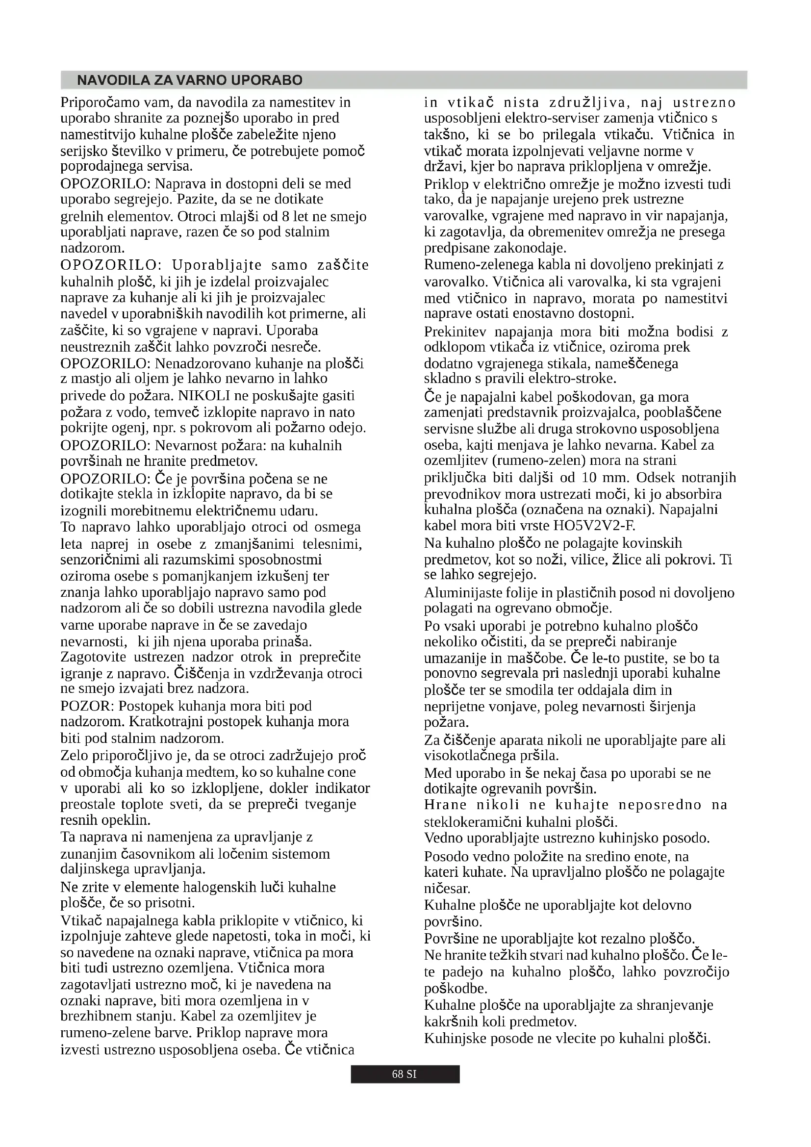 68 SI Priklop v električno omrežje je možno izvesti tudi tako, da je napajanje urejeno prek ustrezne varovalke, vgrajene med napravo in vir napajanja, ki zagotavlja, da obremenitev omrežja ne presega predpisane zakonodaje. Na kuhalno ploščo ne polagajte kovinskih predmetov, kot so noži, vilice, žlice ali pokrovi. Ti se lahko segrejejo. Če je napajalni kabel poškodovan, ga mora zamenjati predstavnik proizvajalca, pooblaščene servisne službe ali druga strokovno usposobljena oseba, kajti menjava je lahko nevarna. Kabel za ozemljitev (rumeno-zelen) mora na strani priključka biti daljši od 10 mm. Odsek notranjih prevodnikov mora ustrezati moči, ki jo absorbira kuhalna plošča (označena na oznaki). Napajalni kabel mora biti vrste HO5V2V2-F. Prekinitev napajanja mora biti možna bodisi z odklopom vtikača iz vtičnice, oziroma prek dodatno vgrajenega stikala, nameščenega skladno s pravili elektro-stroke. Med uporabo in še nekaj časa po uporabi se ne dotikajte ogrevanih površin. Hrane nikoli ne kuhajte neposredno na steklokeramični kuhalni plošči. Posodo vedno položite na sredino enote, na kateri kuhate. Na upravljalno ploščo ne polagajte ničesar. Kuhalne plošče ne uporabljajte kot delovno površino. in vtikač nista združljiva, naj ustrezno usposobljeni elektro-serviser zamenja vtičnico s takšno, ki se bo prilegala vtikaču. Vtičnica in vtikač morata izpolnjevati veljavne norme v državi, kjer bo naprava priklopljena v omrežje. Površine ne uporabljajte kot rezalno ploščo. Kuhalne plošče na uporabljajte za shranjevanje kakršnih koli predmetov. Kuhinjske posode ne vlecite po kuhalni plošči. Po vsaki uporabi je potrebno kuhalno ploščo nekoliko očistiti, da se prepreči nabiranje umazanije in maščobe. Če le-to pustite, se bo ta ponovno segrevala pri naslednji uporabi kuhalne plošče ter se smodila ter oddajala dim in neprijetne vonjave, poleg nevarnosti širjenja požara. Aluminijaste folije in plastičnih posod ni dovoljeno polagati na ogrevano območje. Rumeno-zelenega kabla ni dovoljeno prekinjati z varovalko. Vtičnica ali varovalka, ki sta vgrajeni med vtičnico in napravo, morata po namestitvi naprave ostati enostavno dostopni. Vedno uporabljajte ustrezno kuhinjsko posodo. Za čiščenje aparata nikoli ne uporabljajte pare ali visokotlačnega pršila. Ne hranite težkih stvari nad kuhalno ploščo. Če le- te padejo na kuhalno ploščo, lahko povzročijo poškodbe.Med kuhalno ploščo in zadnjo steno mora biti najmanj 55 mm in najmanj 150 mm med kuhalno ploščo in navpičnim pohištvom ali stenami na bočni strani. Če boste nad kuhalno ploščo vgradili pohištvo, mora najmanjša razdalja znašati 700 mm. Pri nameščanju nape nad kuhalno ploščo, si oglejte pogoje namestitve za napo, vendar pa v nobenem primeru ne sme biti razdalja med kuhalno ploščo in napo manjša od 700 mm.
