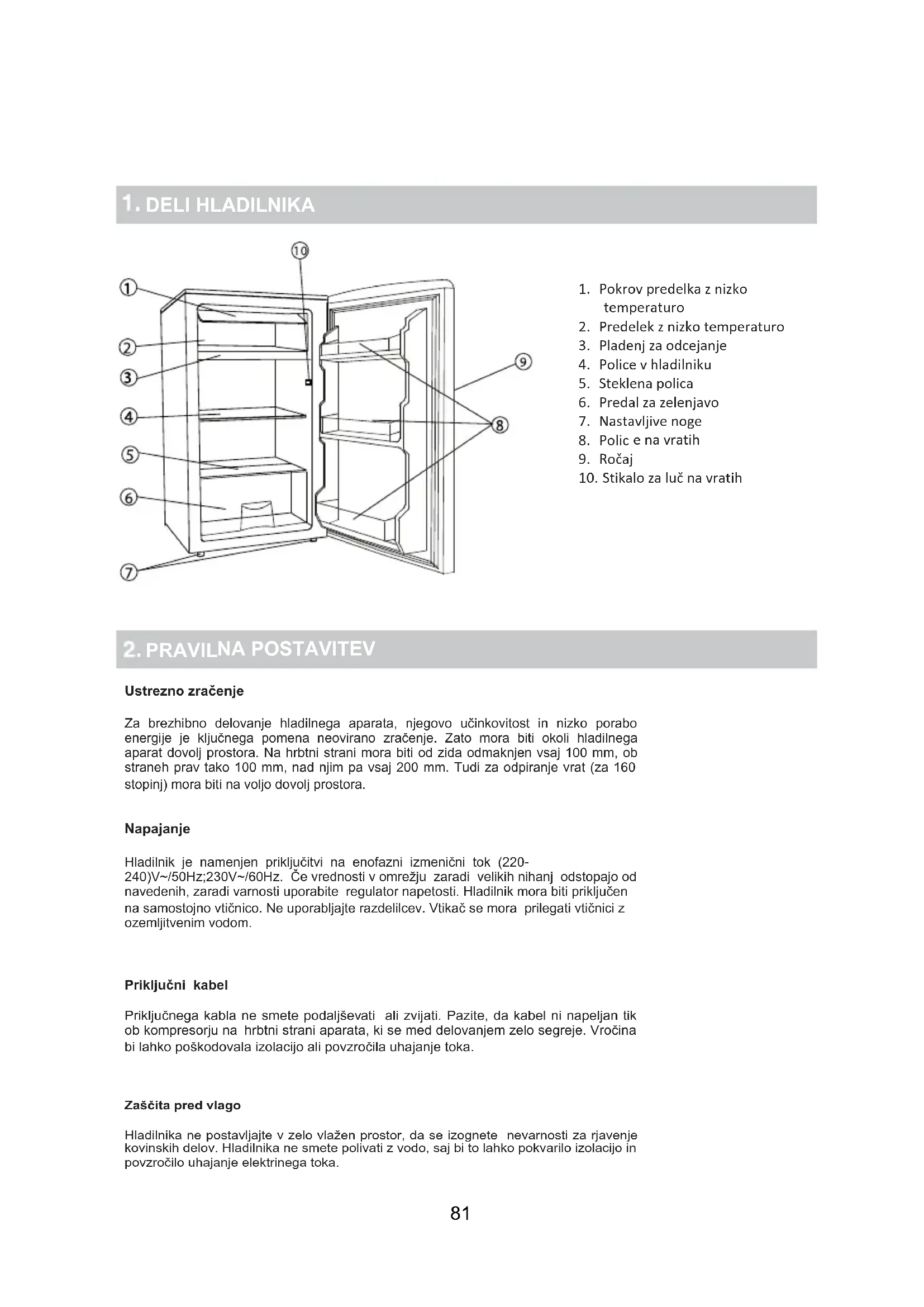 Napajanje Hladilnik je namenjen priključitvi na enofazni izmenični tok (220- 240)V~/50Hz;230V~/60Hz. Če vrednosti v omrežju zaradi velikih nihanj odstopajo od navedenih, zaradi varnosti uporabite regulator napetosti. Hladilnik mora biti priključen na samostojno vtičnico. Ne uporabljajte razdelilcev. Vtikač se mora prilegati vtičnici z ozemljitvenim vodom.