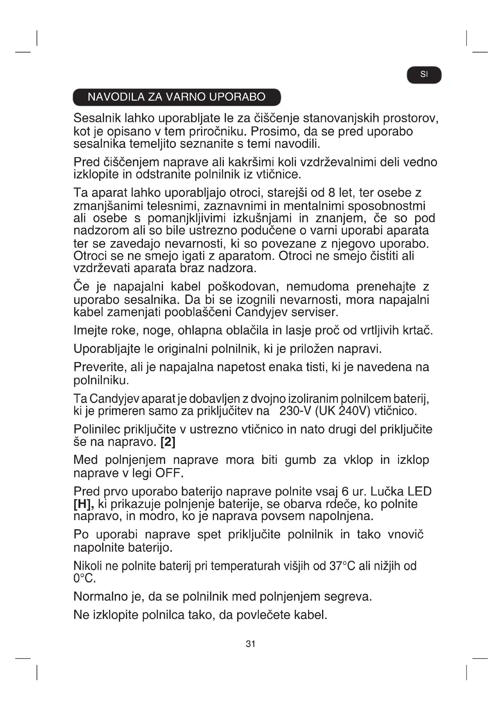 Sesalnik lahko uporabljate le za čiščenje stanovanjskih prostorov, kot je opisano v tem priročniku. Prosimo, da se pred uporabo sesalnika temeljito seznanite s temi navodili. Pred čiščenjem naprave ali kakršimi koli vzdrževalnimi deli vedno izklopite in odstranite polnilnik iz vtičnice. Ta aparat lahko uporabljajo otroci, starejši od 8 let, ter osebe z zmanjšanimi telesnimi, zaznavnimi in mentalnimi sposobnostmi ali osebe s pomanjkljivimi izkušnjami in znanjem, če so pod nadzorom ali so bile ustrezno podučene o varni uporabi aparata ter se zavedajo nevarnosti, ki so povezane z njegovo uporabo. Otroci se ne smejo igati z aparatom. Otroci ne smejo čistiti ali vzdrževati aparata braz nadzora. Če je napajalni kabel poškodovan, nemudoma prenehajte z uporabo sesalnika. Da bi se izognili nevarnosti, mora napajalni kabel zamenjati pooblaščeni Candyjev serviser. Imejte roke, noge, ohlapna oblačila in lasje proč od vrtljivih krtač. Uporabljajte le originalni polnilnik, ki je priložen napravi. Preverite, ali je napajalna napetost enaka tisti, ki je navedena na polnilniku. Ta Candyjev aparat je dobavljen z dvojno izoliranim polnilcem baterij, ki je primeren samo za priključitev na 230-V (UK 240V) vtičnico. Polinilec priključite v ustrezno vtičnico in nato drugi del priključite še na napravo. [2] Med polnjenjem naprave mora biti gumb za vklop in izklop naprave v legi OFF. Pred prvo uporabo baterijo naprave polnite vsaj 6 ur. Lučka LED [H], ki prikazuje polnjenje baterije, se obarva rdeče, ko polnite napravo, in modro, ko je naprava povsem napolnjena. Po uporabi naprave spet priključite polnilnik in tako vnovič napolnite baterijo. Nikoli ne polnite baterij pri temperaturah višjih od 37°C ali nižjih od 0°C. Normalno je, da se polnilnik med polnjenjem segreva. Ne izklopite polnilca tako, da povlečete kabel. SI32 Polnilec izklopite v primeru podaljšane odsotnosti (počitnice, itd.). Pred ponovno uporabo spet napolnite baterije, ker se lahko te izpraznijo samodejno, če sesalnika dlje časa ne uporabljate. Če boste napravo odvrgli, morate najprej odstraniti baterije. Ko želite odstraniti baterije, mora biti naprava izključena iz električnega toka. Baterije odvrzite na varen način. Pustite delovati napravo do konca, da bodo baterije popolnoma prazne. Uporabljene baterije je treba odnesti v enoto za recikliranje in se ne smejo odvreči v gospodinjske smeti. Za odstranitev baterij vas prosimo, da se obrnete na Candyjev center za kupce ali nadaljujete po sledečih navodilih. POMEMBNO: Pred odstranjevanjem baterije vedno popolnoma izpraznite. Sesalnik naj deluje toliko časa, da se baterije do konca izpraznijo. Vtikač polnilca odstranite iz naprave. Gumb za sprostitev baterije povlecite nazaj in baterija bo samodejno deloma izstopila iz reže. [14a] Baterijo počasi odstranite iz reže. [14b] Opomba: V primeru težav z razstavljanjem naprave ali za podrobnejše informacije o ravnanju z izdelkom, obnovi ali ricikliranju izdelka se obrnite na krajevni urad ali komunalno podjetje za odvoz gosodinjskih odpadkov. Uporabljajte le dodatke, potrošni material ali nadomestne dele, ki jih priporoča ali dobavi Candy. Statična elektrika: Določene vrste preprog lahko ustvarijo manjšo količino statične elektrike. Kakršen koli statični električni naboj ne ogroža zdravja. Sesalnika ne smete uporabljajti na prostem, na kakršni koli mokri površini ali za sesanje tekočin. Ne smete sesati trdih ali ostrih predmetov, vžigalic, vročega pepela, cigaretnih ogorkov ali drugih podobnih snovi. Ne smete pršiti ali sesati vnetljivih tekočin, čistil, osvežilcev zraka ali njihovih hlapov Ne smete zapeljati prek napajalnega kabla med uporabo sesalnika ali izvleči vtikača tako, da bi vlekli za kabel. Ne smete uporabljati naprave ali polnilnika, če ne delujeta pravilno. Candyjev servis: Za zagotovitev nenehnega varnega in