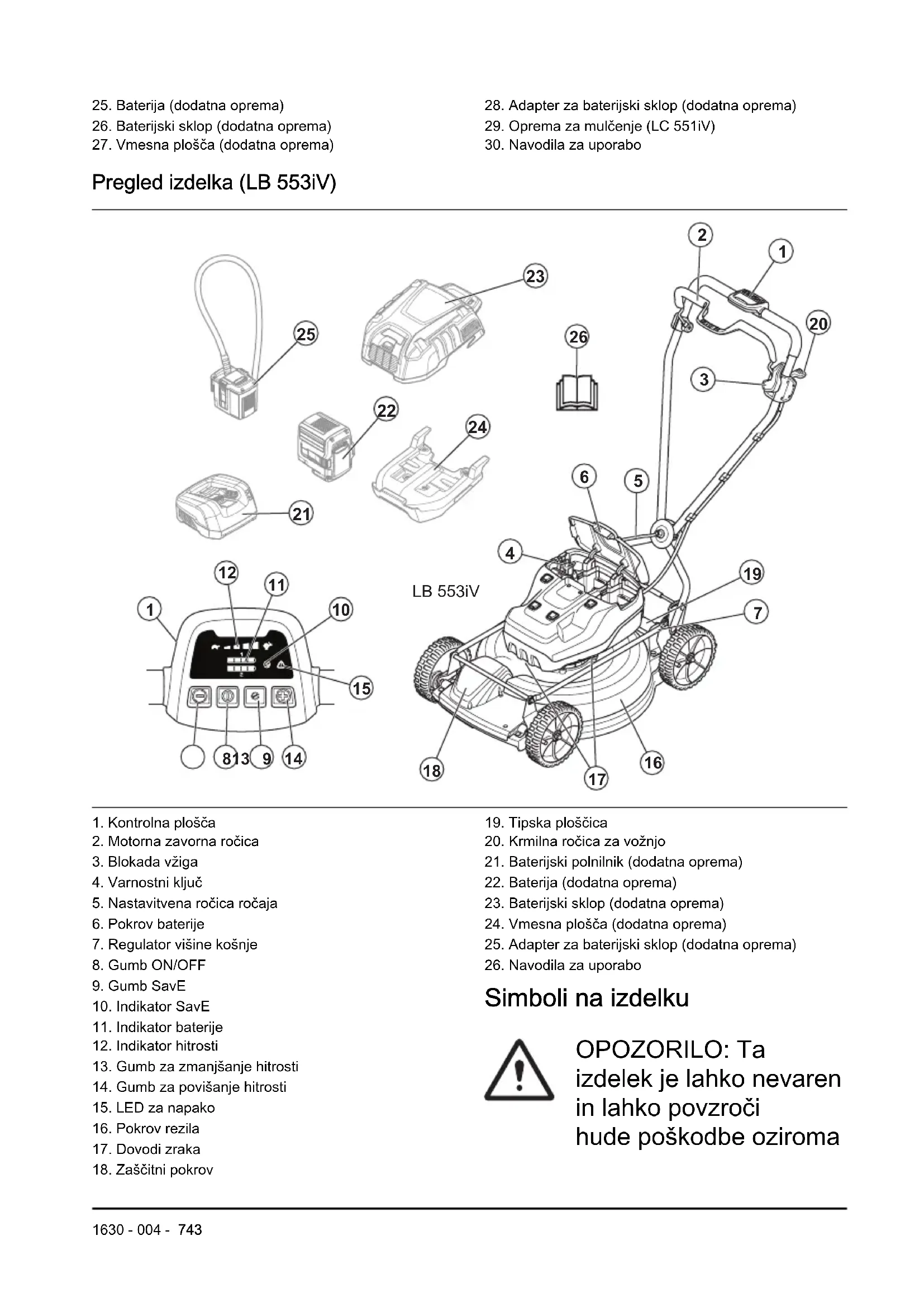 1. Kontrolna plošča2. Motorna zavorna ročica3. Blokada vžiga4. Varnostni ključ5. Nastavitvena ročica ročaja6. Pokrov baterije7. Regulator višine košnje8. Gumb ON/OFF9. Gumb SavE10. Indikator SavE11. Indikator baterije12. Indikator hitrosti13. Gumb za zmanjšanje hitrosti14. Gumb za povišanje hitrosti15. LED za napako16. Pokrov rezila17. Dovodi zraka18. Zaščitni pokrov19. Tipska ploščica20. Krmilna ročica za vožnjo21. Baterijski polnilnik (dodatna oprema)22. Baterija (dodatna oprema)23. Baterijski sklop (dodatna oprema)24. Vmesna plošča (dodatna oprema)25. Adapter za baterijski sklop (dodatna oprema)26. Navodila za uporabo Simboli na izdelku OPOZORILO: Ta izdelek je lahko nevaren in lahko povzroči hude poškodbe oziroma 1630 - 004 - 743smrt uporabnika ali drugih. Bodite previdni in uporabljajte izdelek pravilno. Pred uporabo tega izdelka morate pozorno prebrati navodila za uporabo ter jih razumeti. Poskrbite, da so osebe in živali na varni razdalji od delovnega območja. Pazite na leteče in odbite predmete. Opozorilo: Roke in noge držite stran od vrtljivega rezila. Opozorilo: Z rokami in nogami ne segajte v območje premikanja vrtljivih delov. Pred popravili ali vzdrževalnimi deli odstranite varnostni ključ. Okoljska oznaka.Izdelek in njegova embalaža ne sodita med gospodinjske odpadke. Treba ga je reciklirati v odobrenem zbirnem centru za električno in elektronsko opremo. Izdelek je skladen z veljavnimi direktivami ES. Izdelek je v skladu z veljavnimi direktivami ZK. Izdelek je skladen z veljavnimi direktivami Evrazijske carinske unije. Izdelek je skladen z veljavnimi direktivami UkrSEPRO. Izdelek je skladen z veljavnimi direktivami RCM. Velja samo za AU/NZ. Emisija hrupa v okolje je skladna z direktivami in uredbami EU, ZK ter zakonodajo Novega južnega Walesa, in sicer z direktivo "Zaščita okolja pri delu (nadzor hrupa) iz 2017". Zajamčena raven zvočne moči izdelka je navedena na in v Tehnični podatki 744 1630 - 004 -na strani 768 in na oznaki. Zaščiten pred pljuski vode. Zagonski po- stopek: pritisni- te gumb za VKLOP/ IZKLOP, spro- stite blokado vžiga, in ročico zavore motorja potisnite na- vzdol. Za zaustavitev sprostite motorno zavorno ročico. Počasi Hitro Bralna koda Opomba: Ostali simboli in oznake na izdelku se nanašajo na zahteve za certifikacijo, ki veljajo za nekatere trge. Nalepke na izdelku NEVARNOST – Ne približujte rok in nog. Odgovornost proizvajalca Kot je navedeno v zakonodaji, ki ureja odgovornost proizvajalca, ne prevzemamo nikakršne odgovornosti za poškodbe, ki bi jih naši izdelki povzročili v naslednjih primerih: