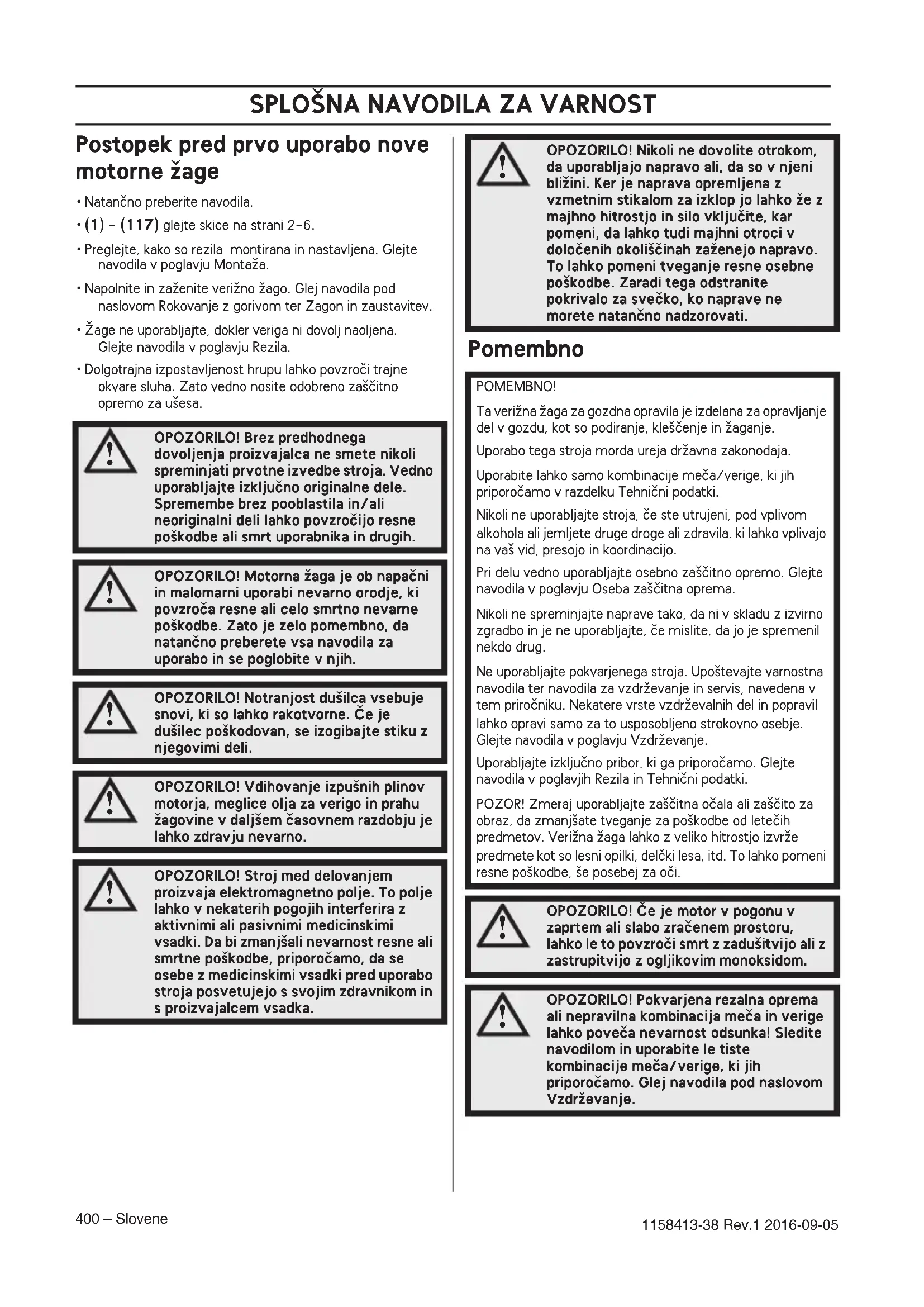 OPOZORILO! Pokvarjena rezalna oprema ali nepravilna kombinacija meãa in verige lahko poveãa nevarnost odsunka! Sledite navodilom in uporabite le tiste kombinacije meãa/verige, ki jih priporoãamo. Glej navodila pod naslovom VzdrÏevanje.SPLO·NA NAVODILA ZA VARNOST Slovene – 4011158413-38 Rev.1 2016-09-05 Zmeraj uporabljajte zdrav razum (2) Ni moÏno opisati vseh situacij, ki se lahko zgodijo pri uporabi veriÏne Ïage. Zmeraj bodite pazljivi in uporabljajte zdrav razum. Izogibajte se situacijam za katere menite, da so izven va‰ih zmoÏnosti. âe ste po branju teh navodil ‰e vedno negotovi o delovnih postopkih se pred nadaljevanjem posvetujte z izvedencem. V vsakem primeru kontaktirajte va‰ega prodajalca, ãe imate ‰e kakr‰nakoli vpra‰anja glede uporabe Ïag. Z veseljem vam bomo pomagali in svetovali ter pomagali, da boste veriÏno Ïago uporabljali uãinkovito in varno. âe je moÏno se udeleÏite usposabljanja za uporabo Ïage. Va‰ prodajalec, lesna ‰ola ali knjiÏnica vam lahko posredujejo informacije o usposabljanjih in literaturi, ki so na voljo. Nenehno delamo na izbolj‰avah zgradbe in tehnologije – izbolj‰ave, ki poveãajo va‰o varnost in uãinek. Redno obiskujte va‰ega prodajalca, da preverite kak‰no korist lahko imate od novih prednosti, ki bile vpeljane. Osebna za‰ãitna oprema