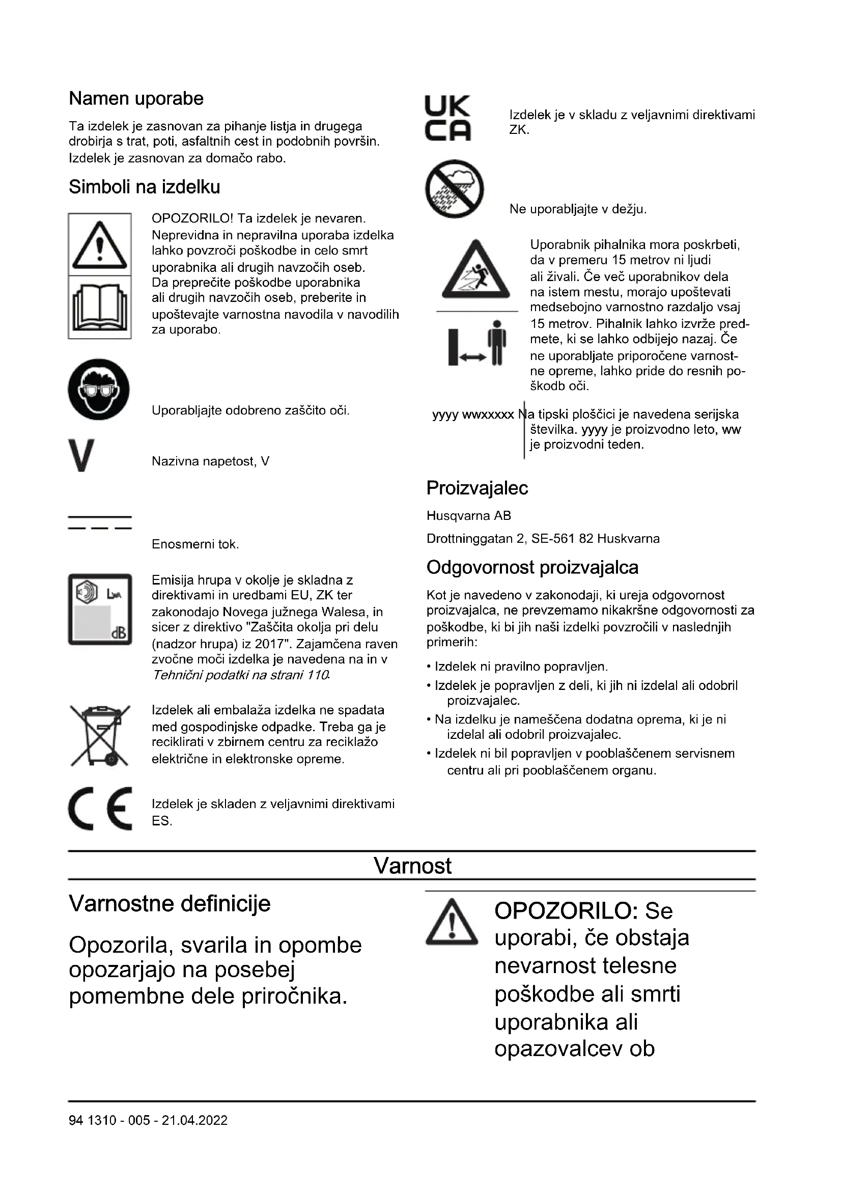 Opis izdelka Model pihalnika Husqvarna 120iB z elektromotorjem. Nenehno razvijamo in izpopolnjujemo svoje izdelke, zato si pridržujemo pravico do sprememb njihove oblike in videza brez predhodnega opozorila. 1310 - 005 - 21.04.2022 93Namen uporabe Ta izdelek je zasnovan za pihanje listja in drugega drobirja s trat, poti, asfaltnih cest in podobnih površin. Izdelek je zasnovan za domačo rabo. Simboli na izdelku OPOZORILO! Ta izdelek je nevaren. Neprevidna in nepravilna uporaba izdelka lahko povzroči poškodbe in celo smrt uporabnika ali drugih navzočih oseb. Da preprečite poškodbe uporabnika ali drugih navzočih oseb, preberite in upoštevajte varnostna navodila v navodilih za uporabo. Uporabljajte odobreno zaščito oči. Nazivna napetost, V Enosmerni tok. Emisija hrupa v okolje je skladna z direktivami in uredbami EU, ZK ter zakonodajo Novega južnega Walesa, in sicer z direktivo "Zaščita okolja pri delu (nadzor hrupa) iz 2017". Zajamčena raven zvočne moči izdelka je navedena na in v Tehnični podatki na strani 110
