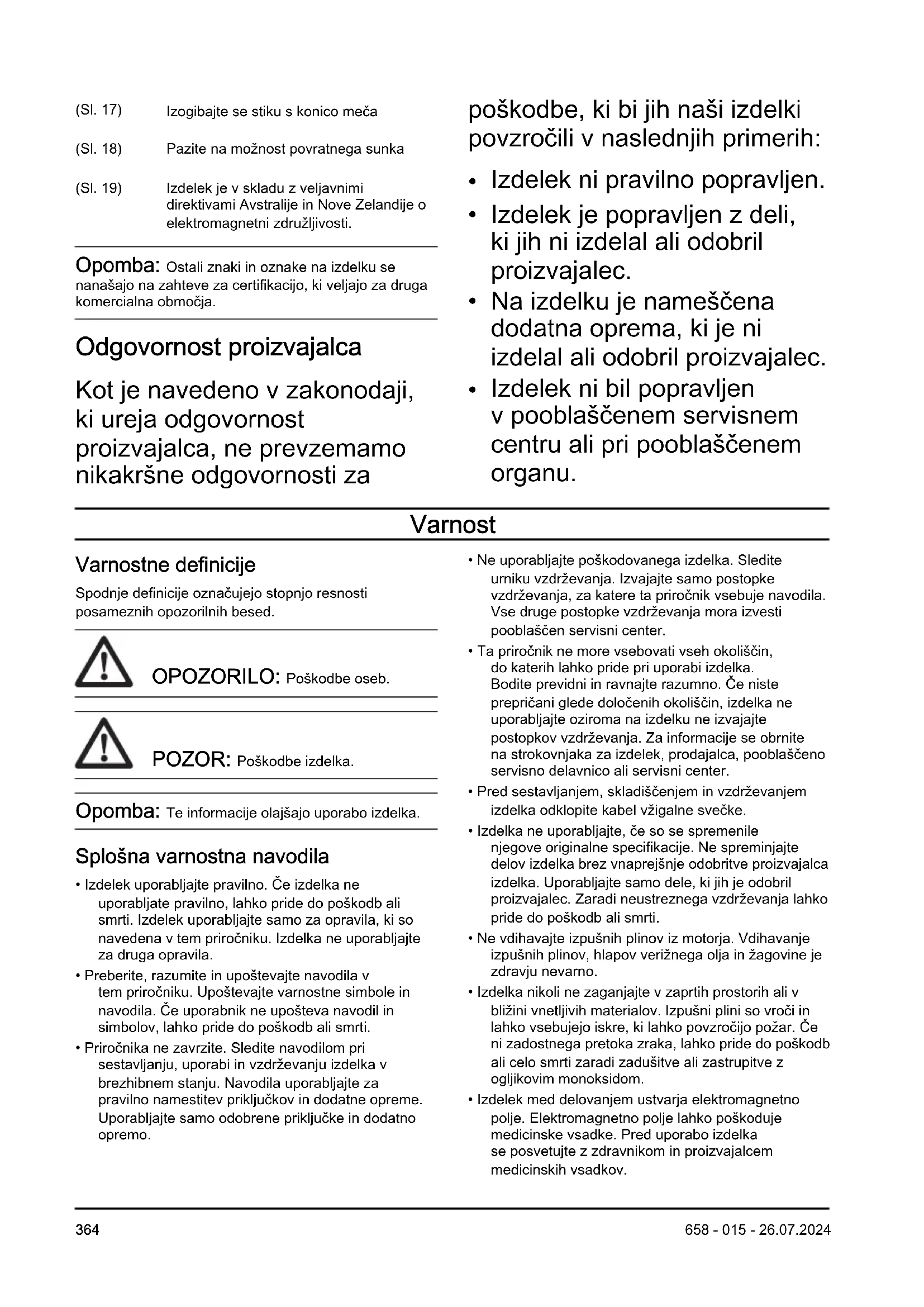 Izogibajte se stiku s konico meča (Sl. 18) Pazite na možnost povratnega sunka (Sl. 19) Izdelek je v skladu z veljavnimi direktivami Avstralije in Nove Zelandije o elektromagnetni združljivosti. Opomba: Ostali znaki in oznake na izdelku se nanašajo na zahteve za certifikacijo, ki veljajo za druga komercialna območja. Odgovornost proizvajalca Kot je navedeno v zakonodaji, ki ureja odgovornost proizvajalca, ne prevzemamo nikakršne odgovornosti za poškodbe, ki bi jih naši izdelki povzročili v naslednjih primerih: