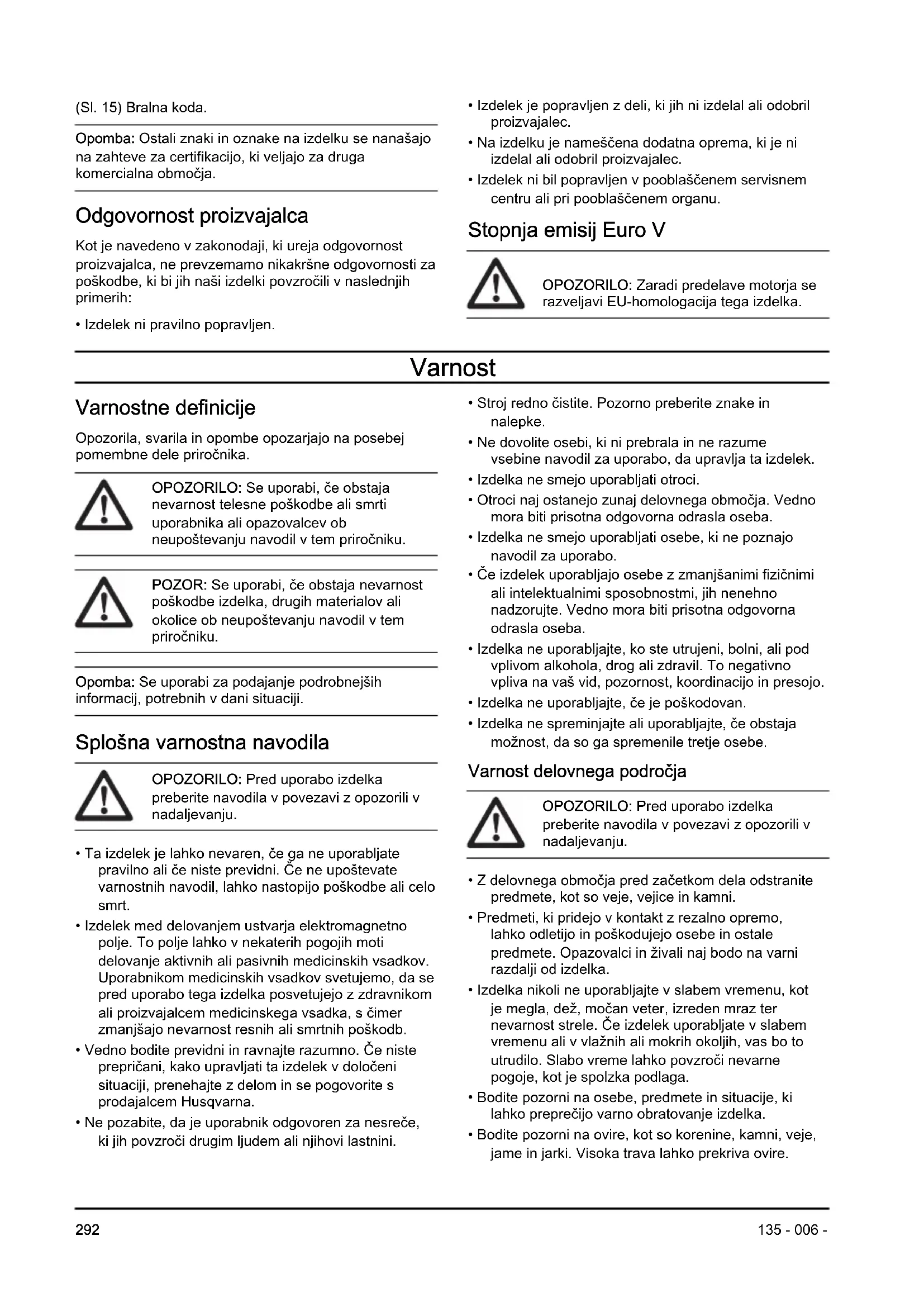 - Izdelek ni bil popravljen v pooblaščenem servisnem centru ali pri pooblaščenem organu. Stopnja emisij Euro V OPOZORILO: Zaradi predelave motorja se razveljavi EU-homologacija tega izdelka. Varnost Varnostne definicije Opozorila, svarila in opombe opozarjajo na posebej pomembne dele priročnika. OPOZORILO: Se uporabi, če obstaja nevarnost telesne poškodbe ali smrti uporabnika ali opazovalcev ob neupoštevanju navodil v tem priročniku. POZOR: Se uporabi, če obstaja nevarnost poškodbe izdelka, drugih materialov ali okolice ob neupoštevanju navodil v tem priročniku. Opomba: Se uporabi za podajanje podrobnejših informacij, potrebnih v dani situaciji. Splošna varnostna navodila OPOZORILO: Pred uporabo izdelka preberite navodila v povezavi z opozorili v nadaljevanju.