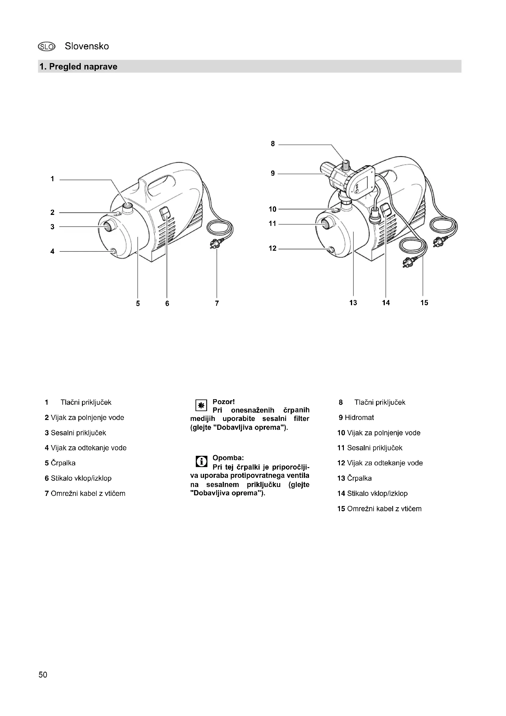 Opomba: Pri tej čr palki je priporočlji- va uporaba protipovratnega ventila na sesalnem priključku (glejte "Dobavljiva oprema"). 8 Tlačni priključek 9 Hidromat 10 Vijak za polnjenje vode 11 Sesalni priključek 12 Vijak za odtekanje vode 13 Črpalka 14 Stikalo vklop/izklop 15 Omrežni kabel z vtičem Izvirna navodila za uporabo Izvirna navodila za uporabo Slovensko51 SLO Slovensko