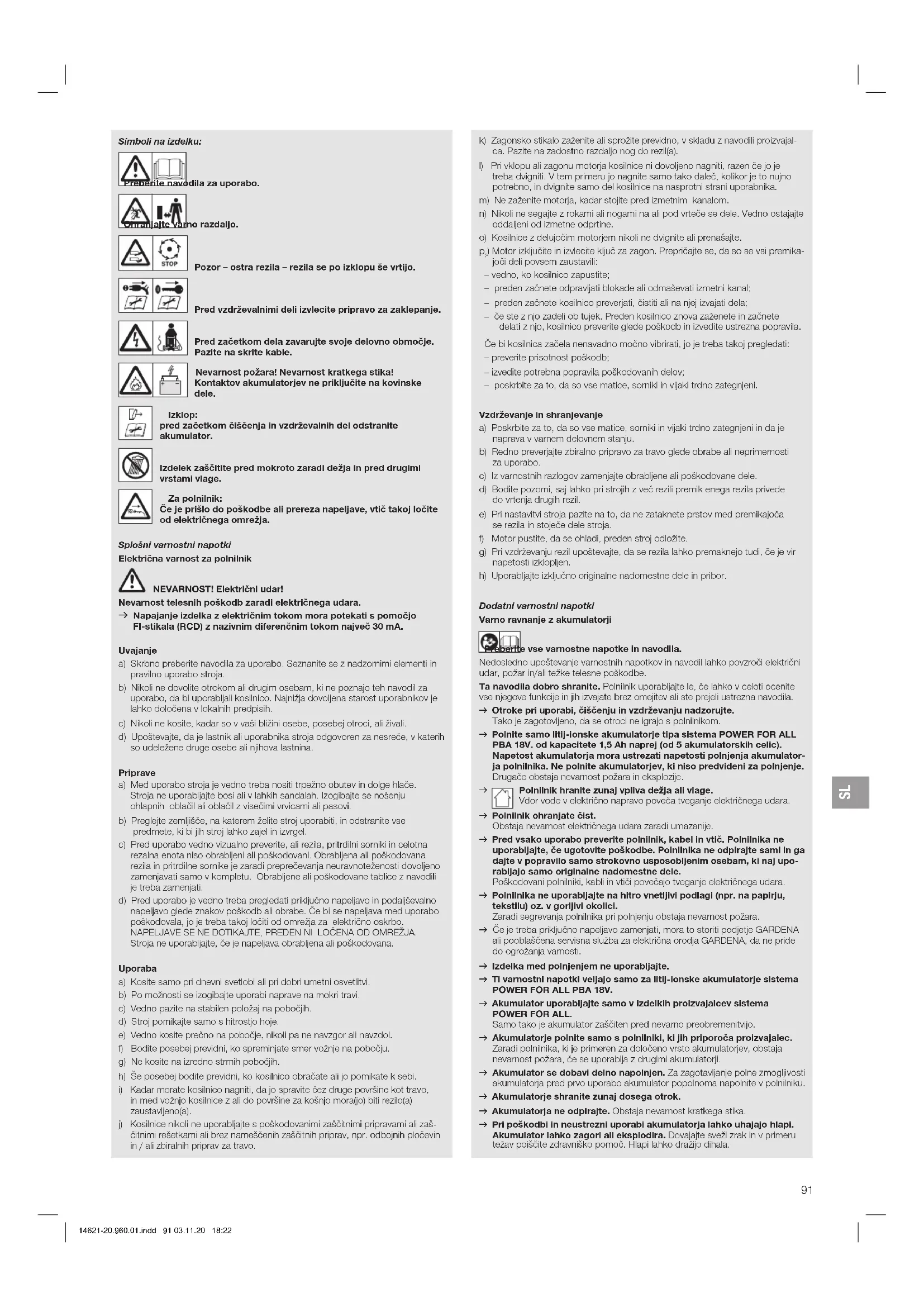 Pred vzdrževalnimi deli izvlecite pripravo za zaklepanje. Pred začetkom dela zavarujte svoje delovno območje. Pazite na skrite kable. Nevarnost požara! Nevarnost kratkega stika! Kontaktov akumulatorjev ne priključite na kovinske dele. Izklop: pred začetkom čiščenja in vzdrževalnih del odstranite akumulator. Izdelek zaščitite pred mokroto zaradi dežja in pred drugimi vrstami vlage. Za polnilnik: Če je prišlo do poškodbe ali prereza napeljave, vtič takoj ločite od električnega omrežja. Splošni varnostni napotki Električna varnost za polnilnik NEVARNOST! Električni udar! Nevarnost telesnih poškodb zaradi električnega udara. v Napajanje izdelka z električnim tokom mora potekati s pomočjo FI-stikala (RCD) z nazivnim diferenčnim tokom največ 30 mA. Uvajanje a) Skrbno preberite navodila za uporabo. Seznanite se z nadzornimi elementi in pravilno uporabo stroja. b) Nikoli ne dovolite otrokom ali drugim osebam, ki ne poznajo teh navodil za uporabo, da bi uporabljali kosilnico. Najnižja dovoljena starost uporabnikov je lahko določena v lokalnih predpisih. c) Nikoli ne kosite, kadar so v vaši bližini osebe, posebej otroci, ali živali. d) Upoštevajte, da je lastnik ali uporabnika stroja odgovoren za nesreče, v katerih so udeležene druge osebe ali njihova lastnina. Priprave a) Med uporabo stroja je vedno treba nositi trpežno obutev in dolge hlače. Stroja ne uporabljajte bosi ali v lahkih sandalah. Izogibajte se nošenju ohlapnih oblačil ali oblačil z visečimi vrvicami ali pasovi. b) Preglejte zemljišče, na katerem želite stroj uporabiti, in odstranite vse predmete, ki bi jih stroj lahko zajel in izvrgel. c) Pred uporabo vedno vizualno preverite, ali rezila, pritrdilni sorniki in celotna rezalna enota niso obrabljeni ali poškodovani. Obrabljena ali poškodovana rezila in pritrdilne sornike je zaradi preprečevanja neuravnoteženosti dovoljeno zamenjavati samo v kompletu. Obrabljene ali poškodovane tablice z navodili jetreba zamenjati. d) Pred uporabo je vedno treba pregledati priključno napeljavo in podaljševalno napeljavo glede znakov poškodb ali obrabe. Če bi se napeljava med uporabo poškodovala, jo je treba takoj ločiti od omrežja za električno oskrbo. NAPELJAVE SE NE DOTIKAJTE, PREDEN NI LOČENA OD OMREŽJA. Stroja ne uporabljajte, če je napeljava obrabljena ali poškodovana. Uporaba a) Kosite samo pri dnevni svetlobi ali pri dobri umetni osvetlitvi. b) Po možnosti se izogibajte uporabi naprave na mokri travi. c) Vedno pazite na stabilen položaj na pobočjih. d) Stroj pomikajte samo s hitrostjo hoje. e) Vedno kosite prečno na pobočje, nikoli pa ne navzgor ali navzdol. f) Bodite posebej previdni, ko spreminjate smer vožnje na pobočju. g) Ne kosite na izredno strmih pobočjih. h) Še posebej bodite previdni, ko kosilnico obračate ali jo pomikate k sebi.
