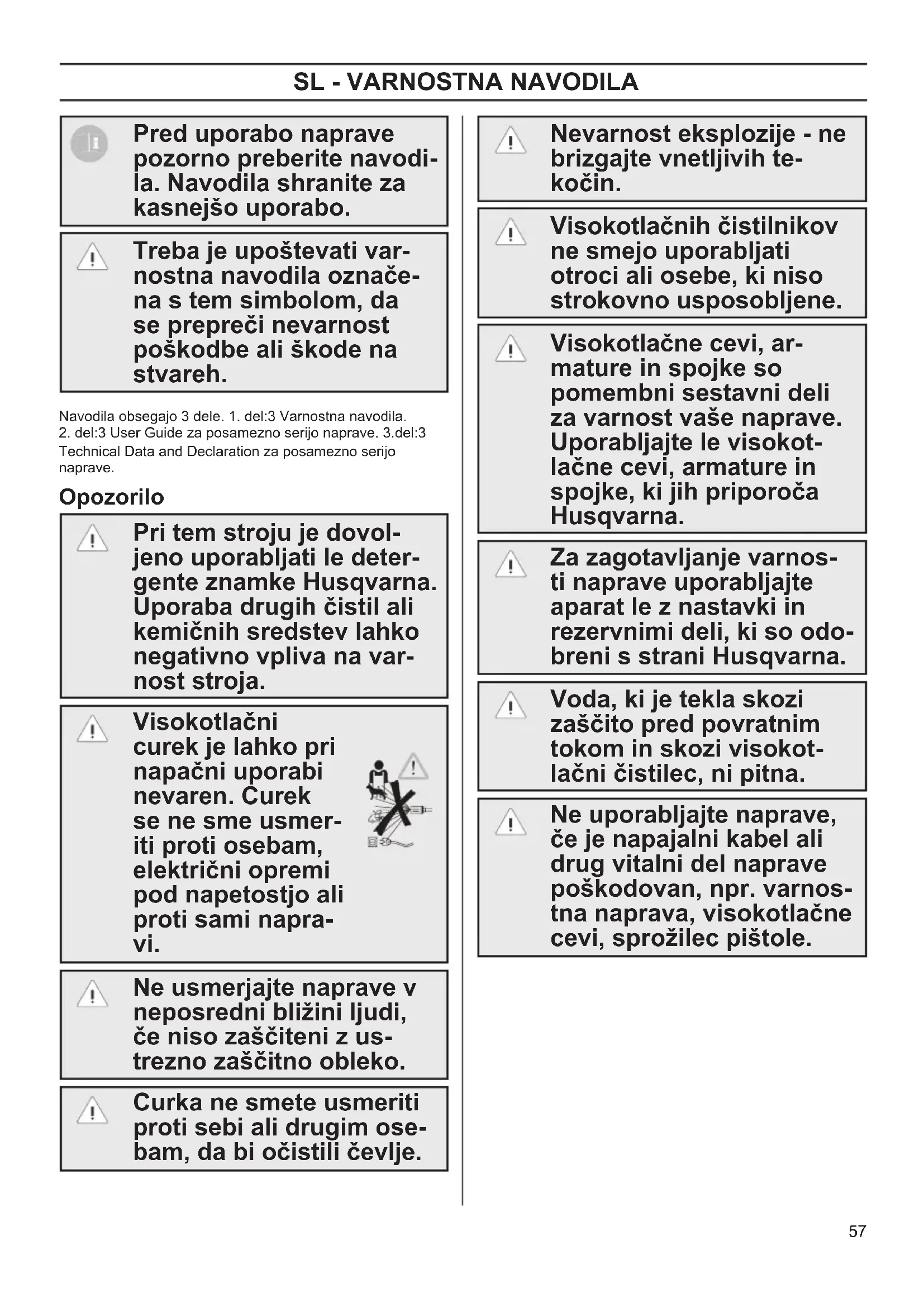 Technical Data and Declaration za posamezno serijo naprave. Opozorilo Pri tem stroju je dovol- jeno uporabljati le deter- gente znamke Husqvarna. Uporaba drugih čistil ali kemičnih sredstev lahko negativno vpliva na var- nost stroja. Visokotlačni curek je lahko pri napačni uporabi nevaren. Curek se ne sme usmer- iti proti osebam, električni opremi pod napetostjo ali proti sami napra- vi. Ne usmerjajte naprave v neposredni bližini ljudi, če niso zaščiteni z us- trezno zaščitno obleko. Curka ne smete usmeriti proti sebi ali drugim ose- bam, da bi očistili čevlje. Nevarnost eksplozije - ne brizgajte vnetljivih te- kočin. Visokotlačnih čistilnikov ne smejo uporabljati otroci ali osebe, ki niso strokovno usposobljene. Visokotlačne cevi, ar- mature in spojke so pomembni sestavni deli za varnost vaše naprave. Uporabljajte le visokot- lačne cevi, armature in spojke, ki jih priporoča Husqvarna. Za zagotavljanje varnos- ti naprave uporabljajte aparat le z nastavki in rezervnimi deli, ki so odo- breni s strani Husqvarna. Voda, ki je tekla skozi zaščito pred povratnim tokom in skozi visokot- lačni čistilec, ni pitna. Ne uporabljajte naprave, če je napajalni kabel ali drug vitalni del naprave poškodovan, npr. varnos- tna naprava, visokotlačne cevi, sprožilec pištole. OM 1-3 Safety FINAL rev 1 draft.indd 57 2017-06-14 13:59:5058