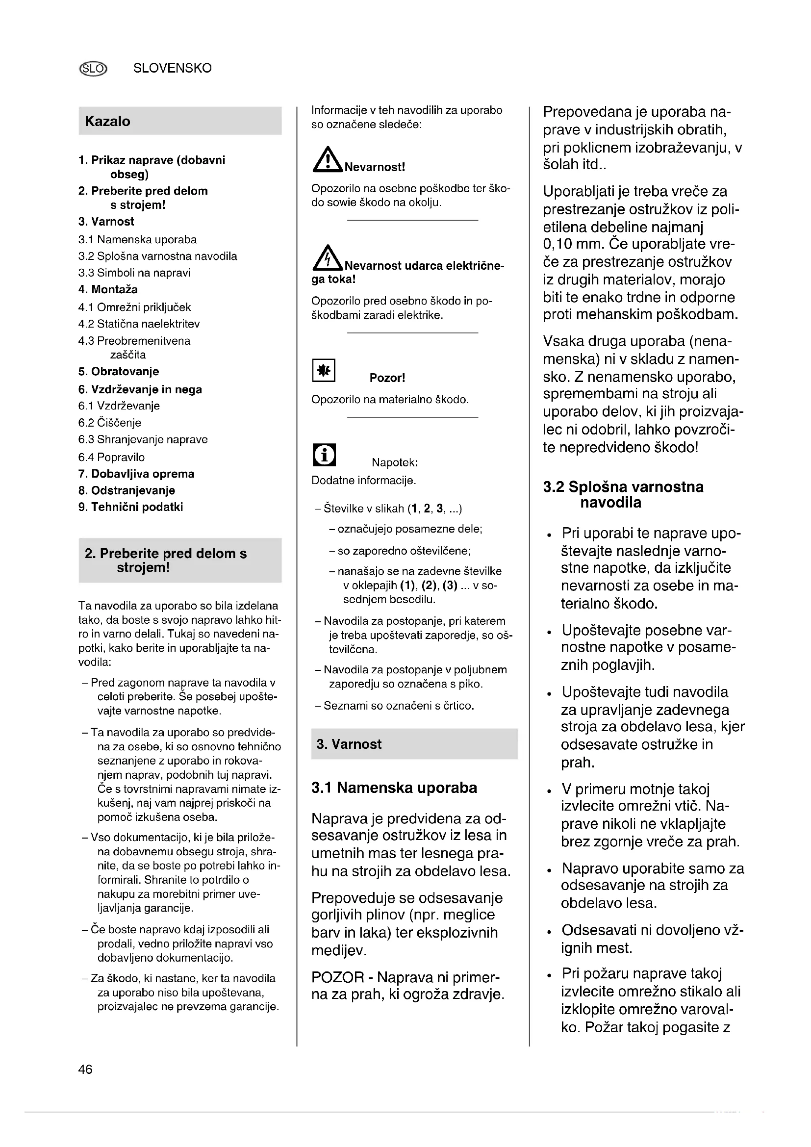 navodila Pri uporabi te naprave upo- števajte naslednje varno- stne napotke, da izključite nevarnosti za osebe in ma- terialno škodo. Upoštevajte posebne var- nostne napotke v posame- znih poglavjih. Upoštevajte tudi navodila za upravljanje zadevnega stroja za obdelavo lesa, kjer odsesavate ostružke in prah. V primeru motnje takoj izvlecite omrežni vtič. Na- prave nikoli ne vklapljajte brez zgornje vreče za prah. Napravo uporabite samo za odsesavanje na strojih za obdelavo lesa. Odsesavati ni dovoljeno vž- ignih mest. Pri požaru naprave takoj izvlecite omrežno stikalo ali izklopite omrežno varoval- ko. Požar takoj pogasite z Kazalo