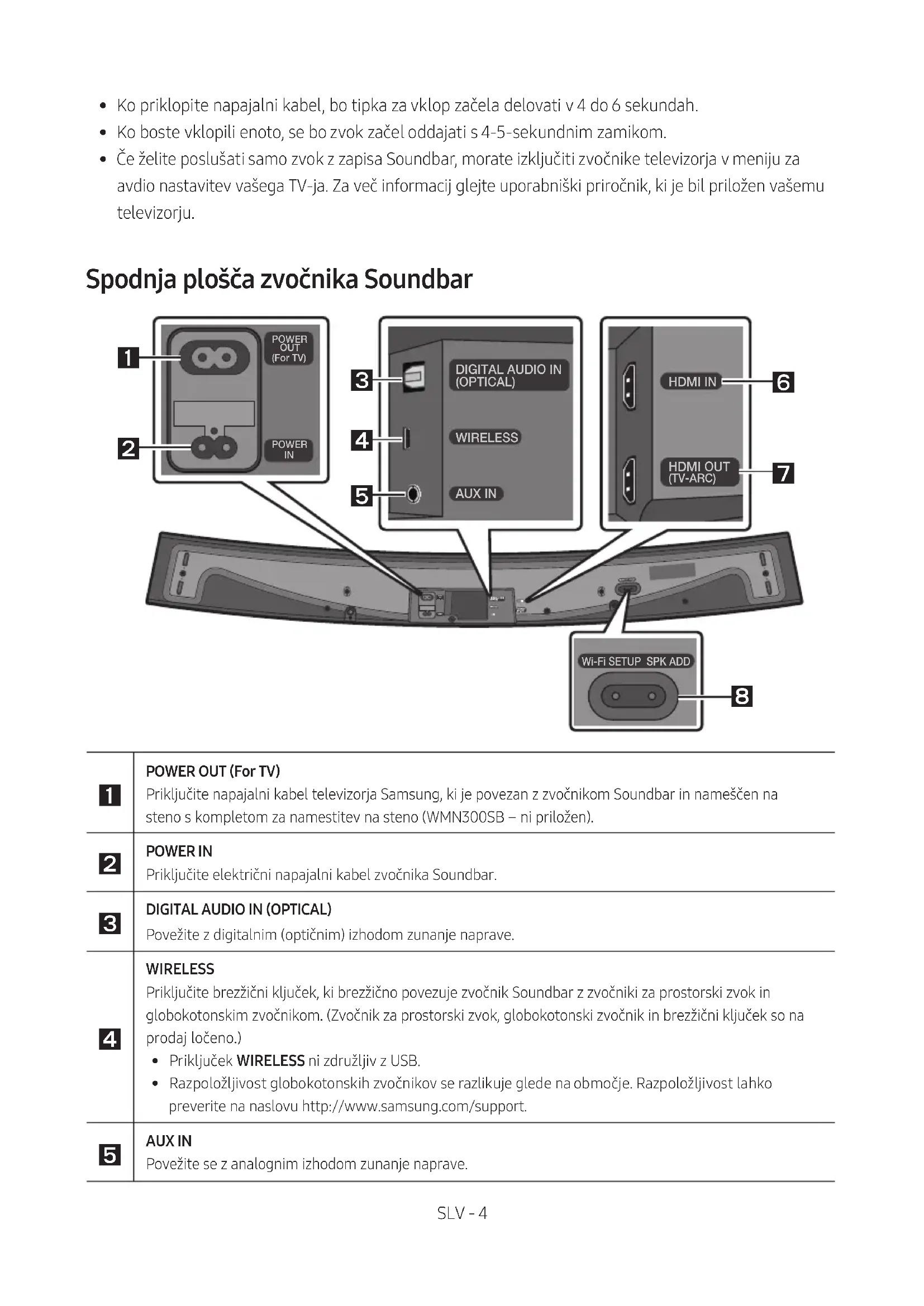 - Priključek POWER OUT lahko povežete samo s televizorji Samsung, ki uporabljajo 2-pinski napajalni kabel in porabljajo 400 W ali manj. (Če priključek povežete z napravo, ki porablja več kot 400 W, se lahko zvočnik Soundbar poškoduje ali neha delovati.) Za seznam televizorjev Samsung, ki so združljivi s kompletom za namestitev na steno WMN300SB in priključkom POWER OUT, si oglejte uporabniški priročnik za Komplet za namestitev na steno WMN300SB. Priročnik si lahko ogledate v spletu na naslovu http://www.samsung.com/support.SLV - 7
