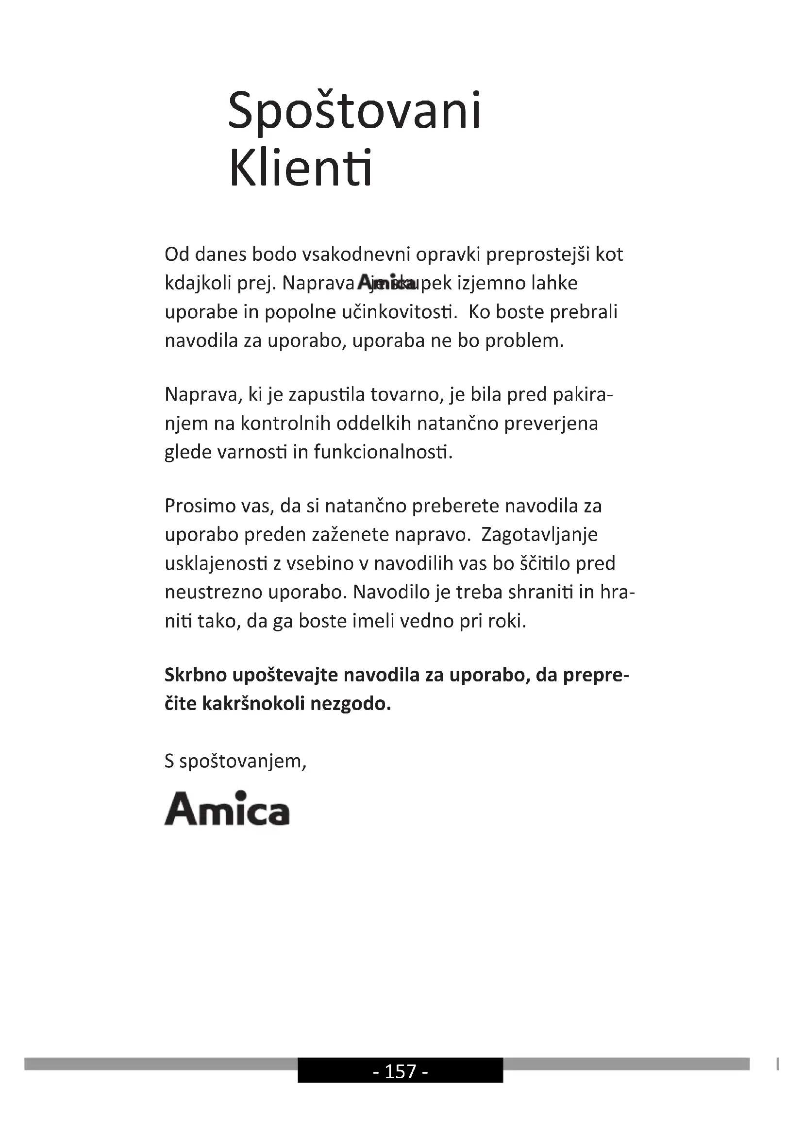 - uredbe RoHS 2011/65/EC i zato je proizvod označen te je izdana izjava o sukladnosti koja je dostupna ustanovama za nadzor tržišta.- 157 - Spoštovani Klien Od danes bodo vsakodnevni opravki preprostejši kot kdajkoli prej. Naprava je skupek izjemno lahke uporabe in popolne učinkovitos. Ko boste prebrali navodila za uporabo, uporaba ne bo problem. Naprava, ki je zapusla tovarno, je bila pred pakira- njem na kontrolnih oddelkih natančno preverjena glede varnos in funkcionalnos. Prosimo vas, da si natančno preberete navodila za uporabo preden zaženete napravo. Zagotavljanje usklajenos z vsebino v navodilih vas bo ščilo pred neustrezno uporabo. Navodilo je treba shrani in hra- ni tako, da ga boste imeli vedno pri roki. Skrbno upoštevajte navodila za uporabo, da prepre- čite kakršnokoli nezgodo. S spoštovanjem,- 158 -