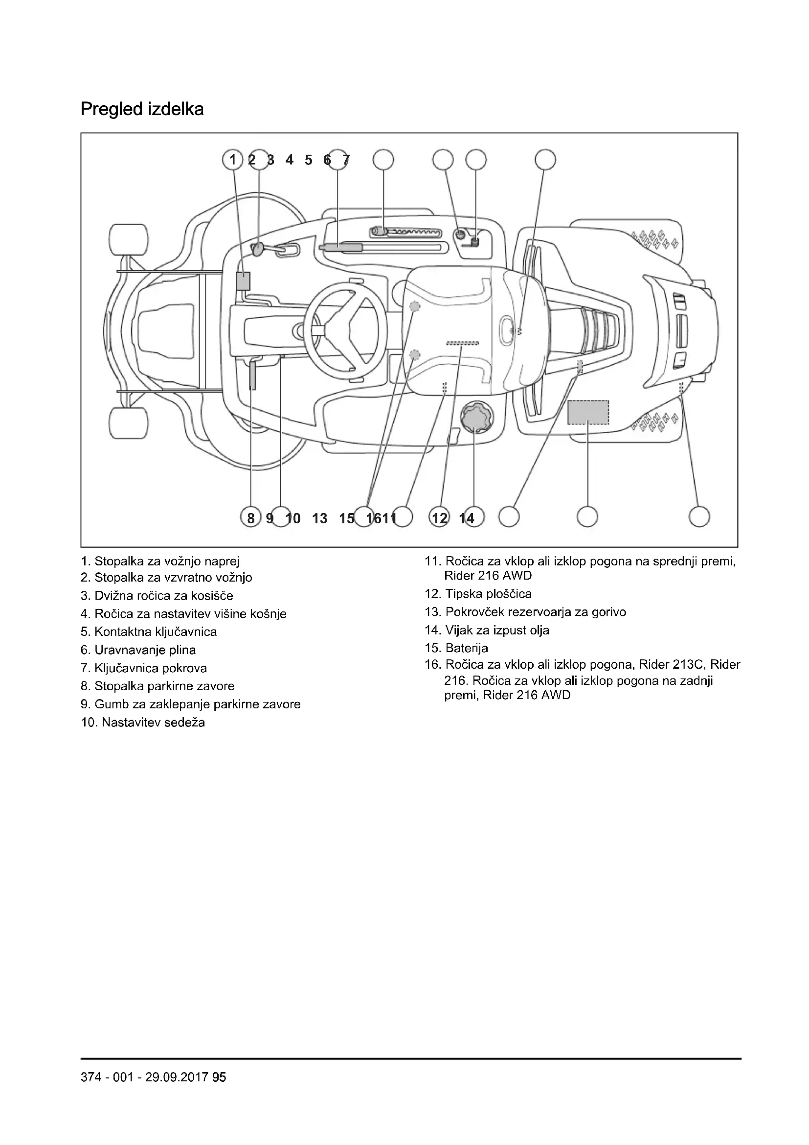 Motor: Menjalnik: Opis izdelka Rider 213C, Rider 216 in Rider 216 AWD sta sedežni kosilnici. Pedala za vožnjo naprej in vzvratno vožnjo vozniku omogočata brezstopenjsko nastavljanje hitrosti. Rider 216 AWD je opremljena s pogonom na vsa kolesa. Rider 213C, Rider 216 in Rider 216 AWD se uporabljata s kosišči Combi s sistemom BioClip. Namen uporabe Izdelek je izdelan za košnjo trave na odprtih in ravnih tleh v stanovanjskih območjih in vrtovih. če želite izdelek uporabljati za druga opravila, namestite izbirno dodatno opremo. Če želite izvedeti več o razpoložljivi dodatni opremi se obrnite na prodajalca podjetja Husqvarna. Zavarujte svoj izdelek Sklenite zavarovalno polico za svoj nov izdelek. V primeru negotovosti se obrnite na svojo zavarovalnico. Priporočamo celostno zavarovanje, vključno z zavarovanjem za tretje osebe, požar, poškodbe, krajo in vandalizem. 94 374 - 001 - 29.09.2017Pregled izdelka