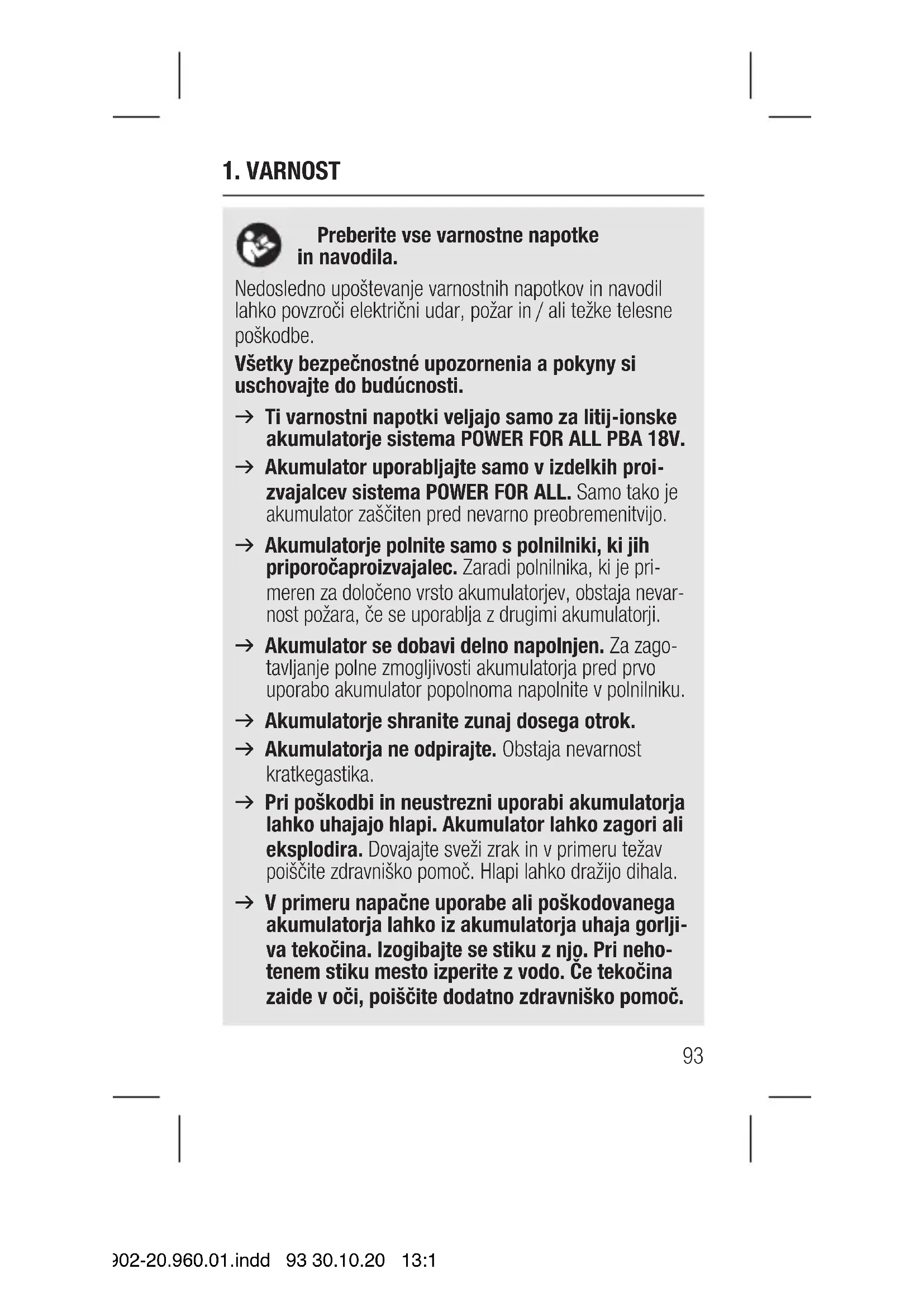 14902-20.960.01.indd 92 30.10.20 13:191. VARNOST Preberite vse varnostne napotke in navodila. Nedosledno upoštevanje varnostnih napotkov in navodil lahko povzroči električni udar, požar in / ali težke telesne poškodbe. Všetky bezpečnostné upozornenia a pokyny si uschovajte do budúcnosti. v Ti varnostni napotki veljajo samo za litij-ionske akumulatorje sistema POWER FOR ALL PBA 18V. v Akumulator uporabljajte samo v izdelkih proi- zvajalcev sistema POWER FOR ALL. Samo tako je akumulator zaščiten pred nevarno preobremenitvijo. v Akumulatorje polnite samo s polnilniki, ki jih priporoča proizvajalec. Zaradi polnilnika, ki je pri- meren za določeno vrsto akumulatorjev, obstaja nevar- nost požara, če se uporablja z drugimi akumulatorji. v Akumulator se dobavi delno napolnjen. Za zago- tavljanje polne zmogljivosti akumulatorja pred prvo uporabo akumulator popolnoma napolnite v polnilniku. v Akumulatorje shranite zunaj dosega otrok. v Akumulatorja ne odpirajte. Obstaja nevarnost kratkega stika. v Pri poškodbi in neustrezni uporabi akumulatorja lahko uhajajo hlapi. Akumulator lahko zagori ali eksplodira. Dovajajte sveži zrak in v primeru težav poiščite zdravniško pomoč. Hlapi lahko dražijo dihala. v V primeru napačne uporabe ali poškodovanega akumulatorja lahko iz akumulatorja uhaja gorlji- va tekočina. Izogibajte se stiku z njo. Pri neho- tenem stiku mesto izperite z vodo. Če tekočina zaide v oči, poiščite dodatno zdravniško pomoč.