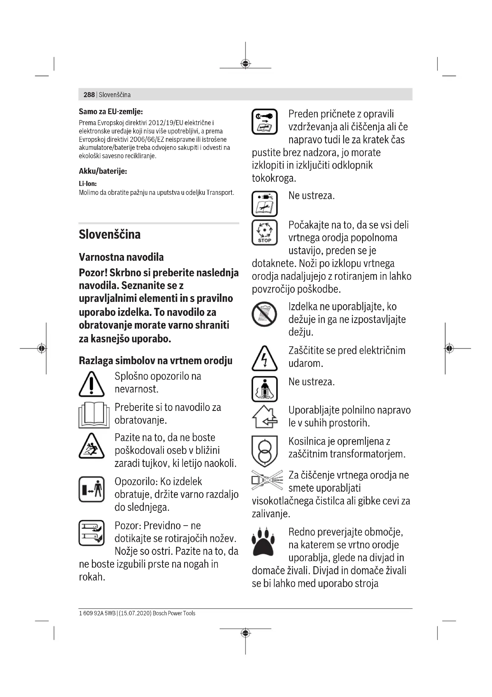 Prikazan ali opisan pribor ni del standardnega obsega dobave. Celoten pribor je del našega programa pribora. Zagon Za vašo varnost u Pozor! Pred začetkom opravil vzdrževanja ali čiščenja izklopite vrtno orodje, izključite odklopnik tokokroga in odstranite akumulatorsko baterijo. Enako velja v primeru, ko je kabel stikala poškodovan, narezan ali zamotan. u Po izključitvi vrtnega orodja se vrtijo noži še nekaj sekund naprej. u Pozor: Ne dotikajte se vrtečega rezalnega noža. Bosch Power Tools 1 609 92A 5WB | (15.07.2020)296 | Slovenščina Polnjenje akumulatorske baterije Akumulatorska baterija je opremljena z nadzorom temperature, ki dovoljuje polnjenje le v temperaturnem območju med 0 °C in 35 °C. Tako je zagotovljena dolga življenjska doba akumulatorske baterije. Napotek: Akumulatorska baterija je pri dobavi delno napolnjena. Da bi lahko akumulatorska baterija razvila svojo polno zmogljivost, jo morate pred prvo uporabo v celoti napolniti v polnilni napravi. Litij-ionsko akumulatorsko baterijo lahko kadarkoli napolnite, ne da bi pri tem skrajšali življenjsko dobo. Prekinitev postopka polnjenja akumulatorske baterije ne poškoduje. Litij-ionska akumulatorska baterija je zaščitena pred prekomerno izpraznitvijo s sistemom elektronske zaščite celic "Electronic Cell Protection (ECP)". Pri izpraznjeni akumulatorski bateriji zaščitno stikalo izklopi izdelek: Vrtno orodje preneha delovati. Vklopno/izklopnega stikala po samodejnem izklopu izdelka ne smete več pritiskati. S tem lahko poškodujete akumulatorsko baterijo. Upoštevajte navodila za odstranjevanje akumulatorskih baterij. Namestitev/odstranitev akumulatorske baterije Opozorilo: Če uporabljate akumulatorske baterije, ki niso primerne, lahko to povzroči poškodbo naprave. Vstavite napolnjeno akumulatorsko baterijo. Zagotovite, da bo akumulatorska baterija v celoti vstavljena. Za odstranitev akumulatorske baterije iz naprave, pritisnite deblokirno tipko akumulatorske baterije in potegnite akumulatorsko baterijo ven. Postopek polnjenja Polnilni postopek se prične takoj, ko vtaknete omrežni vtič polnilne naprave v vtičnico in vstavite akumulatorsko baterijo v polnilno napravo . Inteligentni postopek polnjenja omogoča takojšnje zaznavanje napolnjenosti akumulatorske baterije in odvisno od temperature in napetosti akumulatorske baterije se bo izbral optimalni polnilni tok. Ta način zagotavlja ohranitev akumulatorske baterije, ki bo pri namestitvi v polnilni napravi vedno do konca napolnjen. Pomen prikazovalnih elementov na polnilni napravi (AL 3620 CV/AL 3640 CV/AL 36V-20) Postopek hitrega polnjenja Postopek hitrega polnjenja se prikaže z utripanjem zelenega prikaza polnjenja akumulatorske baterije. Prikazovalni element na akumulatorski bateriji: Med postopkom napolnitve zasvetijo LED druga za drugo in za kratek čas izginejo. Akumulatorska baterija je v celoti napolnjena, kadar LED trajno svetijo. Pribl. 5minut po polni popolni napolnitvi akumulatorske baterije tri zelene LED ponovno ugasnejo. Opozorilo: Postopek hitrega polnjenja je možen samo, ko se temperatura akumulatorske baterije nahaja v dovoljenem območju temperature, glejte poglavje "Tehnični podatki". Akumulatorska baterija je napolnjena Trajno svetleč zelen prikaz LED signalizira, da je akumulatorska baterija v celoti napolnjena. Dodatno zaslišite za obdobje pribl. 2 sekundi zvočni signal, ki tudi akustično signalizira popolno napolnjenost akumulatorske baterije. Sedaj lahko vzamete akumulatorsko baterijo ven in jo uporabite. Brez vstavljene akumulatorske baterije signalizira trajno svetleč prikaz LED, da je omrežni vtič vstavljen v vtičnico in da je polnilna naprava pripravljena za uporabo. Temperatura akumulatorske baterije pod 0° ali nad 45°C Trajno svetleč rdeč prikaz LED prikazuje, da je temperatura akumulatorske baterije izven dovoljenega temperaturnega območja za polnjenje, glejte odstavek "Tehnični podatki". Pri dosegu dovoljenega območja temperature se polnilna naprava avtomatsko preklopi na postopek za hitro polnjenje. Če se temperatura akumulatorske baterije nahaja zunaj dovoljenega območja temperature za polnjenje, se pri vstavljanju v polnilno napravo zasveti rdeča LED akumulatorske baterije. Polnjenje ni možno Če se pri postopku polnjenja pojavi druga motnja, se to prikaže z utripanjem rdečega prikaza LED. Postopek polnjenja se ne more zagnati in polnjenje akumulatorske baterije ni možno (glejte odsek "Iskanje napak"). Opozorila glede polnjenja Pri neprekinjenih oziroma zaporednih ciklusih polnjenja brez vmesne prekinitve se lahko polnilnik segreje. Vendar to ni problematično in ne pomeni, da ima polnilnik kakšno tehnično okvaro. Močno skrajšan čas delovanja po napolnitvi nakazuje, da je akumulatorska baterija izrabljena in se mora nadomestiti. Upoštevajte navodila za odstranjevanje odsluženih naprav. Hlajenje akumulatorske baterije (Active Air Cooling) Upravljalnik ventilatorja, ki je vgrajen v polnilnik, nadzira temperaturo vstavljene akumulatorske baterije. Če je temperatura akumulatorske baterije nad 30 °C, se akumulatorska baterija ohlajuje s pomočjo ventilatorja na optimalno temperaturo za polnjenje. Ko je ventilator vklopljen, se sliši zvok prezračevalne enote. Če ventilator ne deluje, je temperatura akumulatorske baterije v optimalnem temperaturnem območju za polnjenje ali pa je ventilator v okvari. V tem primeru se podaljša čas polnjenja akumulatorske baterije. 1 609 92A 5WB | (15.07.2020) Bosch Power ToolsSlovenščina | 297 Delovna navodila Prikaz napolnjenosti akumulatorske baterije Akumulatorska baterija je obremljena s prikazovalnikom napolnjenosti, ki prikazuje stanje napolnjenosti akumulatorske baterije. Prikazovalnik napolnjenosti sestoji iz 3 zelenih LED. Pritisnite tipko za prikazovalnik stanja napolnjenosti in ga s tem aktivirajte. 5sek. se prikazovalnik stanja napolnjenosti samostojno ugasne. Stanje napolnjenosti lahko preverite tudi, ko akumulatorska baterija ni v nap