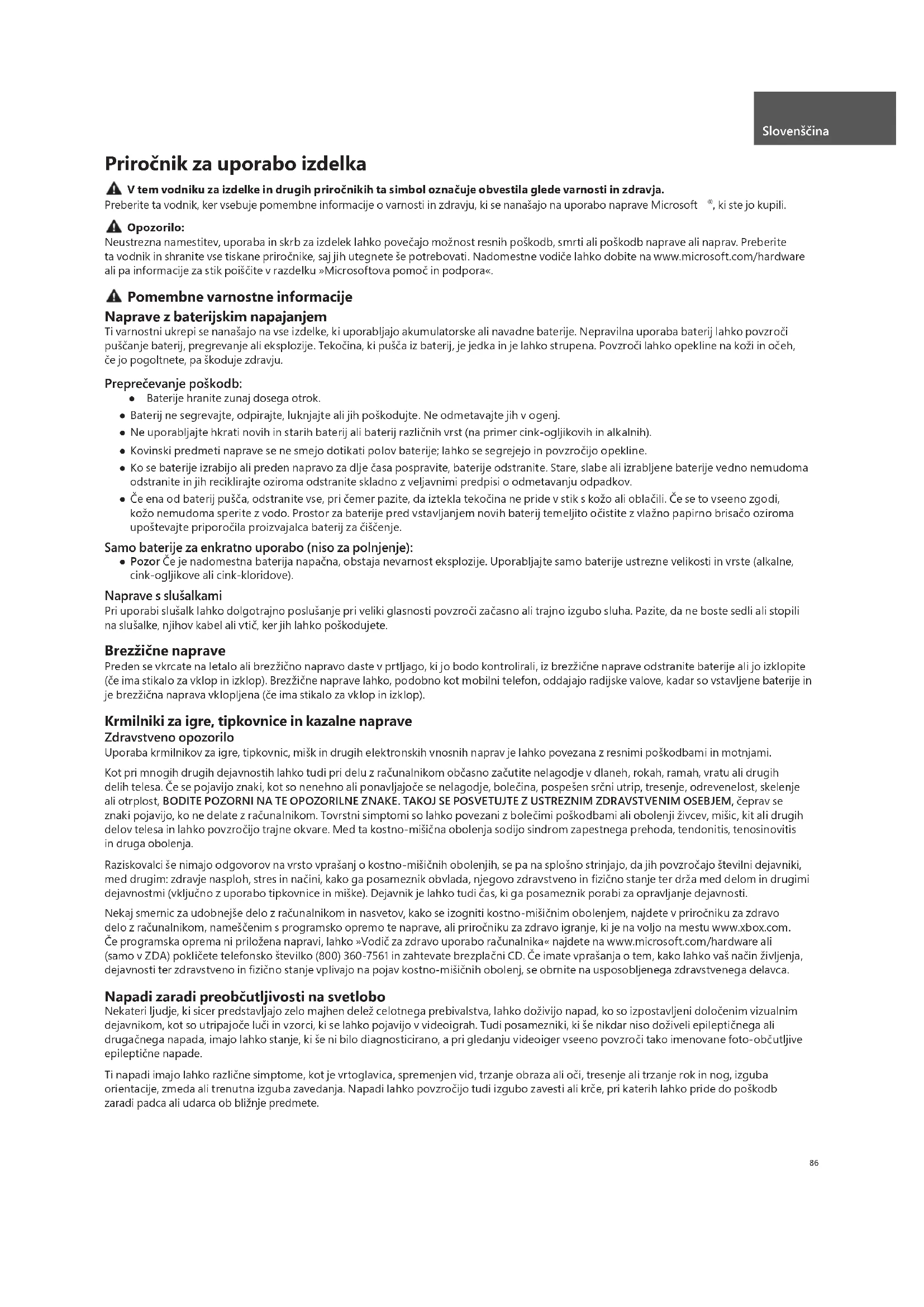 , ki ste jo kupili. Opozorilo: Neustrezna namestitev, uporaba in skrb za izdelek lahko povečajo možnost resnih poškodb, smrti ali poškodb naprave ali naprav. Preberite ta vodnik in shranite vse tiskane priročnike, saj jih utegnete še potrebovati. Nadomestne vodiče lahko dobite na www.microsoft.com/hardware ali pa informacije za stik poiščite v razdelku »Microsoftova pomoč in podpora«. Pomembne varnostne informacije Naprave z baterijskim napajanjem Ti varnostni ukrepi se nanašajo na vse izdelke, ki uporabljajo akumulatorske ali navadne baterije. Nepravilna uporaba baterij lahko povzroči puščanje baterij, pregrevanje ali eksplozije. Tekočina, ki pušča iz baterij, je jedka in je lahko strupena. Povzroči lahko opekline na koži in očeh, če jo pogoltnete, pa škoduje zdravju. Preprečevanje poškodb: ● Baterije hranite zunaj dosega otrok. ● Baterij ne segrevajte, odpirajte, luknjajte ali jih poškodujte. Ne odmetavajte jih v ogenj. ● Ne uporabljajte hkrati novih in starih baterij ali baterij različnih vrst (na primer cink-ogljikovih in alkalnih). ● Kovinski predmeti naprave se ne smejo dotikati polov baterije; lahko se segrejejo in povzročijo opekline. ● Ko se baterije izrabijo ali preden napravo za dlje časa pospravite, baterije odstranite. Stare, slabe ali izrabljene baterije vedno nemudoma odstranite in jih reciklirajte oziroma odstranite skladno z veljavnimi predpisi o odmetavanju odpadkov. ●Če ena od baterij pušča, odstranite vse, pri čemer pazite, da iztekla tekočina ne pride v stik s kožo ali oblačili. Če se to vseeno zgodi, kožo nemudoma sperite z vodo. Prostor za baterije pred vstavljanjem novih baterij temeljito očistite z vlažno papirno brisačo oziroma upoštevajte priporočila proizvajalca baterij za čiščenje. Samo baterije za enkratno uporabo (niso za polnjenje): ● Pozor Če je nadomestna baterija napačna, obstaja nevarnost eksplozije. Uporabljajte samo baterije ustrezne velikosti in vrste (alkalne, cink-ogljikove ali cink-kloridove). Naprave s slušalkami Pri uporabi slušalk lahko dolgotrajno poslušanje pri veliki glasnosti povzroči začasno ali trajno izgubo sluha. Pazite, da ne boste sedli ali stopili na slušalke, njihov kabel ali vtič, ker jih lahko poškodujete. Brezžične naprave Preden se vkrcate na letalo ali brezžično napravo daste v prtljago, ki jo bodo kontrolirali, iz brezžične naprave odstranite baterije ali jo izklopite (če ima stikalo za vklop in izklop). Brezžične naprave lahko, podobno kot mobilni telefon, oddajajo radijske valove, kadar so vstavljene baterije in je brezžična naprava vklopljena (če ima stikalo za vklop in izklop). Krmilniki za igre, tipkovnice in kazalne naprave Zdravstveno opozorilo Uporaba krmilnikov za igre, tipkovnic, mišk in drugih elektronskih vnosnih naprav je lahko povezana z resnimi poškodbami in motnjami. Kot pri mnogih drugih dejavnostih lahko tudi pri delu z računalnikom občasno začutite nelagodje v dlaneh, rokah, ramah, vratu ali drugih delih telesa. Če se pojavijo znaki, kot so nenehno ali ponavljajoče se nelagodje, bolečina, pospešen srčni utrip, tresenje, odrevenelost, skelenje ali otrplost, BODITE POZORNI NA TE OPOZORILNE ZNAKE. TAKOJ SE POSVETUJTE Z USTREZNIM ZDRAVSTVENIM OSEBJEM, čeprav se znaki pojavijo, ko ne delate z računalnikom. Tovrstni simptomi so lahko povezani z bolečimi poškodbami ali obolenji živcev, mišic, kit ali drugih delov telesa in lahko povzročijo trajne okvare. Med ta kostno-mišična obolenja sodijo sindrom zapestnega prehoda, tendonitis, tenosinovitis in druga obolenja. Raziskovalci še nimajo odgovorov na vrsto vprašanj o kostno-mišičnih obolenjih, se pa na splošno strinjajo, da jih povzročajo številni dejavniki, med drugim: zdravje nasploh, stres in načini, kako ga posameznik obvlada, njegovo zdravstveno in fi zično stanje ter drža med delom in drugimi dejavnostmi (vključno z uporabo tipkovnice in miške). Dejavnik je lahko tudi čas, ki ga posameznik porabi za opravljanje dejavnosti. Nekaj smernic za udobnejše delo z računalnikom in nasvetov, kako se izogniti kostno-mišičnim obolenjem, najdete v priročniku za zdravo delo z računalnikom, nameščenim s programsko opremo te naprave, ali priročniku za zdravo igranje, ki je na voljo na mestu www.xbox.com. Če programska oprema ni priložena napravi, lahko »Vodič za zdravo uporabo računalnika« najdete na www.microsoft.com/hardware ali (samo v ZDA) pokličete telefonsko številko (800) 360-7561 in zahtevate brezplačni CD. Če imate vprašanja o tem, kako lahko vaš način življenja, dejavnosti ter zdravstveno in fi zično stanje vplivajo na pojav kostno-mišičnih obolenj, se obrnite na usposobljenega zdravstvenega delavca. Napadi zaradi preobčutljivosti na svetlobo Nekateri ljudje, ki sicer predstavljajo zelo majhen delež celotnega prebivalstva, lahko doživijo napad, ko so izpostavljeni določenim vizualnim dejavnikom, kot so utripajoče luči in vzorci, ki se lahko pojavijo v videoigrah. Tudi posamezniki, ki še nikdar niso doživeli epileptičnega ali drugačnega napada, imajo lahko stanje, ki še ni bilo diagnosticirano, a pri gledanju videoiger vseeno povzroči tako imenovane foto-občutljive epileptične napade. Ti napadi imajo lahko različne simptome, kot je vrtoglavica, spremenjen vid, trzanje obraza ali oči, tresenje ali trzanje rok in nog, izguba orientacije, zmeda ali trenutna izguba zavedanja. Napadi lahko povzročijo tudi izgubo zavesti ali krče, pri katerih lahko pride do poškodb zaradi padca ali udarca ob bližnje predmete. Slovenščina87 Če se pojavi kateri koli od teh simptomov, nemudoma prekinite igranje in se posvetujte z zdravnikom. Starši naj bodo pozorni na navedene simptome in o njih vprašajo otroke – otroci in najstniki so bolj izpostavljeni tveganju kot odrasli. Tveganje epileptičnih napadov zaradi občutljivosti na svetlobo je mogoče zmanjšati s temi ukrepi: ● Sedenje dlje od televizijskega zaslona. ● Upor