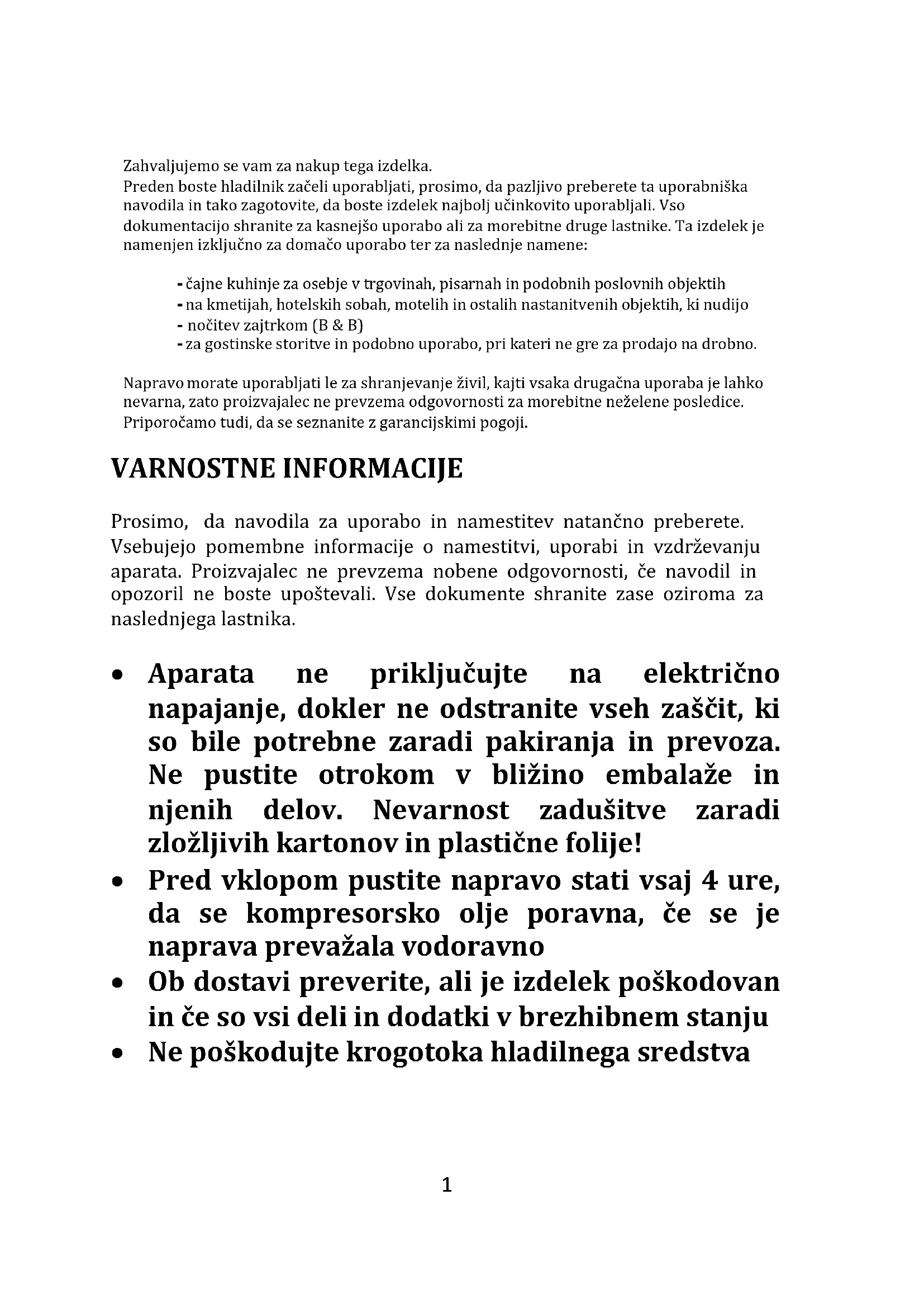 VSEBINA 1.Varnostne informacijeVARNOSTNE INFORMACIJE 2 Opis AparataS APARATA 3.Obračanie vrat 4.InstalacjaSTALACIJA 5.Dnevna uporabaVSAKODNEVNA UPORABA StrRAN 1-9 Str 10 Str 11-14 Str 15-16 Str 17-22Zahvaljujemo se vam za nakup tega izdelka. Preden boste hladilnik začeli uporabljati, prosimo, da pazljivo preberete ta uporabniška navodila in tako zagotovite, da boste izdelek najbolj učinkovito uporabljali. Vso dokumentacijo shranite za kasnejšo uporabo ali za morebitne druge lastnike. Ta izdelek je namenjen izključno za domačo uporabo ter za naslednje namene: - čajne kuhinje za osebje v trgovinah, pisarnah in podobnih poslovnih objektih - na kmetijah, hotelskih sobah, motelih in ostalih nastanitvenih objektih, ki nudijo - nočitev zajtrkom (B & B) - za gostinske storitve in podobno uporabo, pri kateri ne gre za prodajo na drobno. Napravo morate uporabljati le za shranjevanje živil, kajti vsaka drugačna uporaba je lahko nevarna, zato proizvajalec ne prevzema odgovornosti za morebitne neželene posledice. Priporočamo tudi, da se seznanite z garancijskimi pogoji. VARNOSTNE INFORMACIJE Prosimo, da navodila za uporabo in namestitev natančno preberete. Vsebujejo pomembne informacije o namestitvi, uporabi in vzdrževanju aparata. Proizvajalec ne prevzema nobene odgovornosti, če navodil in opozoril ne boste upoštevali. Vse dokumente shranite zase oziroma za naslednjega lastnika.