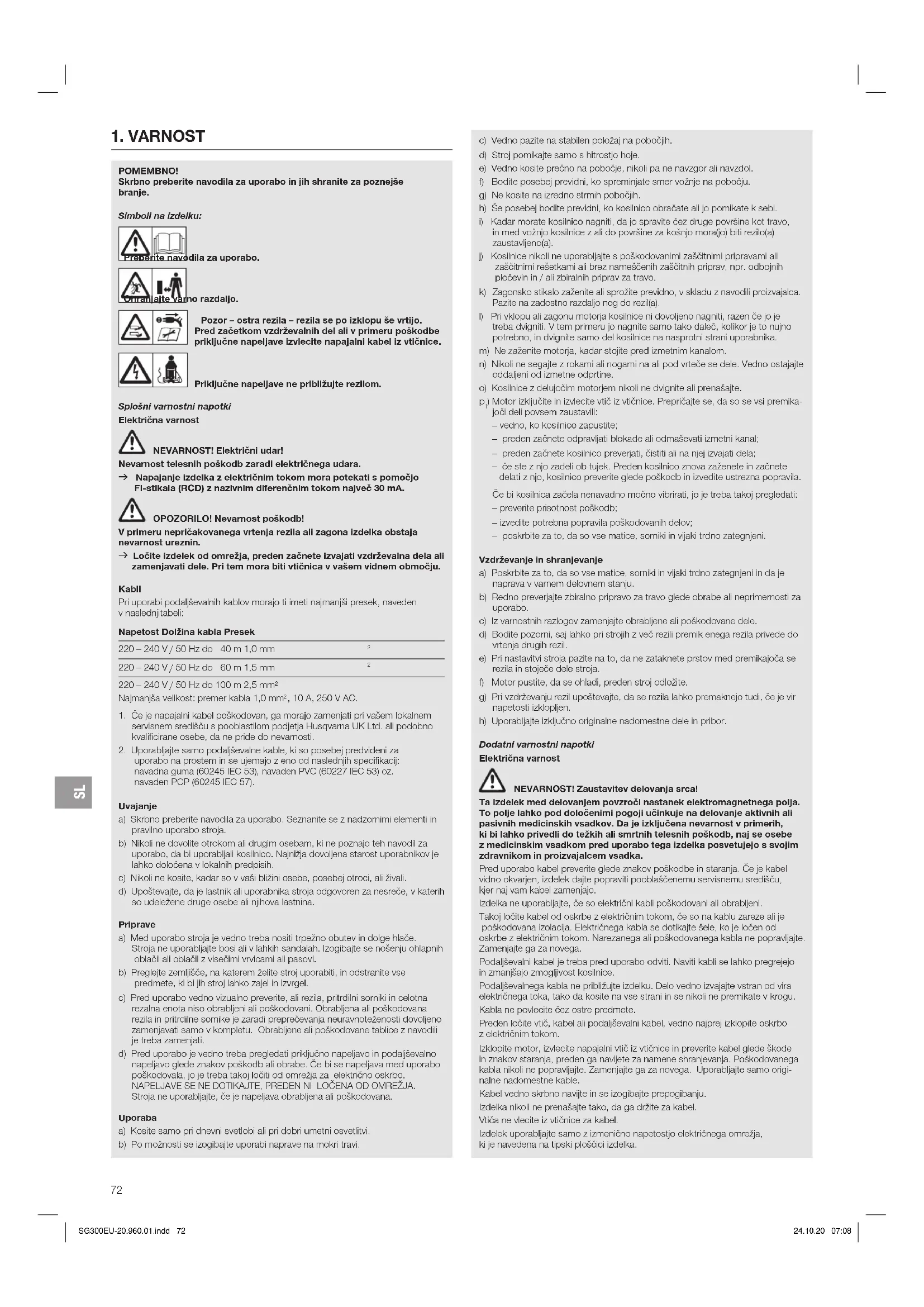 ) Motor izključite in izvlecite vtič iz vtičnice. Prepričajte se, da so se vsi premika- joči deli povsem zaustavili: – vedno, ko kosilnico zapustite; – preden začnete odpravljati blokade ali odmaševati izmetni kanal; – preden začnete kosilnico preverjati, čistiti ali na njej izvajati dela; – če ste z njo zadeli ob tujek. Preden kosilnico znova zaženete in začnete delati z njo, kosilnico preverite glede poškodb in izvedite ustrezna popravila. Če bi kosilnica začela nenavadno močno vibrirati, jo je treba takoj pregledati: – preverite prisotnost poškodb; – izvedite potrebna popravila poškodovanih delov; – poskrbite za to, da so vse matice, sorniki in vijaki trdno zategnjeni. Vzdrževanje in shranjevanje a) Poskrbite za to, da so vse matice, sorniki in vijaki trdno zategnjeni in da je naprava v varnem delovnem stanju. b) Redno preverjajte zbiralno pripravo za travo glede obrabe ali neprimernosti za uporabo. c) Iz varnostnih razlogov zamenjajte obrabljene ali poškodovane dele. d) Bodite pozorni, saj lahko pri strojih z več rezili premik enega rezila privede do vrtenja drugih rezil. e) Pri nastavitvi stroja pazite na to, da ne zataknete prstov med premikajoča se rezila in stoječe dele stroja. f) Motor pustite, da se ohladi, preden stroj odložite. g) Pri vzdrževanju rezil upoštevajte, da se rezila lahko premaknejo tudi, če je vir napetosti izklopljen. h) Uporabljajte izključno originalne nadomestne dele in pribor. Dodatni varnostni napotki Električna varnost NEVARNOST! Zaustavitev delovanja srca! Ta izdelek med delovanjem povzroči nastanek elektromagnetnega polja. To polje lahko pod določenimi pogoji učinkuje na delovanje aktivnih ali pasivnih medicinskih vsadkov. Da je izključena nevarnost v primerih, kibilahko privedli do težkih ali smrtnih telesnih poškodb, naj se osebe zmedicinskim vsadkom pred uporabo tega izdelka posvetujejo s svojim zdravnikom in proizvajalcem vsadka. Pred uporabo kabel preverite glede znakov poškodbe in staranja. Če je kabel vidno okvarjen, izdelek dajte popraviti pooblaščenemu servisnemu središču, kjernaj vam kabel zamenjajo. Izdelka ne uporabljajte, če so električni kabli poškodovani ali obrabljeni. Takoj ločite kabel od oskrbe z električnim tokom, če so na kablu zareze ali je poškodovana izolacija. Električnega kabla se dotikajte šele, ko je ločen od oskrbe z električnim tokom. Narezanega ali poškodovanega kabla ne popravljajte. Zamenjajte ga za novega. Podaljševalni kabel je treba pred uporabo odviti. Naviti kabli se lahko pregrejejo in zmanjšajo zmogljivost kosilnice. Podaljševalnega kabla ne približujte izdelku. Delo vedno izvajajte vstran od vira električnega toka, tako da kosite na vse strani in se nikoli ne premikate v krogu. Kabla ne povlecite čez ostre predmete. Preden ločite vtič, kabel ali podaljševalni kabel, vedno najprej izklopite oskrbo z električnim tokom. Izklopite motor, izvlecite napajalni vtič iz vtičnice in preverite kabel glede škode inznakov staranja, preden ga navijete za namene shranjevanja. Poškodovanega kabla nikoli ne popravljajte. Zamenjajte ga za novega. Uporabljajte samo origi- nalne nadomestne kable. Kabel vedno skrbno navijte in se izogibajte prepogibanju. Izdelka nikoli ne prenašajte tako, da ga držite za kabel. Vtiča ne vlecite iz vtičnice za kabel. Izdelek uporabljajte samo z izmenično napetostjo električnega omrežja, ki je navedena na tipski ploščici izdelka. SG300EU-20.960.01.indd 72 24.10.20 07:08SL