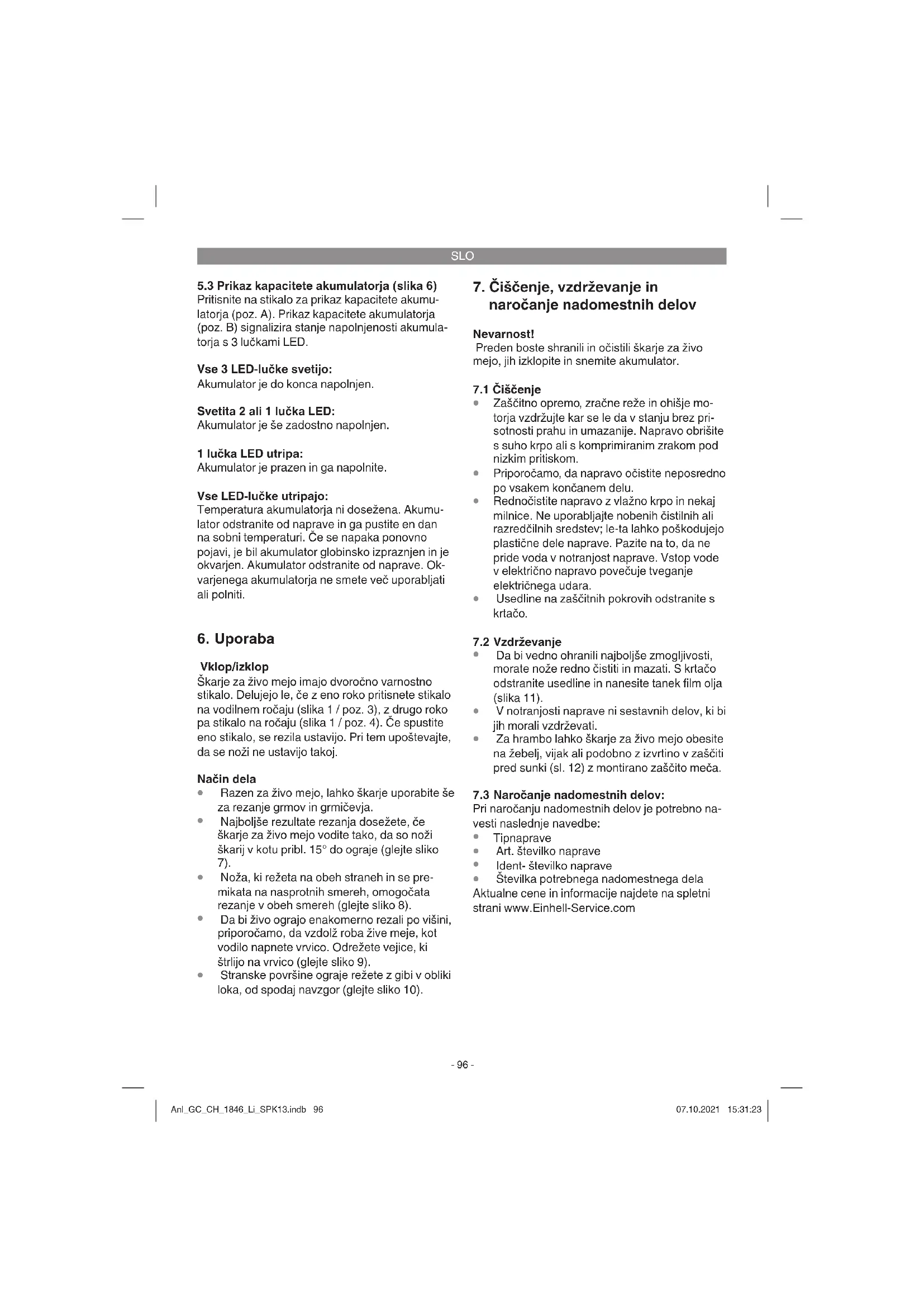in izvijač pošljete naši servisni službi. Za pravilno pošiljanje se obrnite na našo službo za stranke ali prodajno mesto, kjer ste napravo kupili. Pri pošiljanju ali odstranjevanju morate akumulatorje oz. akumulatorske naprave posamično zapakirati v plastične vrečke, da ne prihaja do kratkih stikov in požara! V interesu dolge življenjske dobe baterijskega vložka poskrbite za pravočasno polnjenje bate- rijskega vložka. To je potrebno v vsakem primeru, če opazite, da moč naprave peša. Baterijskega vložka nikoli ne izpraznite popolnoma. S tem poškodujete baterijski vložek! Anl_GC_CH_1846_Li_SPK13.indb 95Anl_GC_CH_1846_Li_SPK13.indb 95 07.10.2021 15:31:2307.10.2021 15:31:23SLO