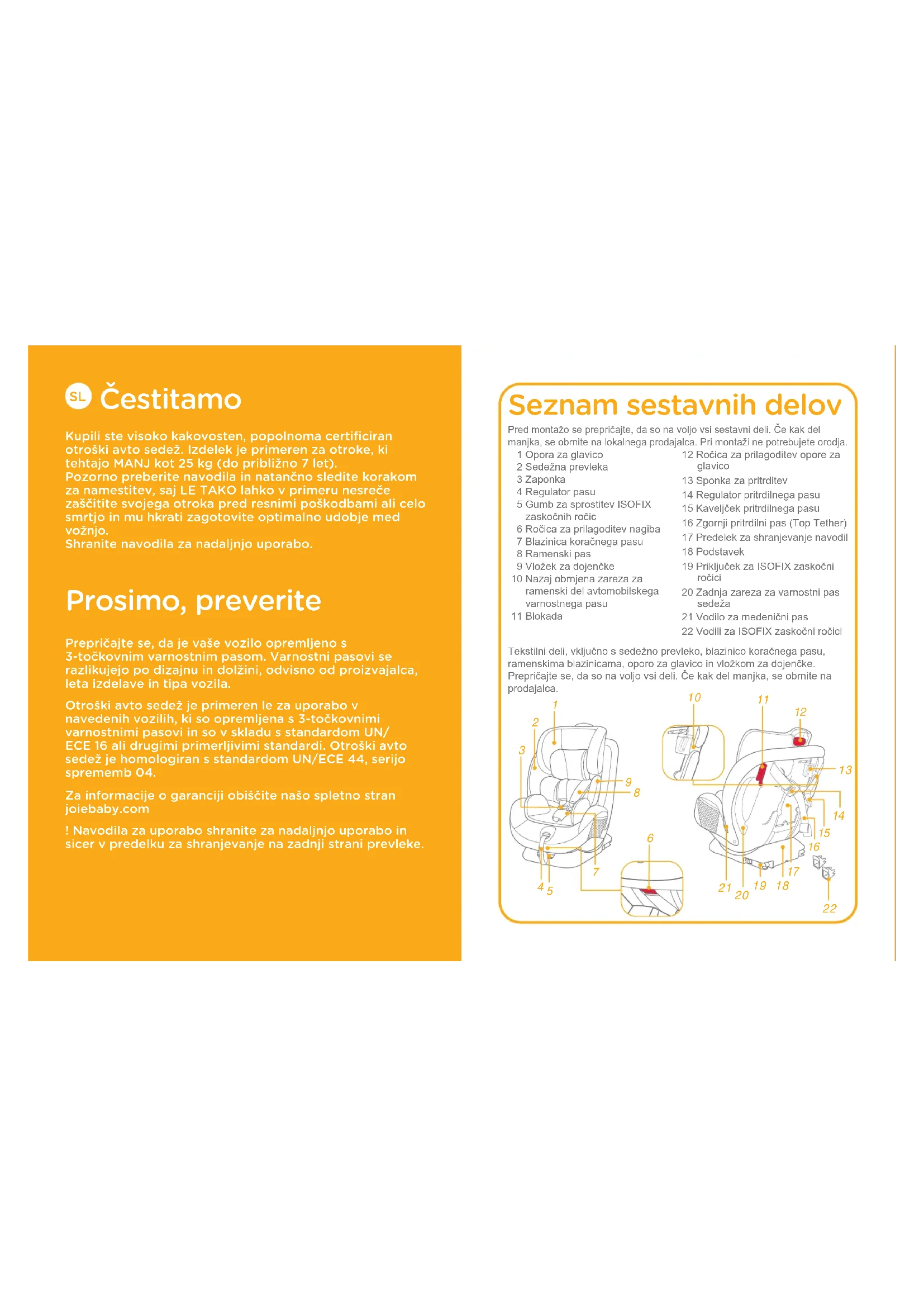 Čestitamo Kupili ste visoko kakovosten﹐ popolnoma certificiran otroški avto sedež. Izdelek je primeren za otroke﹐ ki tehtajo MANJ kot 25 kg (do približno 7 let). Pozorno preberite navodila in natančno sledite korakom za namestitev﹐ saj LE TAKO lahko v primeru nesreče zaščitite svojega otroka pred resnimi poškodbami ali celo smrtjo in mu hkrati zagotovite optimalno udobje med vožnjo. Shranite navodila za nadaljnjo uporabo. Prosimo﹐ preverite Prepričajte se﹐ da je vaše vozilo opremljeno s 3-točkovnim varnostnim pasom. Varnostni pasovi se razlikujejo po dizajnu in dolžini﹐ odvisno od proizvajalca﹐ leta izdelave in tipa vozila. Otroški avto sedež je primeren le za uporabo v navedenih vozilih﹐ ki so opremljena s 3-točkovnimi varnostnimi pasovi in so v skladu s standardom UN/ ECE 16 ali drugimi primerljivimi standardi. Otroški avto sedež je homologiran s standardom UN/ECE 44﹐ serijo sprememb 04. Za informacije o garanciji obiščite našo spletno stran joiebaby.com ! Navodila za uporabo shranite za nadaljnjo uporabo in sicer v predelku za shranjevanje na zadnji strani prevleke.