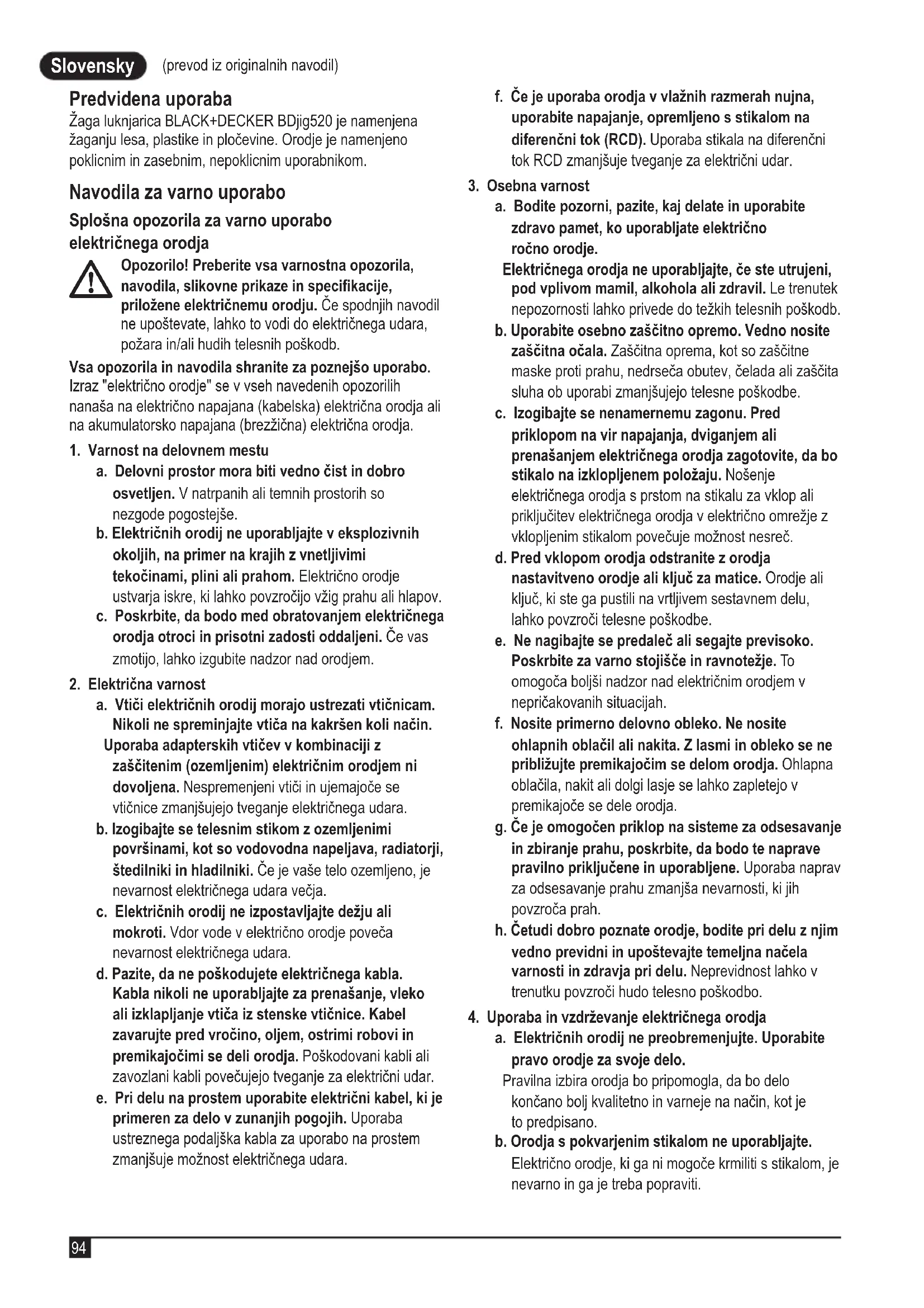 (prevod iz originalnih navodil) Slovensky (prevod iz originalnih navodil) Predvidena uporaba Žaga luknjarica BLACK+DECKER BDjig520 je namenjena žaganju lesa, plastike in pločevine. Orodje je namenjeno poklicnim in zasebnim, nepoklicnim uporabnikom. Navodila za varno uporabo Splošna opozorila za varno uporabo električnega orodja