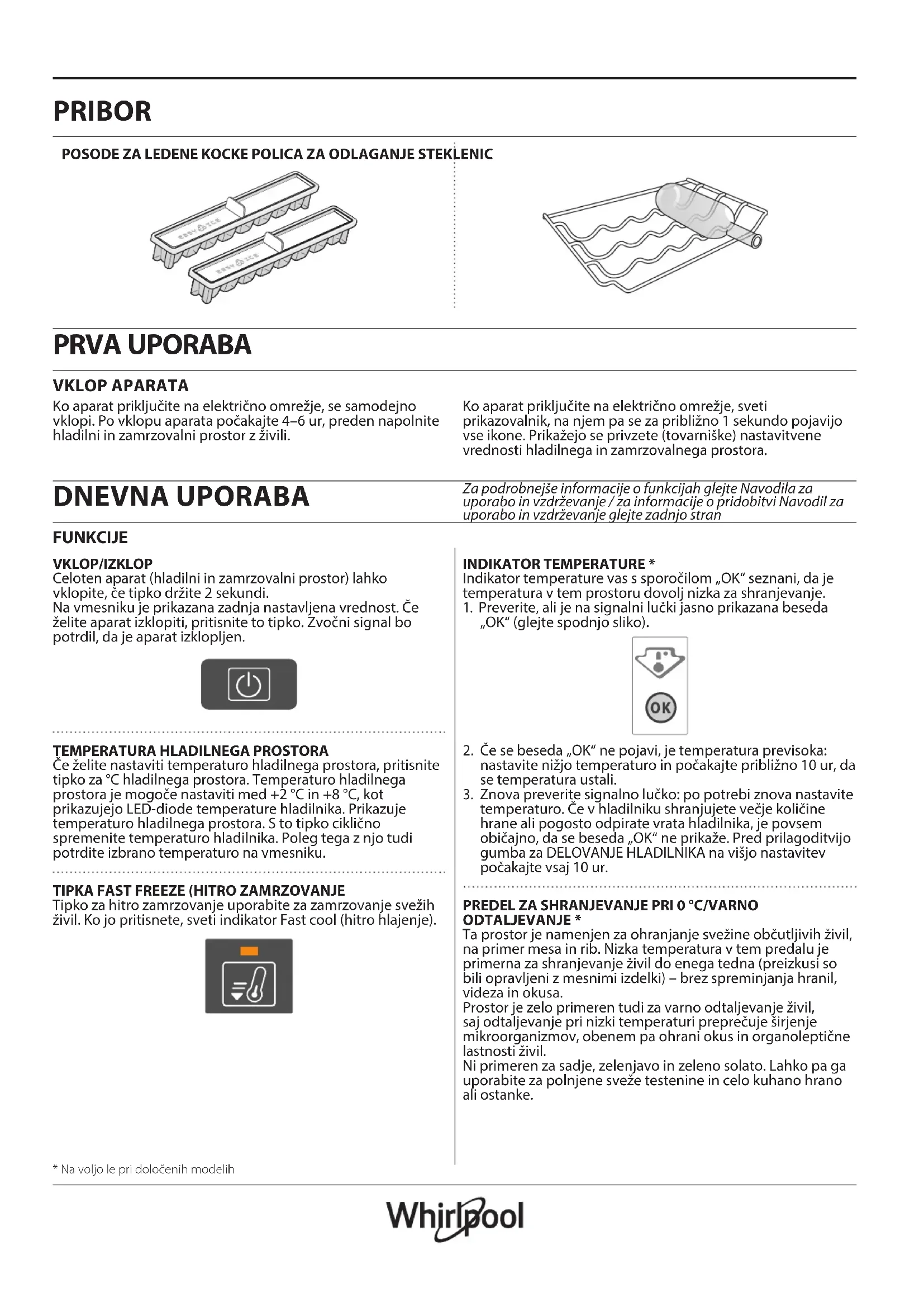 Tipko za hitro zamrzovanje uporabite za zamrzovanje svežih živil. Ko jo pritisnete, sveti indikator Fast cool (hitro hlajenje). INDIKATOR TEMPERATURE* Indikator temperature vas s sporočilom „OK“ seznani, da je temperatura v tem prostoru dovolj nizka za shranjevanje.