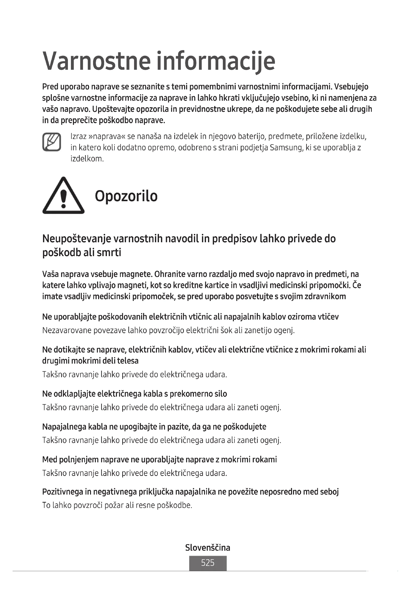 Varnostne informacije Pred uporabo naprave se seznanite s temi pomembnimi varnostnimi informacijami. Vsebujejo splošne varnostne informacije za naprave in lahko hkrati vključujejo vsebino, ki ni namenjena za vašo napravo. Upoštevajte opozorila in previdnostne ukrepe, da ne poškodujete sebe ali drugih in da preprečite poškodbo naprave. Izraz »naprava« se nanaša na izdelek in njegovo baterijo, predmete, priložene izdelku, in katero koli dodatno opremo, odobreno s strani podjetja Samsung, ki se uporablja z izdelkom. Opozorilo Neupoštevanje varnostnih navodil in predpisov lahko privede do poškodb ali smrti Vaša naprava vsebuje magnete. Ohranite varno razdaljo med svojo napravo in predmeti, na katere lahko vplivajo magneti, kot so kreditne kartice in vsadljivi medicinski pripomočki. Če imate vsadljiv medicinski pripomoček, se pred uporabo posvetujte s svojim zdravnikom Ne uporabljajte poškodovanih električnih vtičnic ali napajalnih kablov oziroma vtičev Nezavarovane povezave lahko povzročijo električni šok ali zanetijo ogenj. Ne dotikajte se naprave, električnih kablov, vtičev ali električne vtičnice z mokrimi rokami ali drugimi mokrimi deli telesa Takšno ravnanje lahko privede do električnega udara. Ne odklapljajte električnega kabla s prekomerno silo Takšno ravnanje lahko privede do električnega udara ali zaneti ogenj. Napajalnega kabla ne upogibajte in pazite, da ga ne poškodujete Takšno ravnanje lahko privede do električnega udara ali zaneti ogenj. Med polnjenjem naprave ne uporabljajte naprave z mokrimi rokami Takšno ravnanje lahko privede do električnega udara. Pozitivnega in negativnega priključka napajalnika ne povežite neposredno med seboj To lahko povzroči požar ali resne poškodbe.Slovenščina