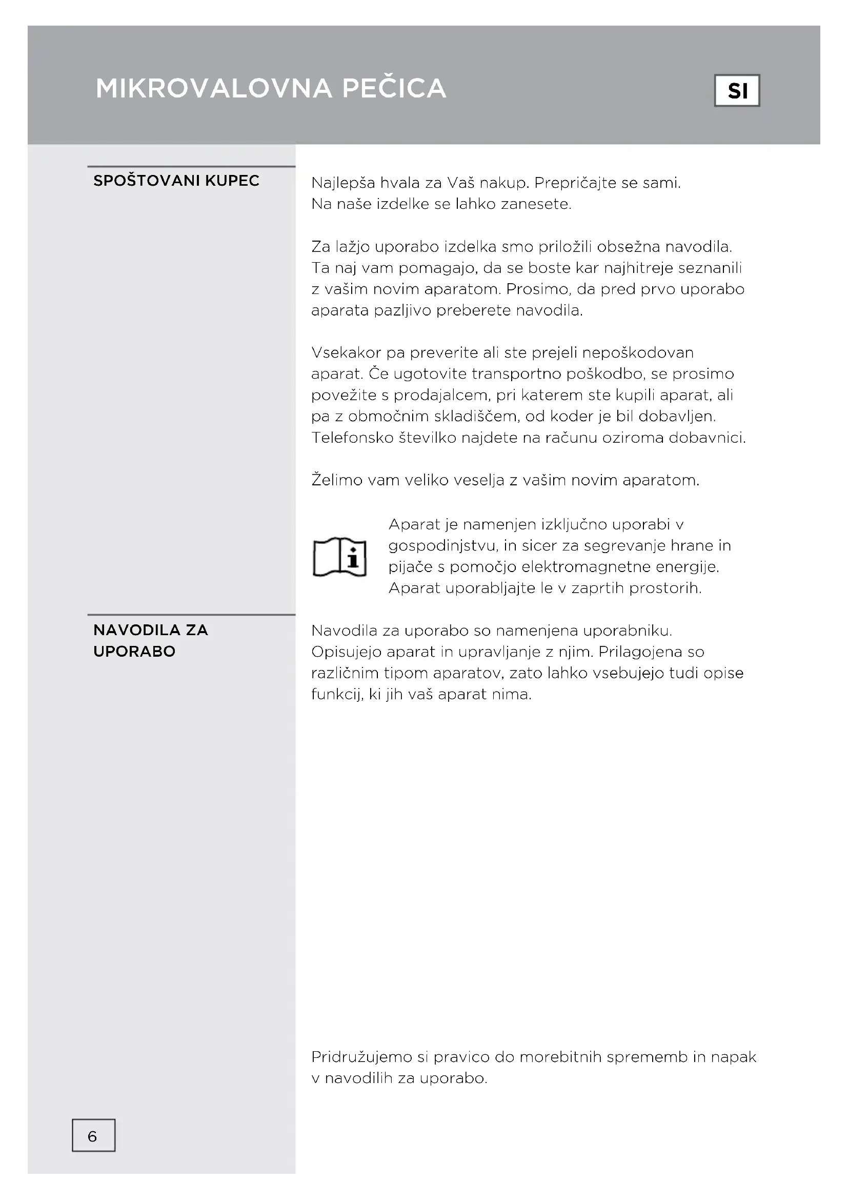 Za informacije ali v primeru težav se obrnite na Gorenjev center za pomoč uporabnikom v vaši državi (telefonsko številko najdete v mednarodnem garancijskem listu). Če v vaši državi takšnega centra ni, se obrnite na lokalnega Gorenjevega prodajalca ali Gorenjev oddelek za male gospodinjske aparate. Do morebitnega neujemanja barvnih nians med različnimi aparati ali sestavnimi elementi znotraj ene design linije lahko prihaja zaradi različnih dejavnikov, kot so npr. različni koti, pod katerimi gledamo aparate, različna barvna ozadja, materiali ter osvetljenost prostora. Samo za osebno uporabo! Dodatna priporočila za pečenje z mikrovalovi ter koristne nasvete najdete na spletni strani: http://www.gorenje.si VELIKO UŽITKA OB UPORABI VAŠE MIKROVALOVNE
