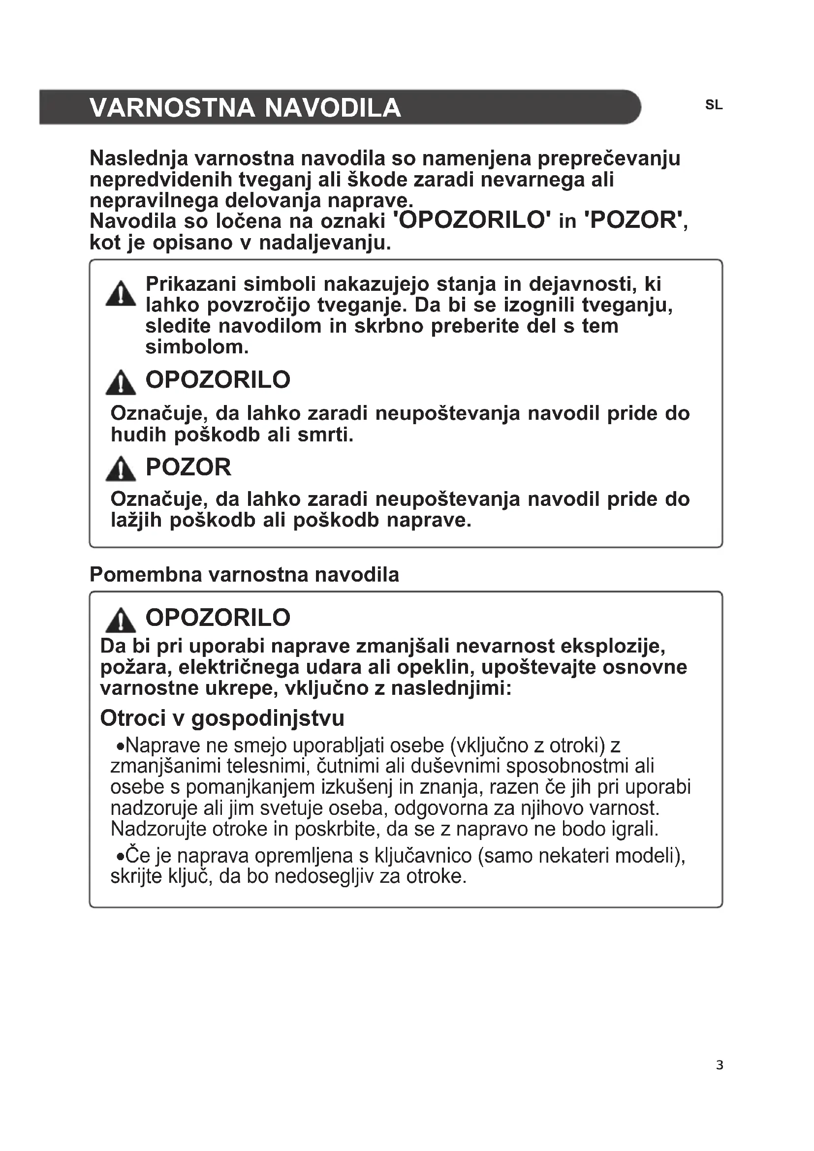 Naslednja varnostna navodila so namenjena preprečevanju nepredvidenih tveganj ali škode zaradi nevarnega ali nepravilnega delovanja naprave. Navodila so ločena na oznaki 'OPOZORILO' in 'POZOR', kot je opisano v nadaljevanju. Prikazani simboli nakazujejo stanja in dejavnosti, ki lahko povzročijo tveganje. Da bi se izognili tveganju, sledite navodilom in skrbno preberite del s tem simbolom. OPOZORILO Označuje, da lahko zaradi neupoštevanja navodil pride do hudih poškodb ali smrti. POZOR Označuje, da lahko zaradi neupoštevanja navodil pride do lažjih poškodb ali poškodb naprave. Pomembna varnostna navodila OPOZORILO Da bi pri uporabi naprave zmanjšali nevarnost eksplozije, požara, električnega udara ali opeklin, upoštevajte osnovne varnostne ukrepe, vključno z naslednjimi: Otroci v gospodinjstvu