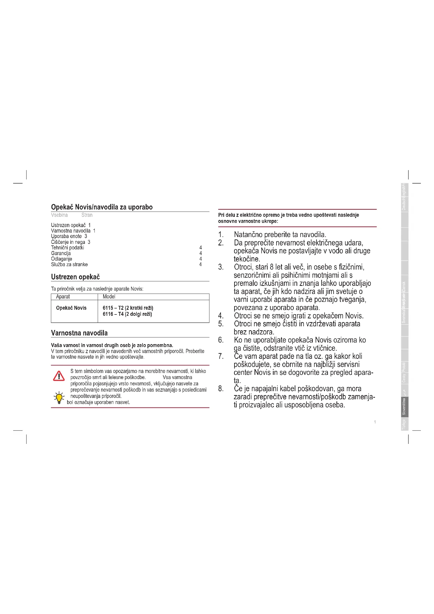 Opekač Novis/navodila za uporabo Vsebina Stran Ustrezen opekač 1 Varnostna navodila 1 Uporaba enote 3 Čiščenje in nega 3 Tehnični podatki 4 Garancija 4 Odlaganje 4 Služba za stranke 4 Ustrezen opekač Ta priročnik velja za naslednje aparate Novis: Aparat Model Opekač Novis 6115 – T2 (2 kratki reži) 6116 – T4 (2 dolgi reži) Varnostna navodila Vaša varnost in varnost drugih oseb je zelo pomembna. V tem priročniku z navodili je navedenih več varnostnih priporočil. Preberite te varnostne nasvete in jih vedno upoštevajte. S tem simbolom vas opozarjamo na morebitne nevarnosti, ki lahko povzročijo smrt ali telesne poškodbe. Vsa varnostna priporočila pojasnjujejo vrsto nevarnosti, vključujejo nasvete za preprečevanje nevarnosti poškodb in vas seznanjajo s posledicami neupoštevanja priporočil. Ta simbol označuje uporaben nasvet. Pri delu z električno opremo je treba vedno upoštevati naslednje osnovne varnostne ukrepe: