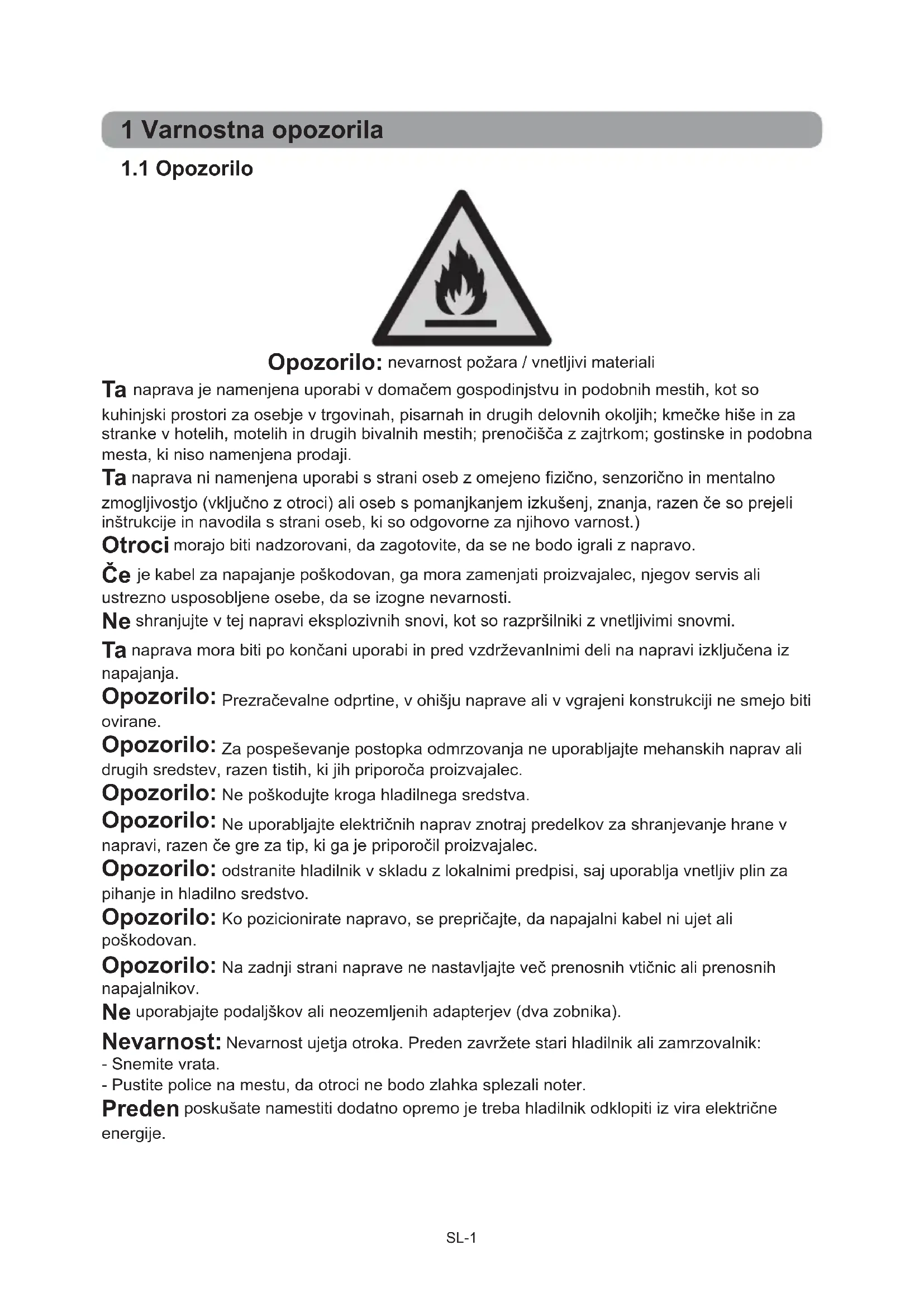 DRAGA STRANKA: Hvala, da ste kupili ta hladilnik. Če želite zagotoviti, da z novim hladilnikom dosežete najboljše rezultate, si vzemite čas in preberite enostavna navodila v tej knjižici. Poskrbite, da bo embalažni material odstranjen v skladu z veljavnimi okoljskimi zahtevami. Pri odstranjevanju opreme hladilnika se obrnite na lokalno službo za odstranjevanje odpadkov, ki vam bo svetovala glede varnega odstranjevanja. Ta naprava se mora uporabljati samo za namen, ki je predviden.SL-1 1 Varnostna opozorila