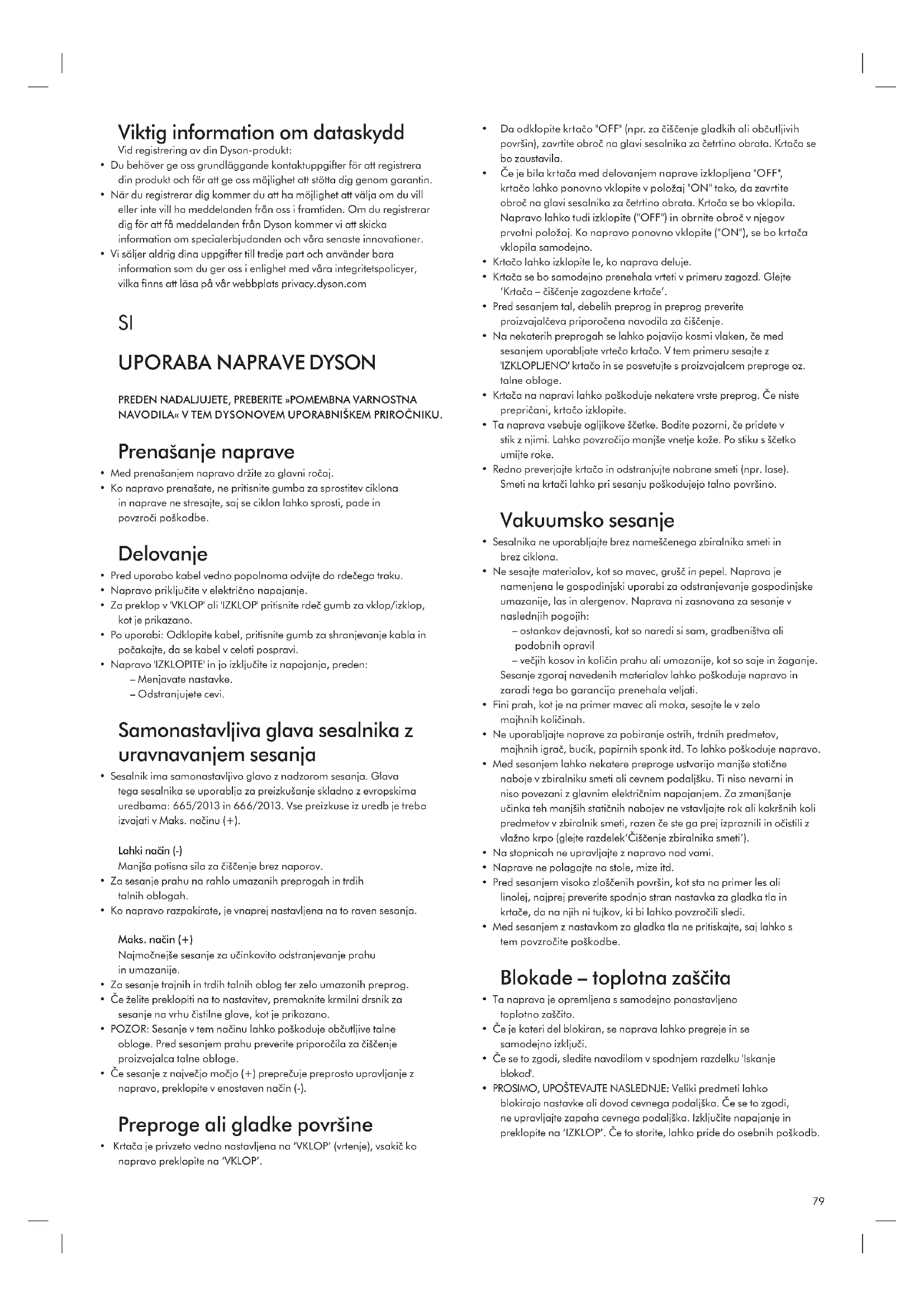 - Garancija zagotavlja ugodnosti, ki dopolnjujejo vaše zakonite potrošniške pravice in ne vplivajo nanje, veljajo pa ne glede na to, ali ste izdelek kupili neposredno pri družbi Dyson ali pri tretji osebi. Informacije o zaščiti pomembnih podatkov Pri registraciji izdelka Dyson: