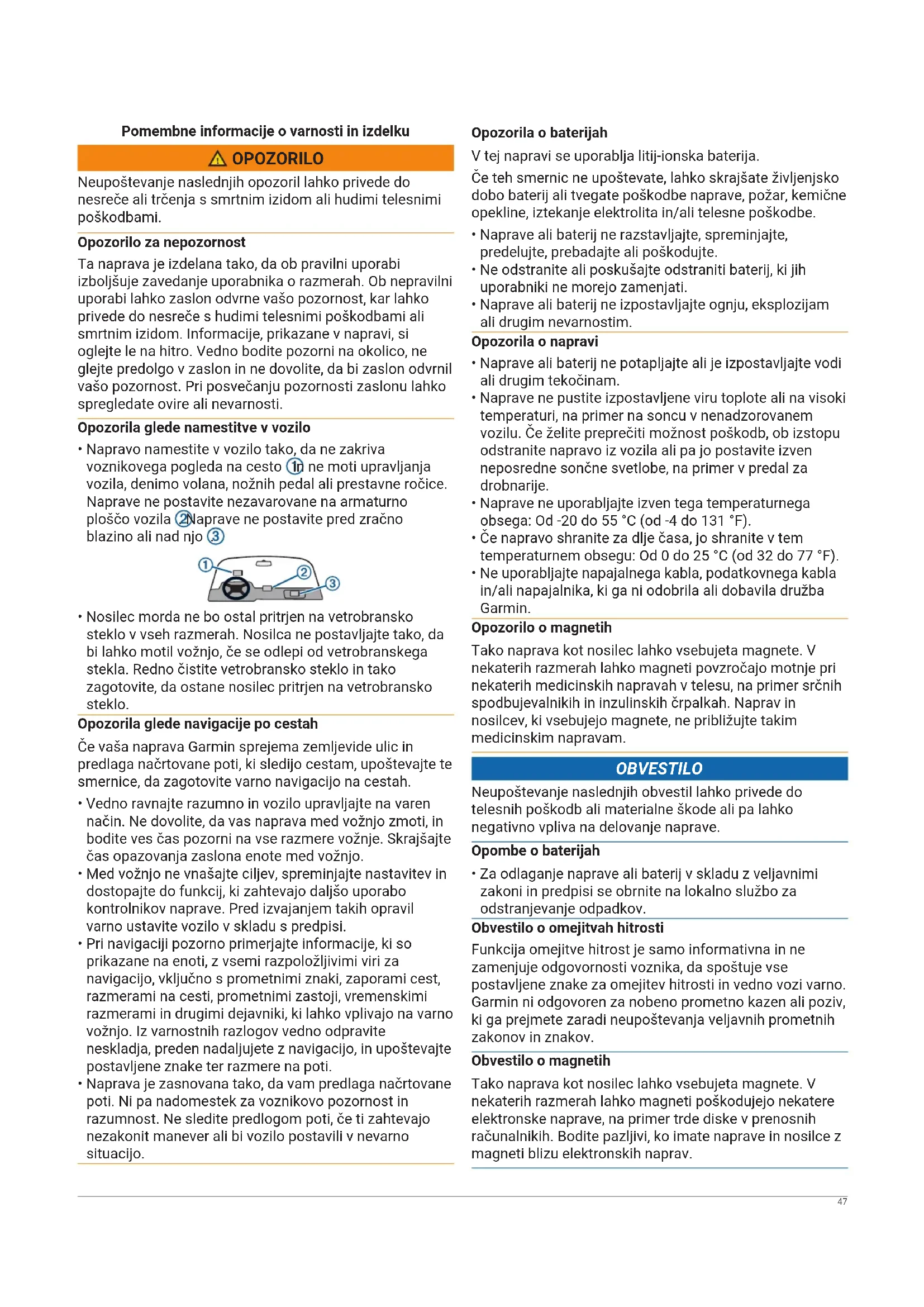 - Za odlaganje naprave ali baterij v skladu z veljavnimi zakoni in predpisi se obrnite na lokalno službo za odstranjevanje odpadkov. Obvestilo o omejitvah hitrosti Funkcija omejitve hitrost je samo informativna in ne zamenjuje odgovornosti voznika, da spoštuje vse postavljene znake za omejitev hitrosti in vedno vozi varno. Garmin ni odgovoren za nobeno prometno kazen ali poziv, ki ga prejmete zaradi neupoštevanja veljavnih prometnih zakonov in znakov. Obvestilo o magnetih Tako naprava kot nosilec lahko vsebujeta magnete. V nekaterih razmerah lahko magneti poškodujejo nekatere elektronske naprave, na primer trde diske v prenosnih računalnikih. Bodite pazljivi, ko imate naprave in nosilce z magneti blizu elektronskih naprav. 47Obvestilo o sistemu GPS Navigacijska naprava lahko deluje slabše, če jo uporabljate v bližini katere koli naprave, ki uporablja zemeljsko širokopasovno omrežje, ki je blizu frekvencam, ki jih uporablja kateri koli globalni navigacijski satelitski sistem (GNSS), na primer globalna storitev za določanje položaja (GPS). Uporaba takih naprav lahko moti prejemanje signalov GNSS. Okoljski programi za izdelke Informacije o programih družbe Garmin za recikliranje izdelkov in programih WEEE, RoHS, REACH ter drugih programih za skladnost si lahko ogledate na www.garmin.com/aboutGarmin/environment. Izjava o skladnosti Družba Garmin izjavlja, da je ta izdelek v skladu z Direktivo 2014/53/EU. Celotno besedilo izjave EU o skladnosti je na voljo na naslednjem spletnem naslovu: www.garmin.com/compliance. Informacije o podatkih zemljevida Garmin uporablja kombinacijo vladnih in zasebnih podatkovnih virov. Skoraj vsi podatkovni viri do neke mere vsebujejo netočne ali nepopolne podatke. V nekaterih državah zemljepisni podatki niso na voljo ali pa so nedopustno dragi. Omejeno jamstvo TO OMEJENO JAMSTVO VAM DODELJUJE DOLOČENE ZAKONSKE PRAVICE, POLEG TEGA PA IMATE MORDA TUDI DRUGE ZAKONSKE PRAVICE, KI SO ODVISNE OD ZVEZNE DRŽAVE (ALI DRŽAVE ALI POKRAJINE). DRUŽBA GARMIN NE IZKLJUČUJE, OMEJUJE ALI ODVZEMA DRUGIH ZAKONSKIH PRAVIC, KI JIH MORDA IMATE V SKLADU Z ZAKONODAJO SVOJE ZVEZNE DRŽAVE (ALI DRŽAVE ALI POKRAJINE). ZA POPOLNO RAZUMEVANJE