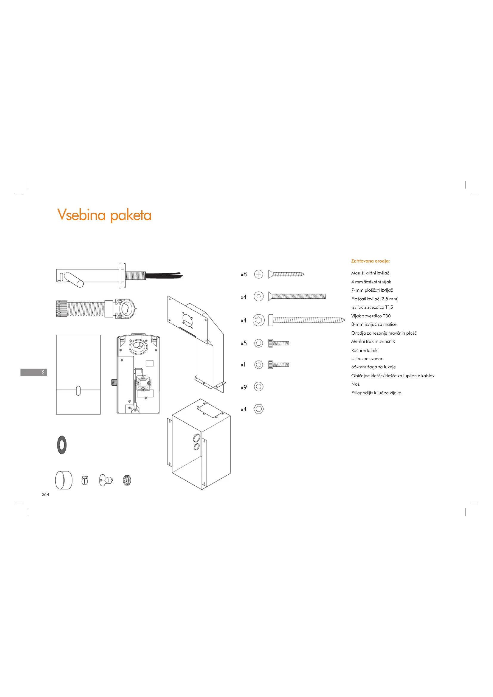 Vsebina paketa Zahtevana orodja: Manjši križni izvijač 4 mm šestkotni vijak 7-mm ploščati izvijač Ploščati izvijač (2,5 mm) Izvijač z zvezdico T15 Vijak z zvezdico T30 8-mm izvijač za matice Orodja za rezanje mavčnih plošč Merilni trak in svinčnik Ročni vrtalnik Ustrezen sveder 65-mm žaga za luknje Običajne klešče/klešče za lupljenje kablov Nož Prilagodljiv ključ za vijake