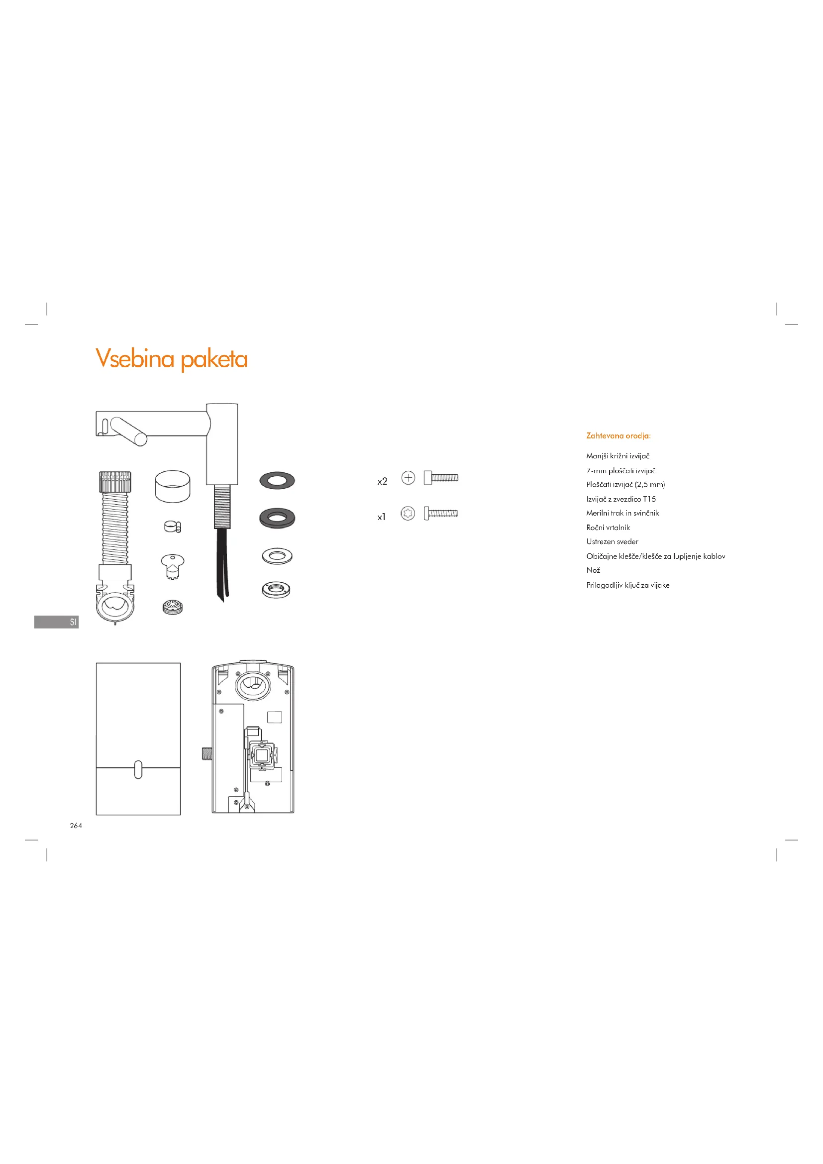Vsebina paketa Zahtevana orodja: Manjši križni izvijač 7-mm ploščati izvijač Ploščati izvijač (2,5 mm) Izvijač z zvezdico T15 Merilni trak in svinčnik Ročni vrtalnik Ustrezen sveder Običajne klešče/klešče za lupljenje kablov Nož Prilagodljiv ključ za vijake
