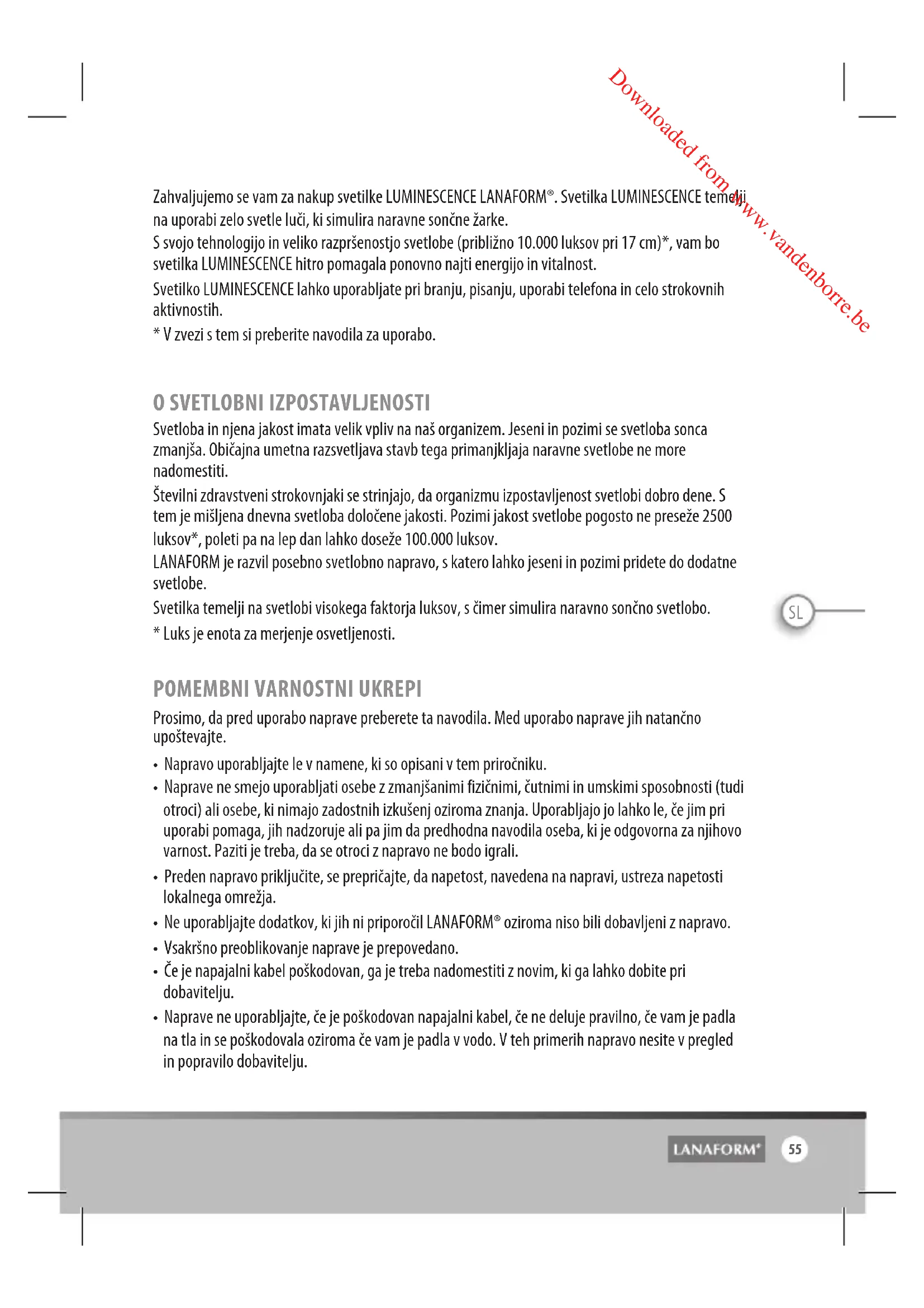 Downloaded from www.vandenborre.beSL Zahvaljujemo se vam za nakup svetilke LUMINESCENCE LANAFORM®. Svetilka LUMINESCENCE temelji na uporabi zelo svetle luči, ki simulira naravne sončne žarke. S svojo tehnologijo in veliko razpršenostjo svetlobe (približno 10.000 luksov pri 17 cm)*, vam bo svetilka LUMINESCENCE hitro pomagala ponovno najti energijo in vitalnost. Svetilko LUMINESCENCE lahko uporabljate pri branju, pisanju, uporabi telefona in celo strokovnih aktivnostih.